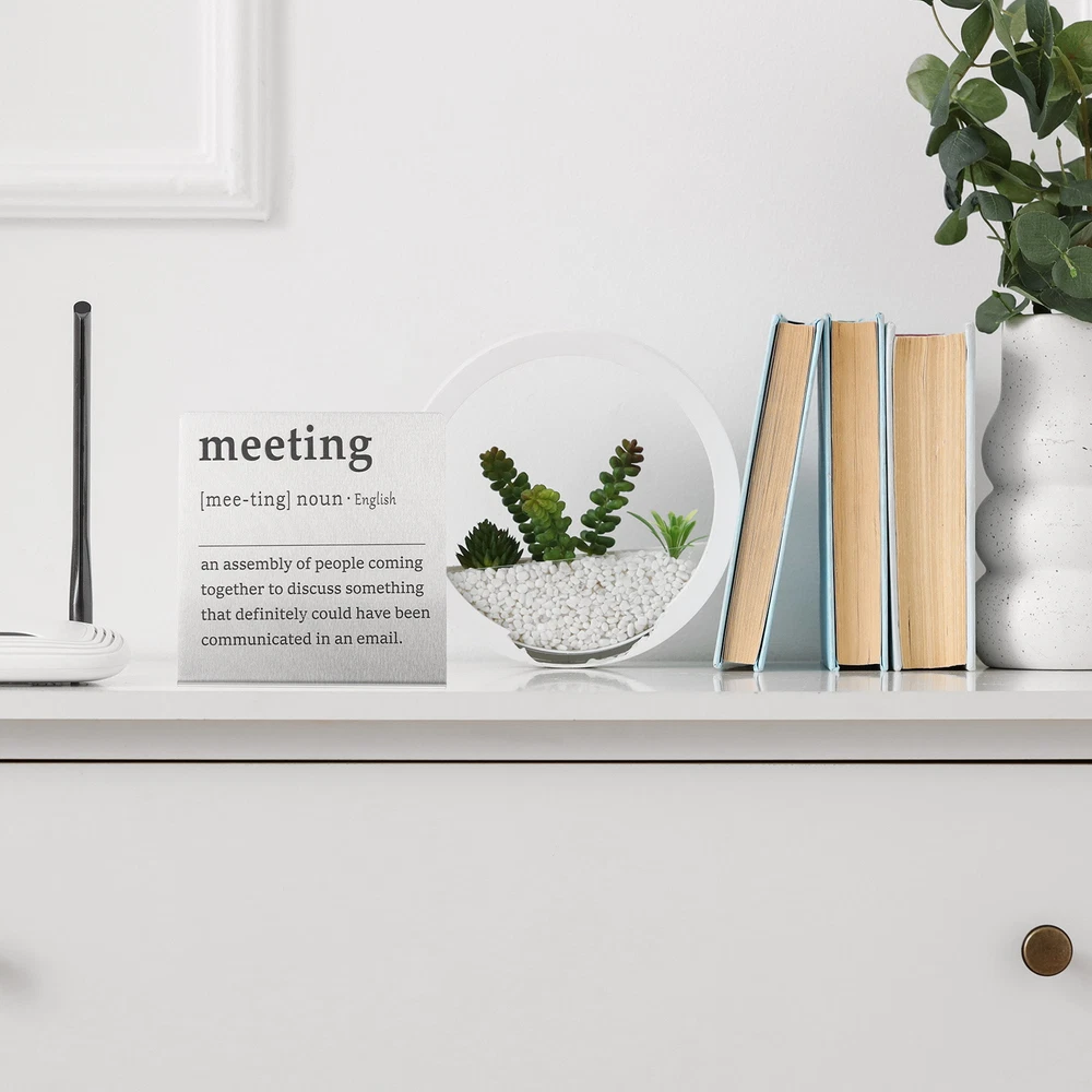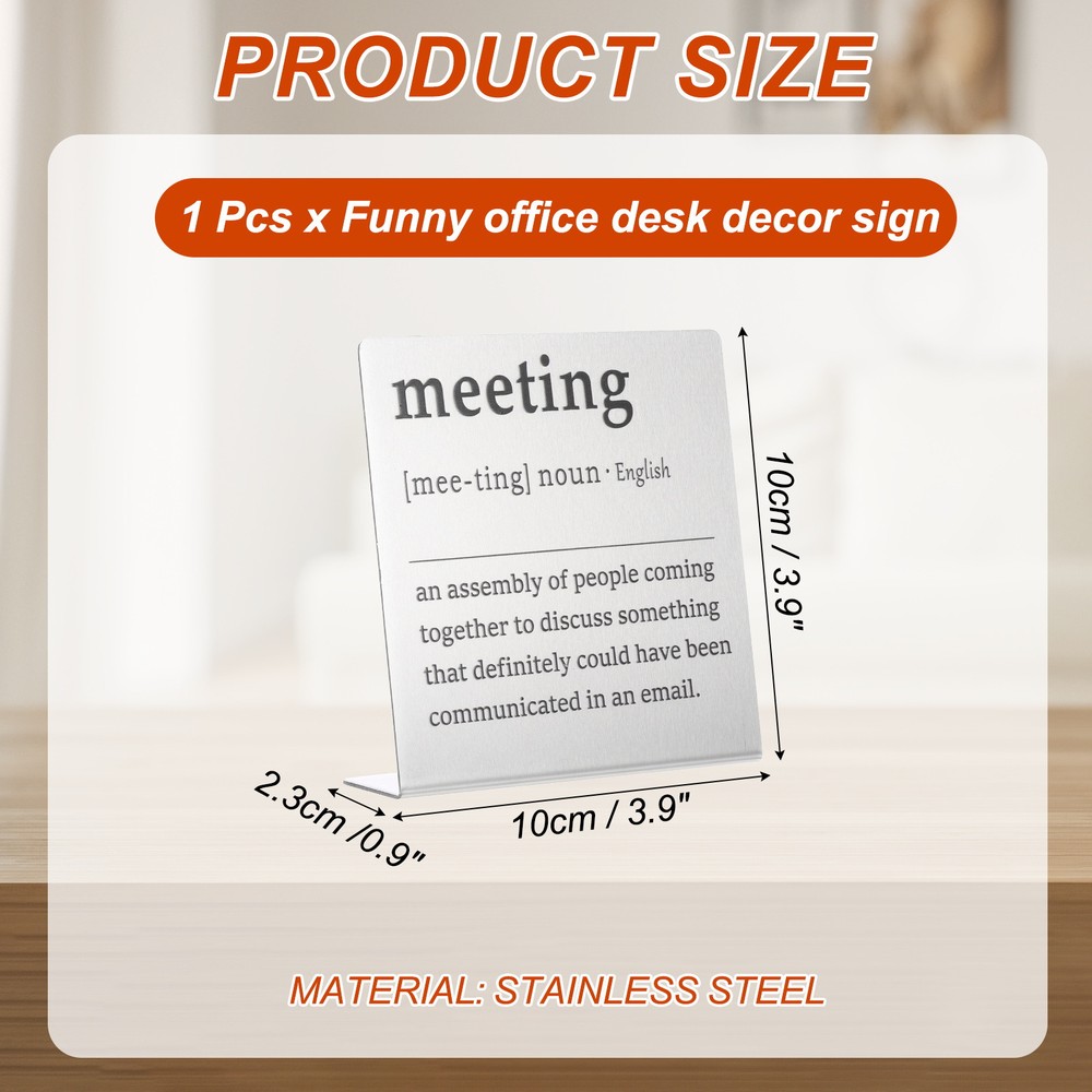 Document MULTIPURPOSE - Funny desk decoration signs use humorous sentences to inspire smile and liven up the office atmosphere, bringing personality and fun to any workspace. Perfect for birthdays, events, home, and office decorationWHAT YOU GET - 1 x Funny office desk decor sign. And their sizes are: 10cm x 2.3cm x 10cm / 3.9inch x 0.9inch x 3.9inch(L*W*H); Material: Stainless steel; Color: Silver; Style: meetingRELIABLE MATERIAL - The funny desk decoration sign is made of stainless steel, which is strong and not easy to deform, waterproof and rust-proof, and durable. It is small in size and easy to place or move on the desk, and it does not take up too much space. The interesting title content has both decorative effects and brings fun.WIDELY USED - Funny office desk decor sign has a wide range of applications. It can be placed on the desk to decorate and bring fun to busy coworkers. It can be placed on bookshelves and wall cabinets to decorate the corners of the home. It can also be given to friends, colleague as interesting gifts.KINDLY NOTE - Please pay attention to the style and size of the title before purchasing Funny Desk Sign, Funny Nameplate, Silver (meeting) MULTIPURPOSE - Funny desk decoration signs use humorous sentences to inspire smile and liven up the office atmosphere, bringing personality and fun to any workspace. Perfect for birthdays, events, home, and office decoration WHAT YOU GET - 1 x Funny office desk decor sign. And their sizes are: 10cm x 2.3cm x 10cm / 3.9inch x 0.9inch x 3.9inch(L*W*H); Material: Stainless steel; Color: Silver; Style: meeting RELIABLE MATERIAL - The funny desk decoration sign is made of stainless steel, which is strong and not easy to deform, waterproof and rust-proof, and durable. It is small in size and easy to place or move on the desk, and it does not take up too much space. The interesting title content has both decorative effects and brings fun. WIDELY USED - Funny office desk decor sign has a wide range of applications. It can be placed on the desk to decorate and bring fun to busy coworkers. It can be placed on bookshelves and wall cabinets to decorate the corners of the home. It can also be given to friends, colleague as interesting gifts. KINDLY NOTE - Please pay attention to the style and size of the title before purchasing Hot Item Payment 1.We accept eBay payment . 2.Payment must be received within 7 business days of auction closing. Shipping 1.We ship to your eBay or Paypal address. Please make sure your eBay and Paypal address is correct before you pay. 2.Items will be shipped within 1-3 business day when we received payment. 3.Delivery time depends on destination and other factors. Description Policy Funny Desk Sign, Funny Nameplate, Silver (meeting) MULTIPURPOSE - Funny desk decoration signs use humorous sentences to inspire smile and liven up the office atmosphere, bringing personality and fun to any workspace. Perfect for birthdays, events, home, and office decoration WHAT YOU GET - 1 x Funny office desk decor sign. And their sizes are: 10cm x 2.3cm x 10cm / 3.9inch x 0.9inch x 3.9inch(L*W*H); Material: Stainless steel; Color: Silver; Style: meeting RELIABLE MATERIAL - The funny desk decoration sign is made of stainless steel, which is strong and not easy to deform, waterproof and rust-proof, and durable. It is small in size and easy to place or move on the desk, and it does not take up too much space. The interesting title content has both decorative effects and brings fun. WIDELY USED - Funny office desk decor sign has a wide range of applications. It can be placed on the desk to decorate and bring fun to busy coworkers. It can be placed on bookshelves and wall cabinets to decorate the corners of the home. It can also be given to friends, colleague as interesting gifts. KINDLY NOTE - Please pay attention to the style and size of the title before purchasing Hot Item Payment 1.We accept eBay payment . 2.Payment must be received within 7 business days of auction closing. Shipping 1.We ship to your eBay or Paypal address. Please make sure your eBay and Paypal address is correct before you pay. 2.Items will be shipped within 1-3 business day when we received payment. 3.Delivery time depends on destination and other factors.