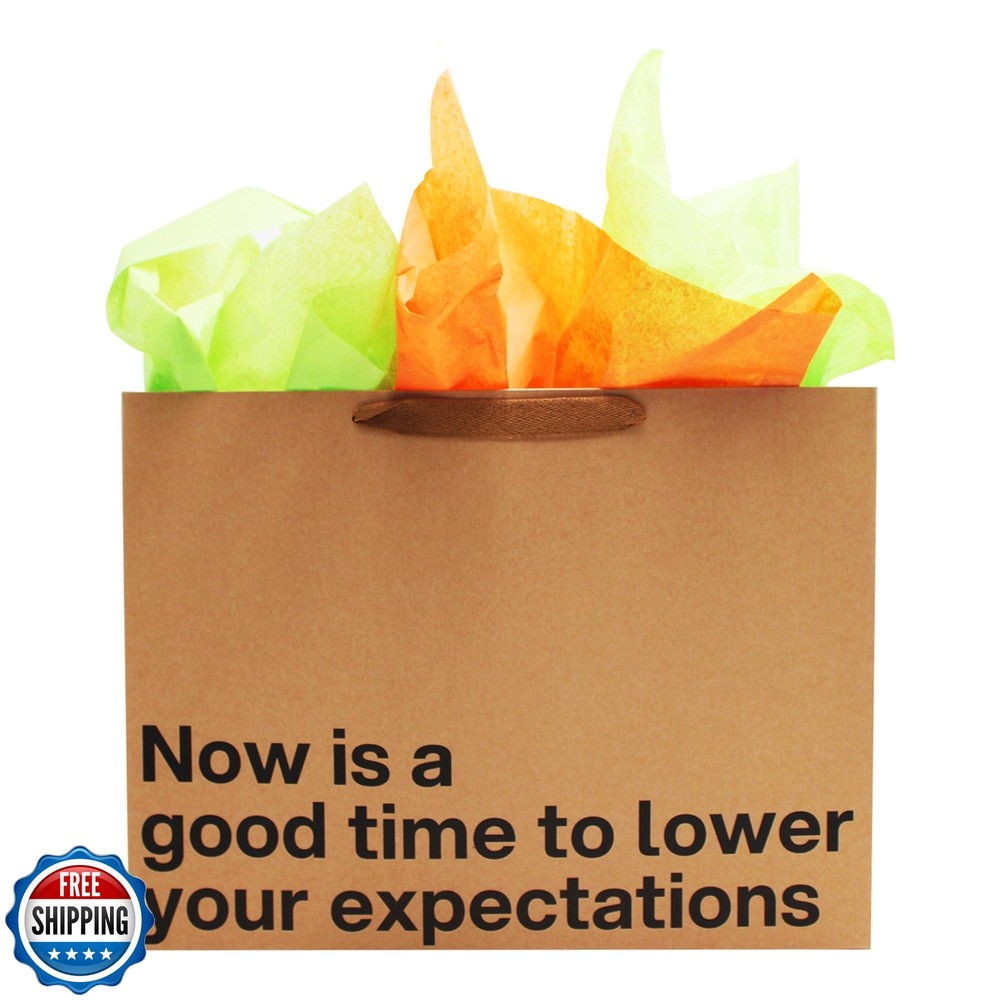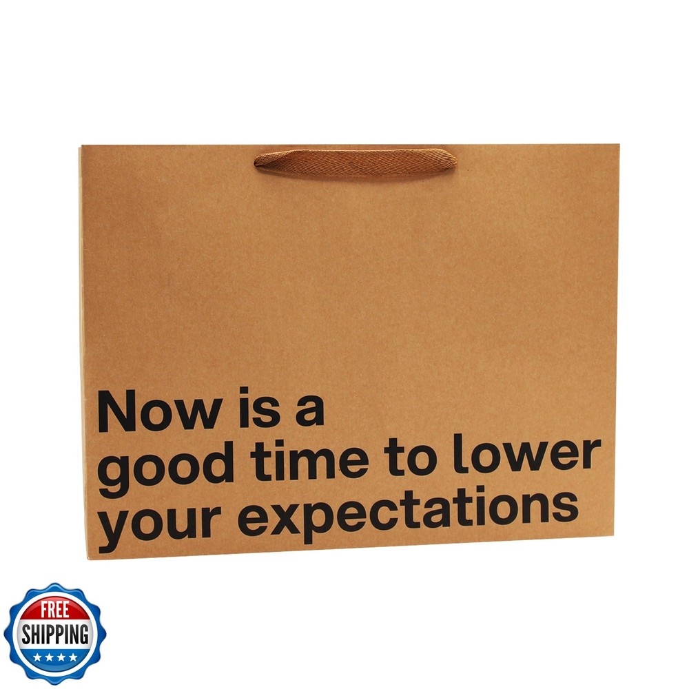 Funny Large Gift Bag β 16 x 6 x 12 inch Kraft Gift Bags with Snarky Sayings βNow Is A Good Time To Lower Your Expectationsβ - Reusable, Eco-Friendly Gag Gift Wrapping for Birthdays, Holidays - 1 Piece Features πππππππππ πππππππππ ππππππ: The bold βNow Is A Good Time To Lower Your Expectationsβ print instantly sets a snarky, playful tone. This funny gift bag like giving your gift its own built-in sarcastic gift wrap, is sure to get a laugh before the present is even opened. πππππ & πππππππππ: This gift wrap measures 16 x 6 x 12 inches. Generously sized to hold clothing, books, or other medium-sized gifts with ease. No gift is too awkward β this gag gift bag has room to spare (even for extra jokes). From birthday surprises to gag gifts, its spacious design fits any celebration where humor is welcome. πππ-π πππππππ & ππππππππ: Go green while being funny. This reusable kraft gift bag is an eco-friendly gift wrap alternative to wasteful paper β made from 100% recyclable kraft paper. Use this funny gift bag over and over, or recycle it when youβre done, for guilt-free gifting with a side of sarcasm. ππππππ ππππ π ππππππππππππ: Thick, premium kraft paper and durable handles make this funny birthday gift bag impressively strong. No more flimsy wrapping: it safely supports heavier or odd-shaped gifts without tearing, so your surprise stays secure ππππ & πππππ ππππππ: Features the phrase βNow Is A Good Time To Lower Your Expectationsβ printed in big, bold black letters. This playful, sarcastic message turns a simple bag into a funny gift bag that gets everyone laughing before they even see the gift inside. Shipping Free & Fast Shipping: We offer free shipping to most of the USA with a normal delivery time of 3-7 days. However, due to the current situation, additional delivery time (up to 3 weeks) may be required for some items. Alternative Carriers: We may use alternative carriers (e.g., USPS, FedEx, UPS) to ensure your package arrives safely and on time. Due to the use of multiple carriers, we are unable to provide a tracking number automatically. Handling Time: Orders are processed and shipped within 1-2 business days of receiving cleared payment. Shipping Restrictions: Shipping to Alaska, Hawaii, Puerto Rico, Guam, and other US territories may incur shipping charges or delivery restrictions. Please contact us before ordering, or your order can be refunded/cancelled. State Restrictions: Certain items may not be shipped to California due to state regulations. Contact for Tracking Updates: If you require tracking updates or have any concerns about the delivery of your order, please feel free to contact us, and we will be happy to assist you. Return Policy 30-Day Hassle-Free Returns: If you are not completely satisfied with your purchase, you can return the item for free within 30 days of receiving it for a full refund or exchange. Easy Return Process: Contact us, and we will provide you with a prepaid return shipping label and detailed instructions. No Restocking Fee: There are no restocking fees for returns. However, the buyer is responsible for return shipping costs if the return is not due to a seller"s error. Refund Processing: Refunds will be processed within 1 business day of receiving the returned item in its original condition. Feedback Your feedback is extremely important to us. We strive to provide the best products and customer service possible. If you are satisfied with your purchase, please take a moment to leave us a positive review. If you have any concerns or issues with your order, please contact us before leaving negative feedback. We are committed to resolving any problems and ensuring your satisfaction. Contact Us If you have any questions or concerns, please feel free to reach out to our customer support team. You can contact us through the eBay messaging system. We are available Monday to Friday, 9:00 am to 5:00 pm EST, and we will do our best to respond to your inquiry within 24 hours. Thank you for supporting our small family business!
