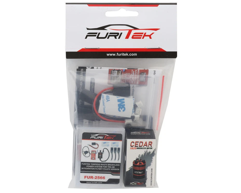 Brushless Combo Overview: Furitek Torpedo RXGT5 Brushless Power System for Traxxas TRX-4M. The Torpedo RXGT5 Brushless Power System is a high-performance upgrade designed specifically for Traxxas TRX-4M, 1/24, and 1/18 micro crawlers. Using Furitek's advanced Field-Oriented Control (FOC) technology, this power system delivers precise and buttery-smooth control. Compatible with both Sensorless brushless and brushed DC motors, this system is engineered to elevate your micro crawler's performance with its lightweight and compact design. The Torpedo RXGT5 Brushless Power System offers easy programming through its built-in wireless capability, ensuring seamless control. Its durable, water and dustproof CNC aluminum case, along with a powerful, switchable HV BEC, guarantees reliability in any terrain. The Cedar Inrunner Brushless Motor with 11T Steel Pinion for Traxxas TRX-4M is a top-tier upgrade, offering unmatched efficiency and performance in a compact, waterproof, and dustproof design. Featuring a specially engineered 12-pole Inrunner configuration, this motor delivers exceptional torque and control, making it ideal for slow-speed crawling while still providing high-speed capabilities when needed. Its precision-balanced rotor, combined with high-purity copper windings and ultra-thin 0.2mm stator laminations, ensures maximum energy conversion and minimizes heat loss. Encased in CNC-machined 6061 T6 billet aluminum, the motor not only dissipates heat effectively but also features a sleek, anodized red and black finish that adds to its durability and style. The inclusion of high RPM ABEC5 bearings and a perfectly fitting 11T steel pinion gear ensures smooth, reliable operation on TRX-4M platforms. With the added convenience of easy installation in tight spaces and the resilience to handle rugged terrains, the Cedar motor is the ultimate power solution for serious crawling enthusiasts. Features: The ultimate upgrade for 1/24 & 1/18 micro crawlers Support Sensorless brushless and brushed DC motors (Default is brushless) FOC (Field-oriented control) technology Buttery smooth control Built-in powerful up to 8.4V HV switchable BEC Super compact and lightweight design Pressed steel pinion gear specially for TRX-4M platforms Super easy programming via built-in wireless Compatible with FLYSKY FS-GT5 & Radio Master MT12 4-in-1 protocols Water and dustproof design with a CNC aluminum case Specifications: ESC: Applications: 1/24 & 1/18 Crawlers Type: Brushless - Sensorless Input Voltage: 2S-3S LiPo (7.4-11.1V) LiPo BEC: 5.5-8.4V Switchable Current: Continuous: 40A Peak: 70A Dimension (LxWxH): 0.75x1.45x0.6in. (19x37x15mm) Weight: 19g (0.67oz) Motor: Motor Type: Inrunner KV: 3456kV Pole: 12-Pole Resistance: 0.17Ohm LiPo: 2-3S Size: 0.7x1in. (18x25mm) Weight: 20g (0.7oz) Application: 1/24 & 1/18 Crawlers Includes: (1) Python RXGT5 ESC/Receiver Unit (1) Cedar Motor for TRX-4M (1) JST-RCY TO 2-Pin JST-PH Cable (1) Servo Extension cable (1) Water-proof power switch About Us | View Store