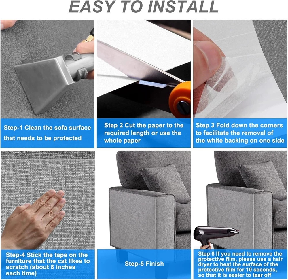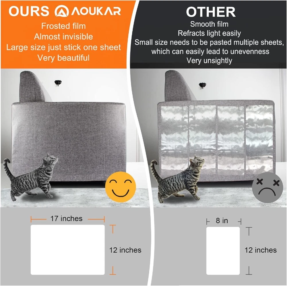 Furniture Protectors from Cats Couch Corner Protector for anti Cat Scratch Furn About this item: Large area coverage: 12PCS 12" x 19", this cat scratch deterrent furniture protector pasted in any corner of the sofa;This anti scratch cat tape can also be cut into any shape and size to meet the use of all furniture. Ultra-thin forsting: The frosted surface of the product will not reflect glare under bright light,thickness is only 0.15mm, adhered to the surface of the furniture, fully integrated into the interior decoration style.This cat scratch protector will not be teared Easy install: Very easy to install, no complex steps nor tools.1:Peel off the self-adhesive pad 2: stick the pad where you want to protect (Can bend around the contour of the furniture).You can cut them to size if needed as well. The biggest area covered on the market------NOTE------Please purchase our brand Aoukar, we only provide quality products Flexible durable : Our furniture guards for cats made of Non-Toxic clear vinyl, It’s durable and thick enough to deter cat scratching also flexible enough to bend around the contours of your furniture to stop cat claws from shredding couch Quality and satisfaction guaranteed: We are deeply committed to providing a superior shopping experience to our customers. Our professional customer service representatives are ready to assist you with any questions you may have