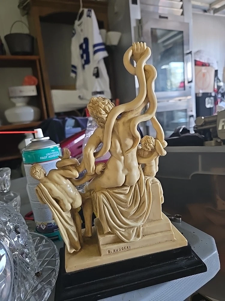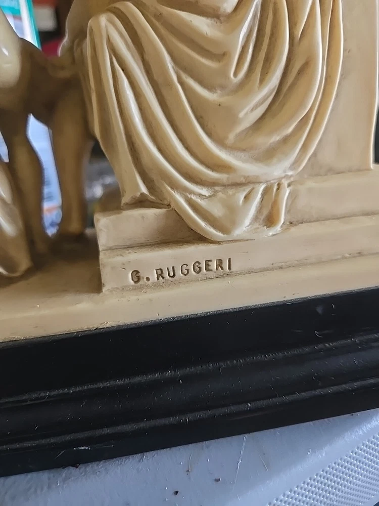 This is a vintage Italian sculpture by G. Ruggeri depicting Hercules on a marble base. The statue stands 11 inches tall and is carved from resin, showcasing a classical style with intricate details. It is signed by the artist and features a small size, making it a unique piece of art with a theme of Greek mythology. The craftsmanship and production technique reflect the artistry and skill of Italian sculpture.