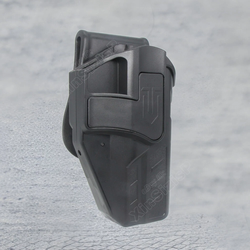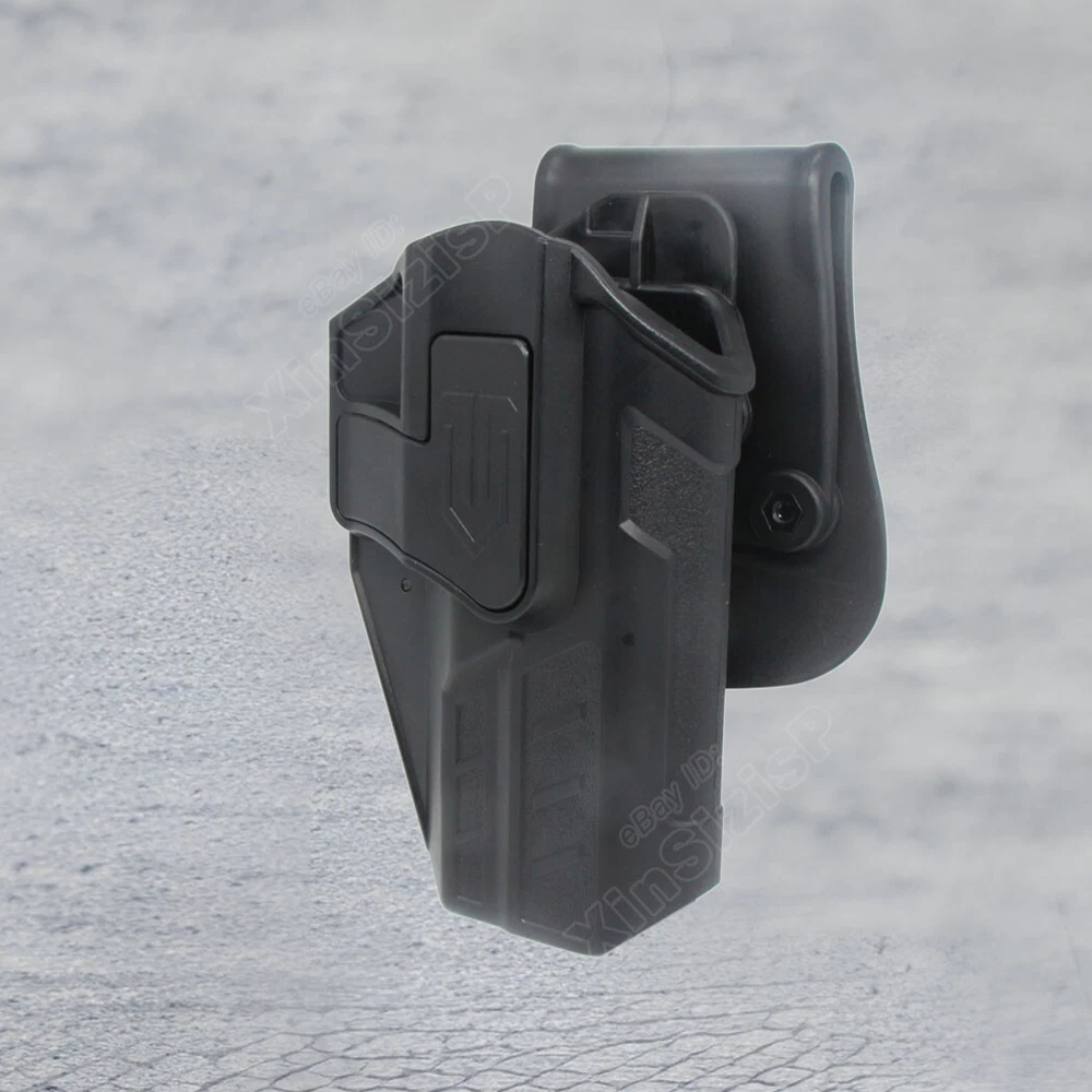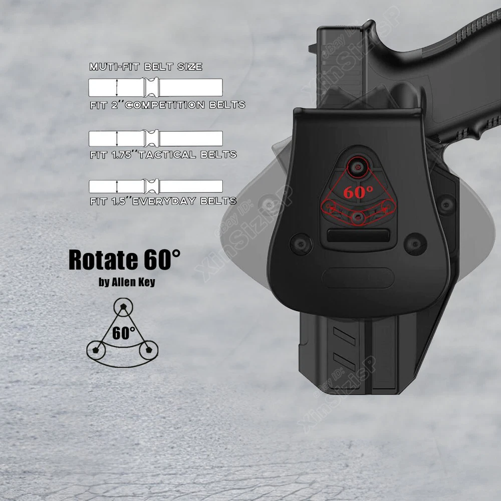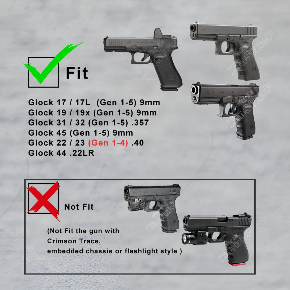 High Quality Military & Police Grade Polymer OWB Holster Specially Designed For Fast Draw During Duty Or Shooting Competition. Weapon Compatibility - Outside Waistband Tactical H olster Holster fit Glock 17 (Gen 1-5) 9mm Luger Glock 17L (Gen 1-5) 9mm Luger Glock 17C (Gen 1-5) 9mm Luger Glock 19 (Gen 1-5) 9mm Luger Glock 19X (Gen 1-5) 9mm Luger Glock 19T (Gen 1-5) 9mm Luger Glock 22 (Gen 1-4) .40 S&W (Not fit Gen 5) Glock 23 (Gen 1-4) .40 S&W (Not fit Gen 5) Glock 31 (Gen 1-5) .357 SIG Glock 32 (Gen 1-5) .357 SIG Glock 44 .22 LR Glock 45 9mm Luger ( Without laser and no embedded chassis, and no flashlight style ) Ease and Comfort Push side buttons to achieve the fast opening and closing, unique design allows for belt carrying or vest carrying, perfectly used by duty holsters, uniformed law enforcement officers, security personnel, military personnel, private persons, and shooting sports holsters. And it fits closer to the body which can achieve better concealment under clothes. High S afety Secure Level II I Retention - Auto-locking system restrain pistol in the holster to ensure ultimate safety, activate the release by pressing the button with the index finger to achieve gun access . A djustable Easily set Holster 60 degrees to your desire position with Allen key, compatible belt width up to 2 inch . Tough & Durable Material Custom-molded body made of polymer stronger than leather that will wear out, adapt to every bad environment In the Package: · 1*Holster with Paddle Attachment · 1*Allen Key Shipping: Ships same day or next except Sundays and Holidays ! Free shipping! Ship by USPS First Class Package. 100% MONEY BACK GUARANTEE. Any question please be free to contact with us .Thanks!