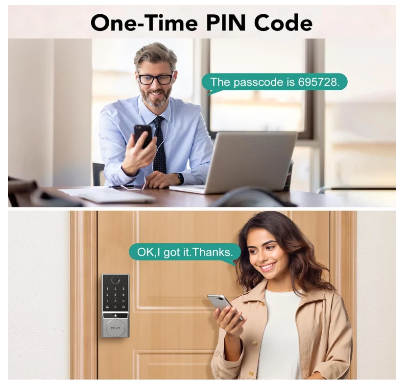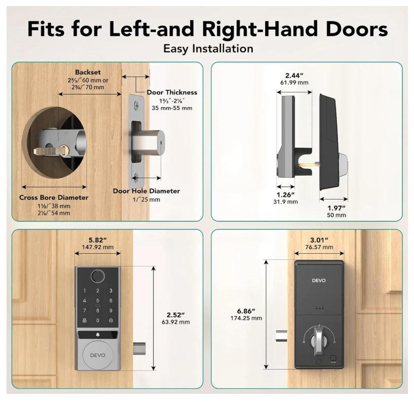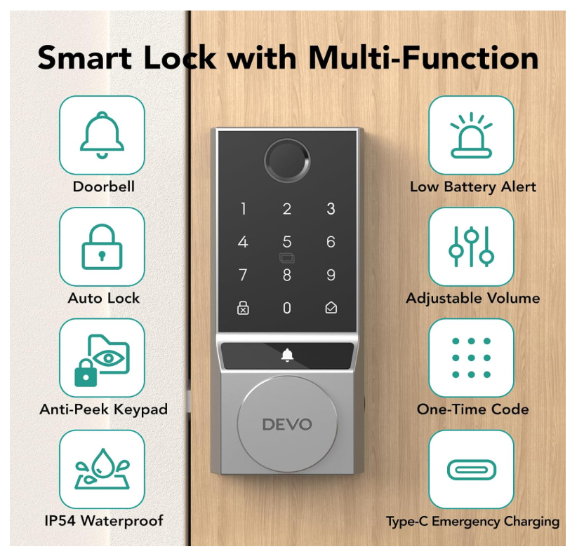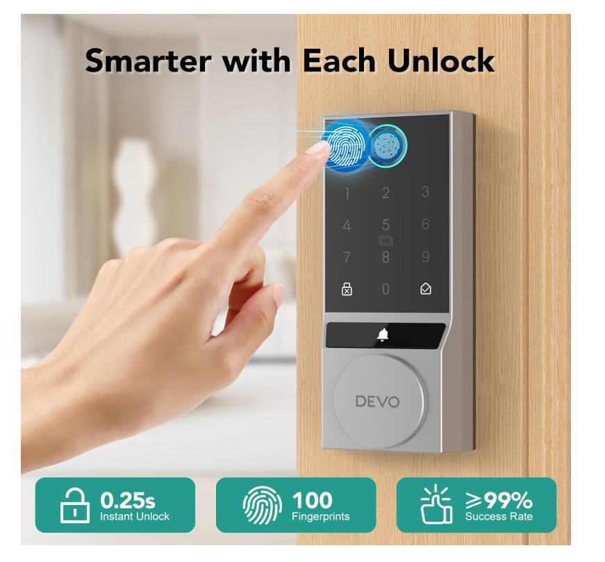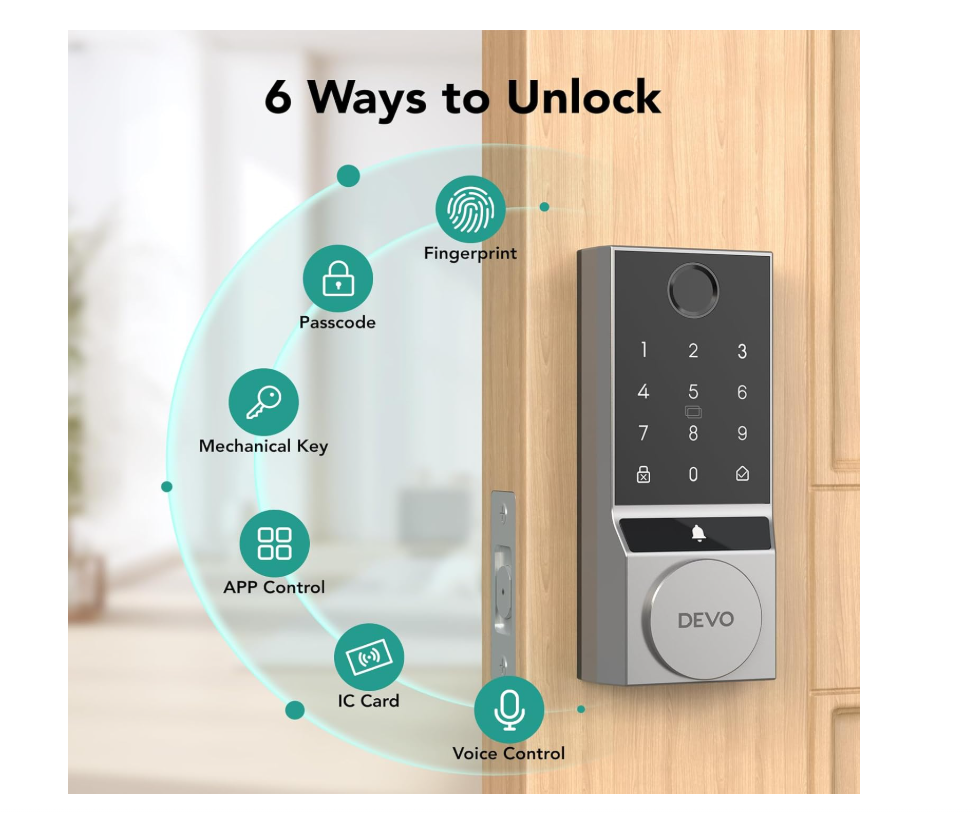 【6 Ways to Unlock】Devo G3 smart door lock provides 6 ways to Unlock. AI Fingerprint + Passcode + App Control + IC Card + Voice Control + Physical Key. Provide you with a convenient and safe home door lock solution. 【Self-learning AI】Fingerprint door lock will become more accurate with each use, so that you can easily enter without repeated attempts. Fingerprint deadbolt tongue can be recognized in 0.25s and unlocked in 0.5s. A maximum of 100 fingerprints can be stored. 【Multi-Function Integration】Smart deadbolt Lock integrates a variety of modern technology functions, not only has low battery alarm function, wrong input restriction, but also can generate temporary PIN code for guests, equipped with anti-peeping password, making your home life safer and smarter. 【Auto lock & One-Touch Lock】Devo deadbolt smart lock with intelligent automatic lock and one-touch lock functions, you can customize the lock time 5-900s. Automatically lock after each door is closed, completely eliminating the trouble of forgetting to lock the door, providing you with all-weather security. 【Easy Installation】The installation process does not require professional tools or complicated steps and is compatible with American standard doors. You can easily complete the installation and quickly experience the fun of smart life. In addition, DEVO provides 12 months warranty and technical support for smart locks. If you have any questions, please feel free to contact us.