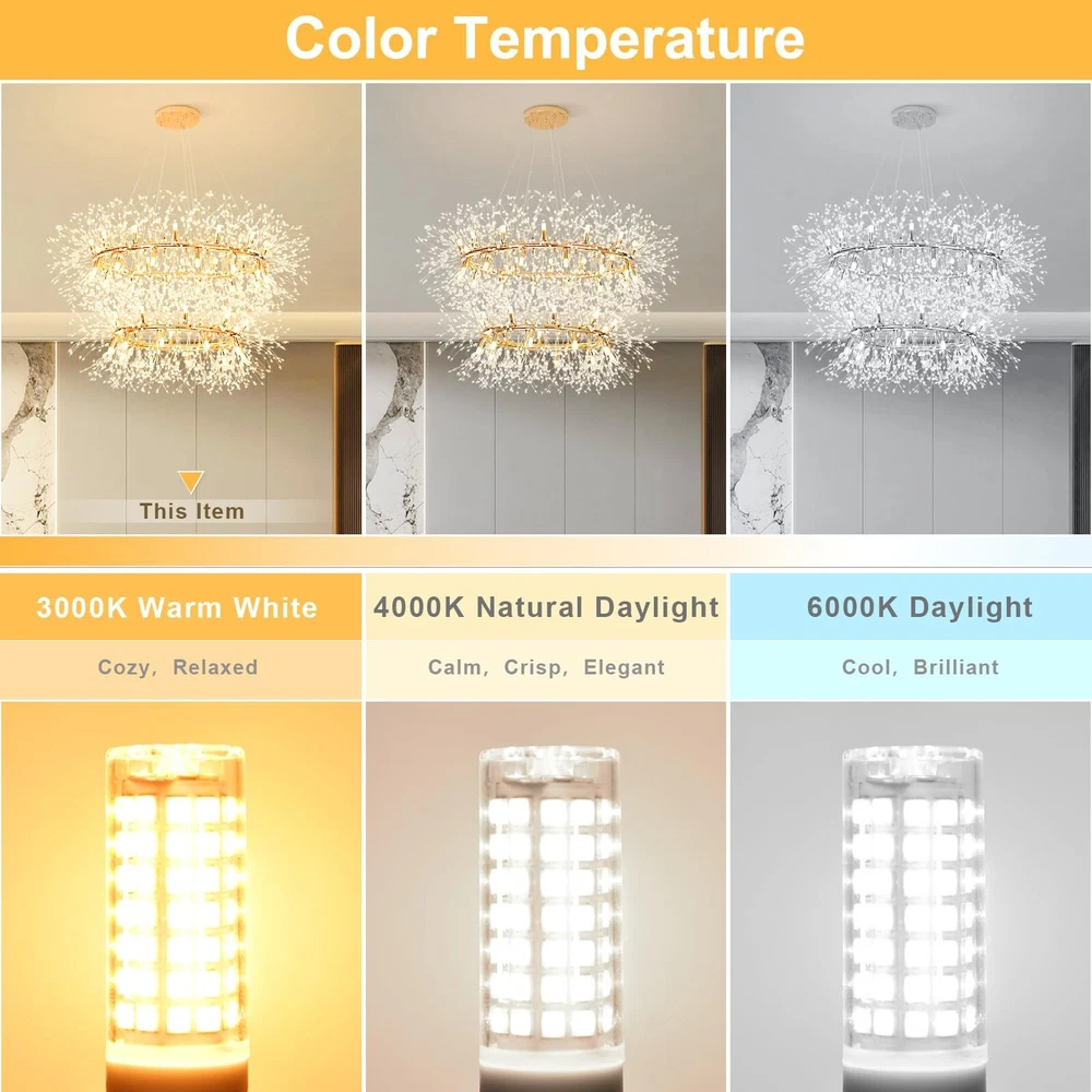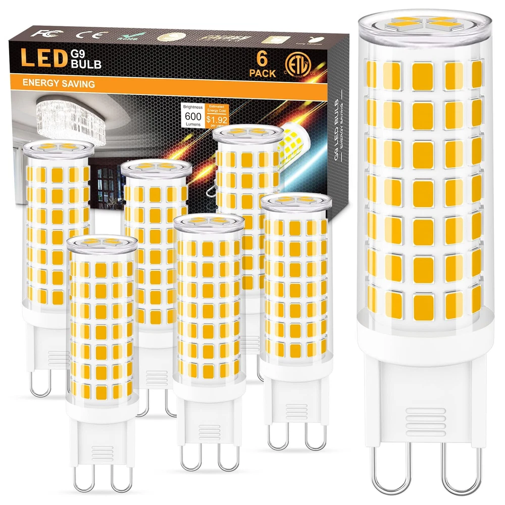 ✪ Feature -This 6w G9 led bulb can be your best choice to replace the 60W traditional halogen bulbs. -88 pcs energy-saving led chip provide refreshing bright daylight and save your electrical bill. -Fireproof ceramic material ensures better heat dissipation effect and offer longer lifespan. -Standard Bi-pin solid metal plate contact G9 base. Perfect for crystal chandelier, pendant, etc. -Relaxed yourself by 3000K cozy light. No UV or IR radiation, no visible flicker, no buzz or flash. -Transparent plastic cover allow the G9 bulb to provide 360-degree well-balanced illumination. ✪ Specification -Type: G9 Led bulb -CRI: 80+ -Power: 6W -Dimmable: No -Voltage: AC 120V -Luminous Flux: 5500LM -LED Type: 88pcs 2835SMD -Halogens Equivalent: 60W -Color: Warm White 3000K -Material: Plastic and Ceramic -Size: 0.73x0.73x2.5 inches -Beam Angle: 360-degree -Lifespan: 30000 hours ✪ Warranty & Package -24-month warranty -Package: 6psc 6W G9 LED Light Bulbs (3000K Warm White) 📣 Warning 1. The G9 LED bulbs are Non-Dimmable. 2. Make sure the size is suitable before purchase. 3. Please turn off the power before installation. 4. Keep away from any source of heat or water. Better Than Halogen: Featuring 88 2835SMD LED chips, this 6-watt G9 LED bulb is a smart choice for reducing your electricity bill.Note: G9 LED bulbs are longer than halogen bulbs. To ensure fitment, please check the size before purchase. 3000k Warm White: This G9 LED bulb emits a soft and cozy light to protect your eyes. It creates a comfortable atmosphere to make you feel relax and reduce the mental stress from work or study. Standard bi-pin G9 base, ideal for crystal chandelier, pendant, wall sconce, table lamp, office, hotel and other indoor applications. 360 Degrees Lighting: High transparent cylinder-shaped plastic cover allow the bulb light up from every surface to give you a uniform 360-degree illumination without dead angle that can never achieve from halogens. Fireproof Ceramic Body: This G9 LED bulb with ceramic body not only safe and fireproof, but also has excellent heat dissipation performance to extend its lifespan. (30000hours lifespan) Safe LED Bulb for Home: These LED light bulbs have obtained ETL, CE, FCC, and RoHS certifications, meeting the product safety standards. This means that they are safe to be used in the bedrooms, living rooms, or dining room.