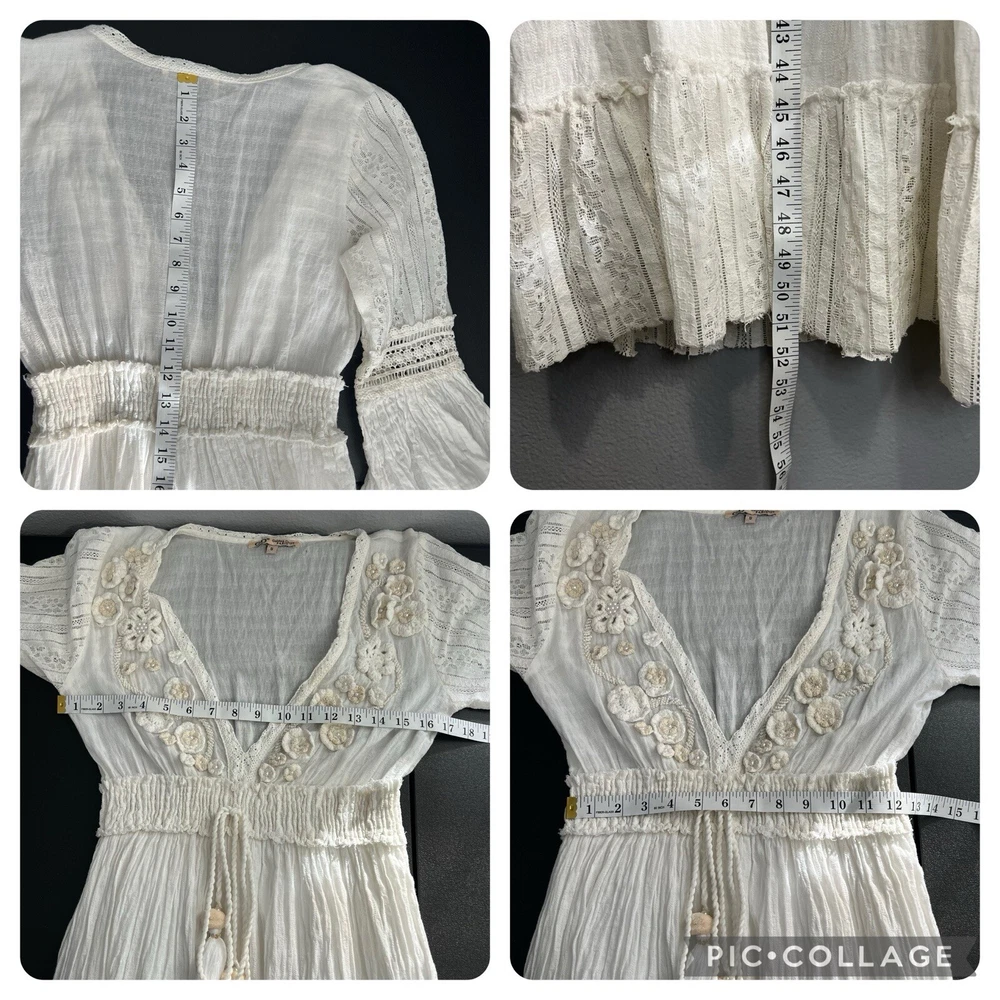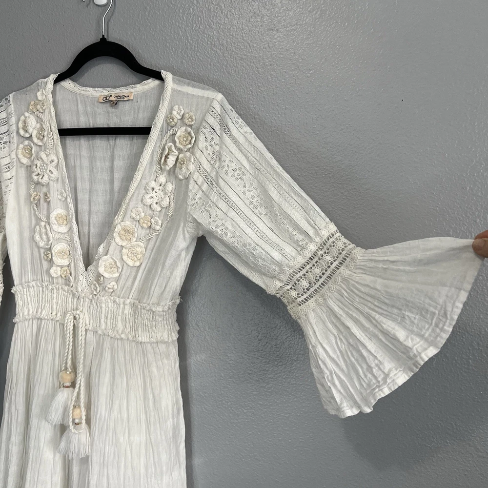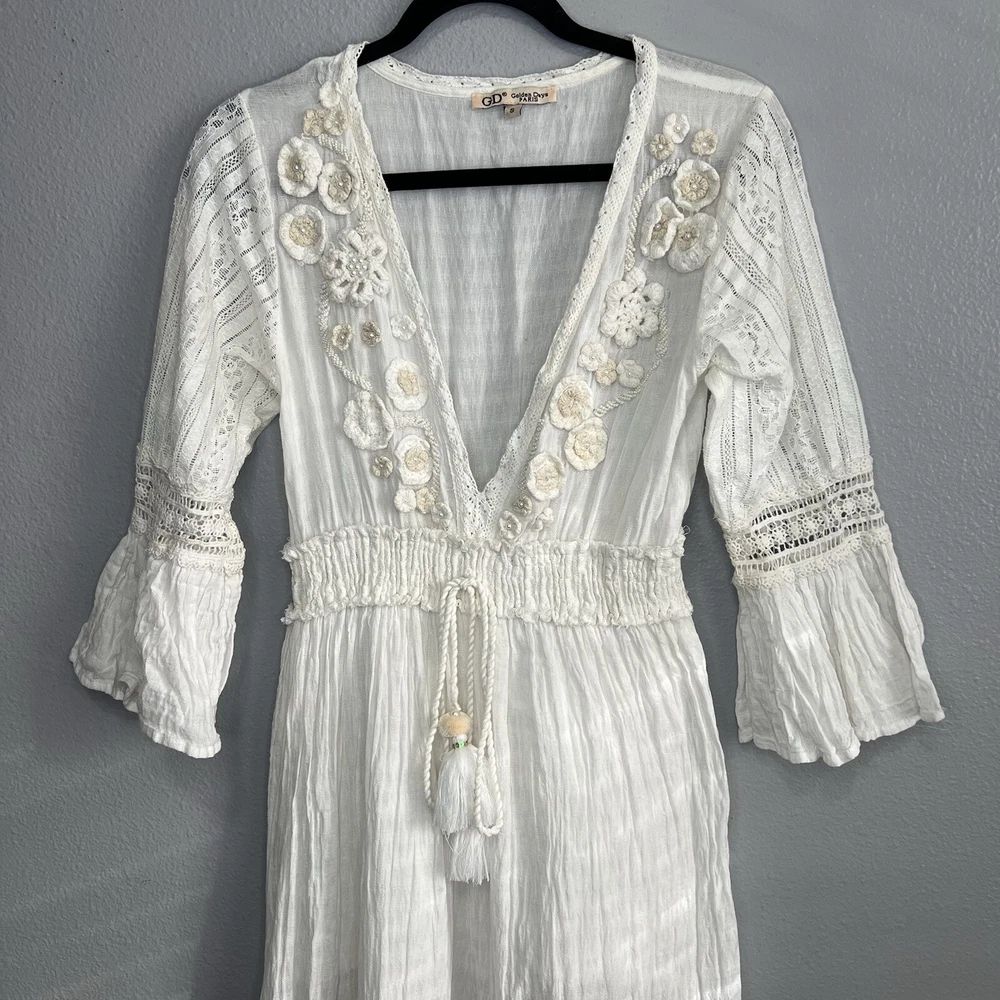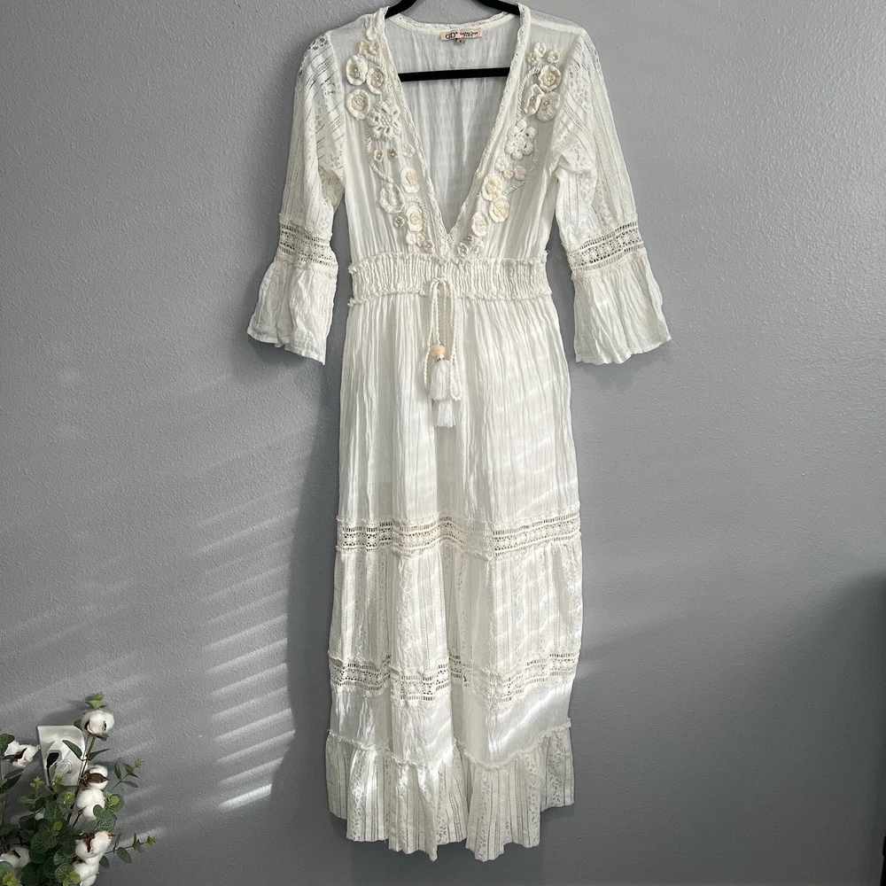 GD Golden Days PARIS lace boho maxi dress - women's size Small. Long beautiful 100% cotton lace dress. It is semi-sheer with a small skirt lining underneath that's approximately 13" long. Deep open V-neck. Has crocheted flowers all over the front with beading and embroidery. Approximate flat measurements: Pit to pit: 17" Length: 51" Elastic Waist: 12" Arm (neck to hem): 20.5" Good pre-owned condition. No tears, rips, or stains. Some threads look like they are fraying on the elastic waist, but there are no holes. Please see the photos for more details on the item, condition, and measurements.