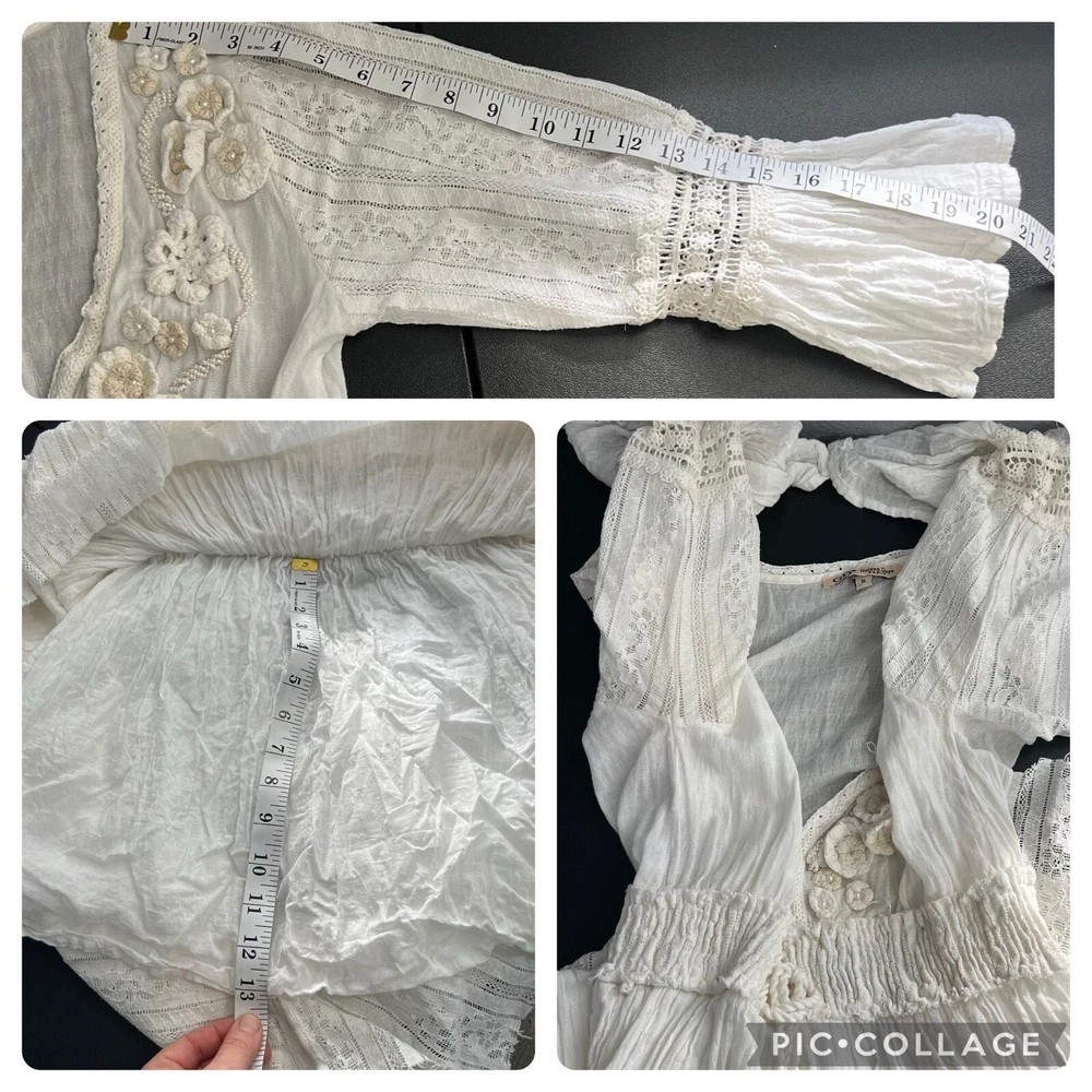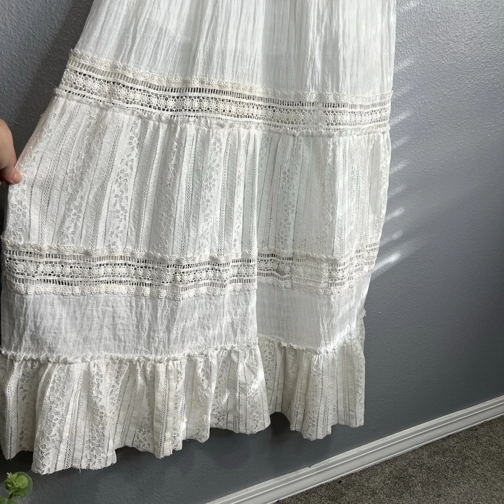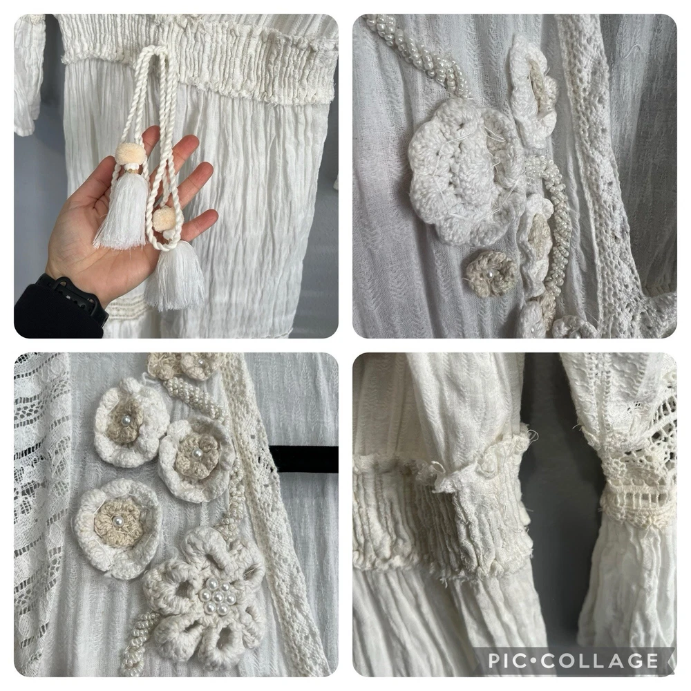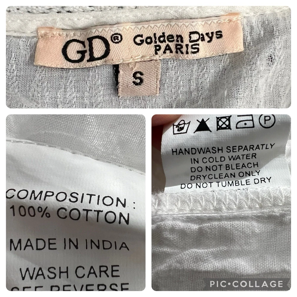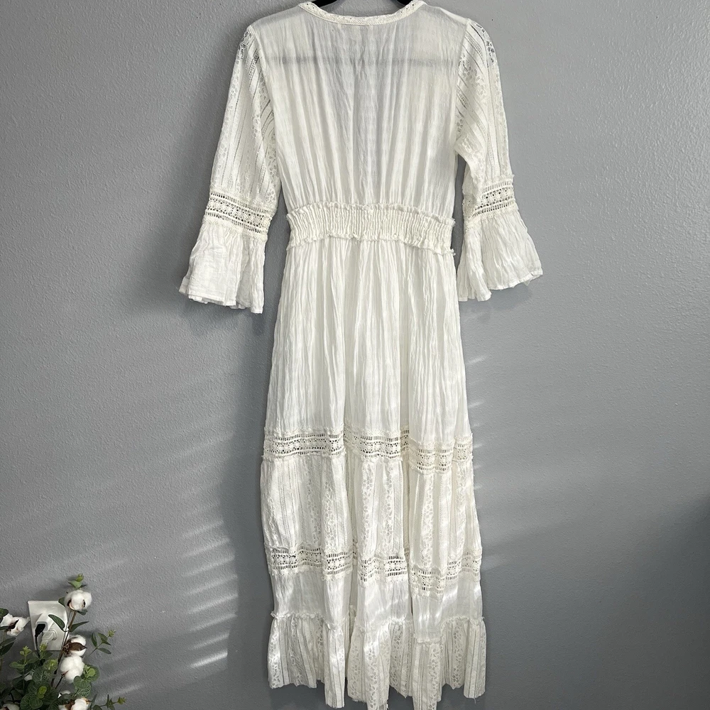 GD Golden Days PARIS lace boho maxi dress - women's size Small. Long beautiful 100% cotton lace dress. It is semi-sheer with a small skirt lining underneath that's approximately 13" long. Deep open V-neck. Has crocheted flowers all over the front with beading and embroidery. Approximate flat measurements: Pit to pit: 17" Length: 51" Elastic Waist: 12" Arm (neck to hem): 20.5" Good pre-owned condition. No tears, rips, or stains. Some threads look like they are fraying on the elastic waist, but there are no holes. Please see the photos for more details on the item, condition, and measurements.