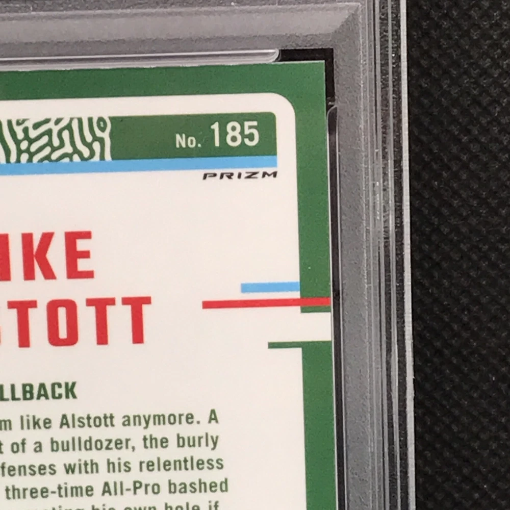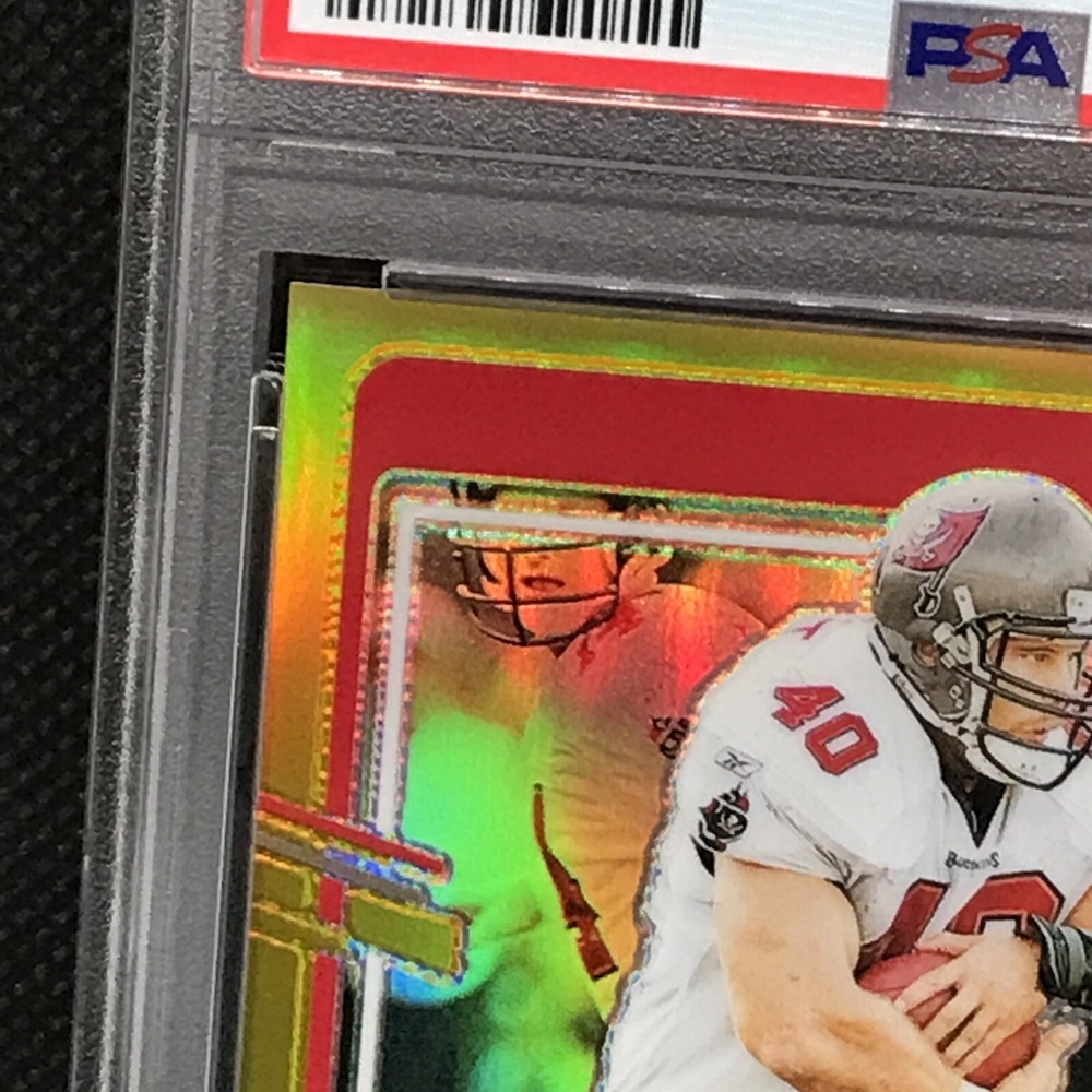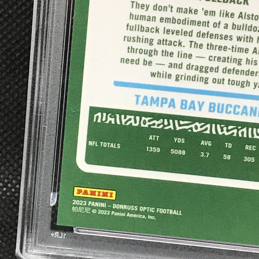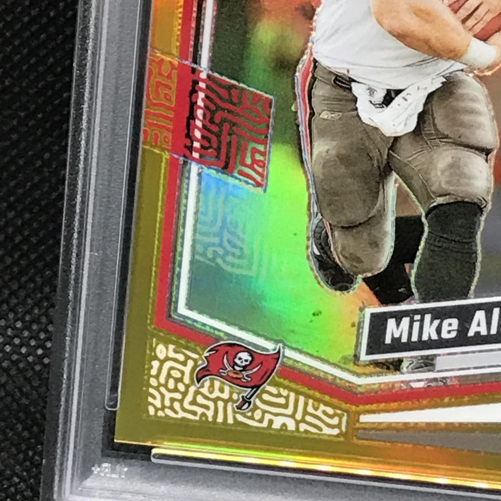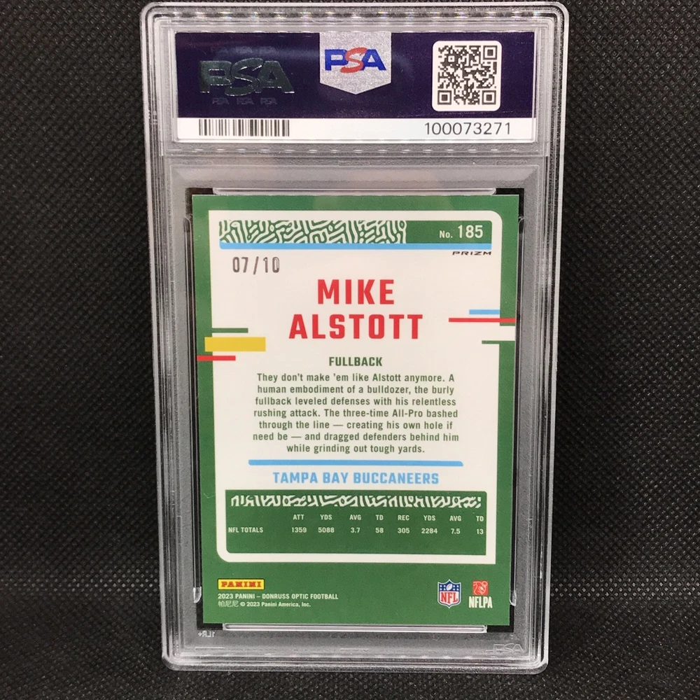 This is a rare and valuable sports trading card featuring Mike Alstott, a former player for the Tampa Bay Buccaneers. The card is part of the 2023 Panini Donruss Optic set and has a gold prizm parallel/variety, making it a highly sought-after item for collectors. It has been professionally graded by the Professional Sports Authenticator (PSA) and has a perfect grade of 10. The card is also serial numbered, hologrammed, and is a short print, making it an even more exclusive and valuable addition to any collection. This card is a must-have for any NFL or sports trading card enthusiast.
