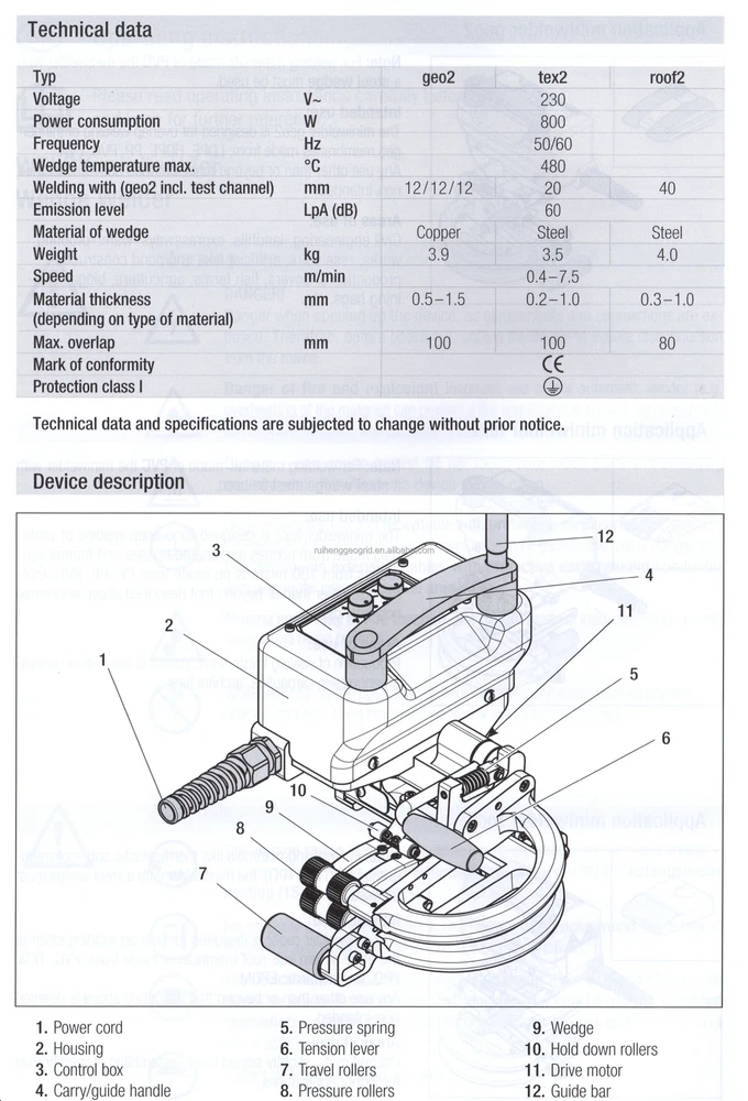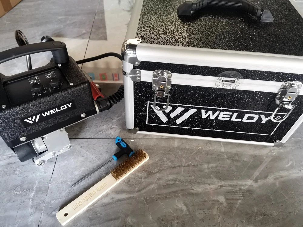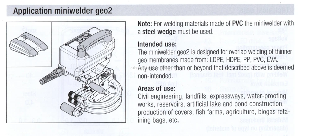 WELDY GEO2 plastic hot wedge welder geomembrane welding machine Product Description WELDY MINIWELDER GEO2 MINIWELDER GEO2 is suitable to weld geomembranes ranging from 0.5 - 1.5 mm thickness (HD-PE 0.4– 1.0 mm; TPO 0.7 – 1.5 mm). It can be used to weld fish farm tanks, water tanks, in gardens, foundations and many other industrial areas. The miniwelder geo2 distinguishes itself through its revolutionary drive technology and its intuitive operation. The temperature and speed can easily be activated and deactivated with two buttons and adjusted using two dials. Specification ITEM UNIT TECHNICAL PARAMETERS Voltage V 230 Frequency Hz 50/60 Power W 800 Speed m/min 0.4-7.5 Heating temperature ℃ 60-480 Welding width mm 2 x 12 Size (LxWxH) mm 228 x 228 x 170 Weight Kg 3.9 Operate Instructions Packing & Delivery Weight: 3.9KG Port: Qingdao Packaging Details: Packing by plastic box, if customers have the special requests, then we can do it as the customer's requests. Best selling Company Profie Tai’an City RuiHeng Building Materials Co., Ltd is specialized in the research, development, production and sales of geosynthetic materials, plastic products and plastic machinery. Our company is devoted to geosynthetic material research and development and application. Our main products are hdpe geomembrane liner,plastic geogrid, geotextile,3D geomat,geocell,geomembrane welding machine,extrusion welder and welding rod,etc. Our products have been widely used by clients in more than 20 countries and regions. Our products are applied in aquaculture, railways, highways, water conservancy, electric power, metallurgy, ports and municipal engineering construction. We have won the praises of customers.