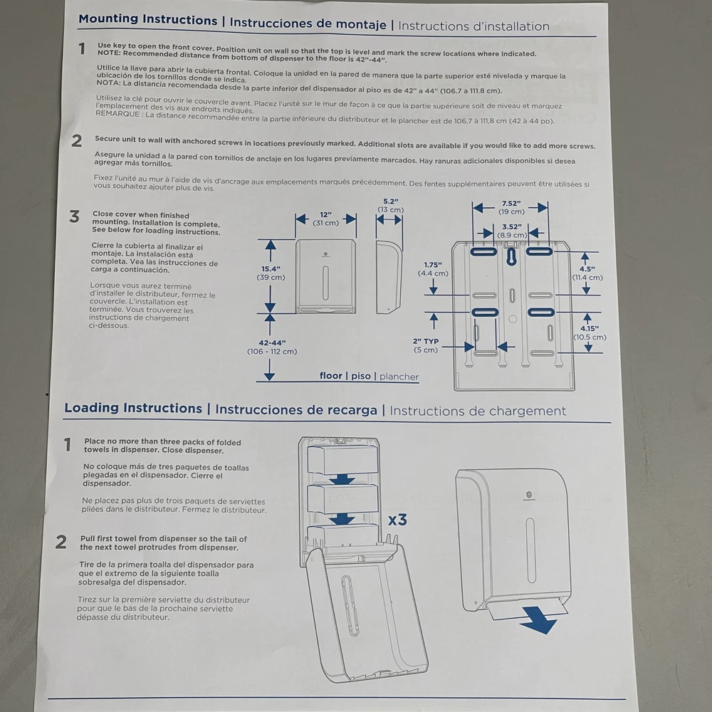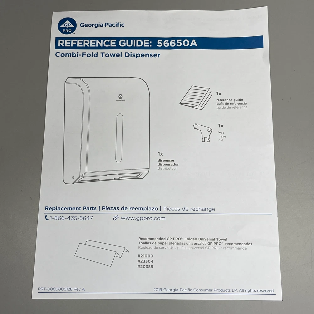 GEORGIA PACIFIC C-Fold/Multifold Paper Towel Dispenser Black 56650A (New) GEORGIA PACIFIC C-Fold/Multifold Paper Towel Dispenser Black 56650A Condition: New Model Number: 56650A Size: 15.5" T x 12" W x 5" D Paper Towel Size: C-Fold/Multifold, 8 in; 9-3/4 in; 10-1/8 in The GEORGIA PACIFIC C-Fold/Multifold Paper Towel Dispenser in sleek black is a must-have for high-traffic areas where hygiene and convenience are paramount. Brand new and featuring durable plastic construction, this dispenser is engineered to withstand rigorous daily use, ensuring long-lasting performance and reliability. With dimensions of 15.5" in height, 12" in width, and 5" in depth, it's compact yet capacious, holding up to 400 C-Fold or 600 Multifold paper towels, or one pack of BigFold towels, helping to minimize run-outs and maintain a clean environment. Compatibility: Compatible with various paper towel sizes including M-Fold, Z-Fold, and C-Fold, making it versatile for different restroom setups. Key Features: Durable Plastic Construction: Ideal for high-traffic areas, ensuring longevity and reliability. High-Capacity: Holds up to 400 C-Fold, 600 Multifold, or one pack of BigFold towels, minimizing run-outs and ensuring continuous availability. Key Lock: Helps reduce waste and pilferage, providing added security and control over paper towel usage. Compatible with Various Towel Types: Dispenses M-, Z-, or C-fold paper towels, offering flexibility to accommodate different preferences and needs. GEORGIA PACIFIC C-Fold/Multifold Paper Towel Dispenser Black 56650A (New) GEORGIA PACIFIC C-Fold/Multifold Paper Towel Dispenser Black 56650A Condition: New Model Number: 56650A Size: 15.5" T x 12" W x 5" D Paper Towel Size: C-Fold/Multifold, 8 in; 9-3/4 in; 10-1/8 in The GEORGIA PACIFIC C-Fold/Multifold Paper Towel Dispenser in sleek black is a must-have for high-traffic areas where hygiene and convenience are paramount. Brand new and featuring durable plastic construction, this dispenser is engineered to withstand rigorous daily use, ensuring long-lasting performance and reliability. With dimensions of 15.5" in height, 12" in width, and 5" in depth, it's compact yet capacious, holding up to 400 C-Fold or 600 Multifold paper towels, or one pack of BigFold towels, helping to minimize run-outs and maintain a clean environment. Compatibility : Compatible with various paper towel sizes including M-Fold, Z-Fold, and C-Fold, making it versatile for different restroom setups. Key Features : Durable Plastic Construction: Ideal for high-traffic areas, ensuring longevity and reliability. High-Capacity: Holds up to 400 C-Fold, 600 Multifold, or one pack of BigFold towels, minimizing run-outs and ensuring continuous availability. Key Lock: Helps reduce waste and pilferage, providing added security and control over paper towel usage. Compatible with Various Towel Types: Dispenses M-, Z-, or C-fold paper towels, offering flexibility to accommodate different preferences and needs. × × × × × × × × × × × × × × × × × Buy now and save! Shipping info Click the Shipping & Payments tab above the listing description for more info Click the Shipping & Payments tab above the listing description for more info! Additional delivery notes PICK UP OPTION Our items are available for pick-up. Pick up procedure is as follows: Purchase the item through eBay Email us to coordinate pickup PAYMENT Immediate payment is required upon selecting "Buy It Now" or upon checking out through the cart. We accept payment via U.S. PayPal accounts and all Major Credit Cards, Debit Cards & Google Pay. We are legally required to collect sales tax in those states and localities where we maintain a physical presence (nexus). The applicable amount of sales tax charged to an order will be calculated based on the shipment destination's state and local sales tax laws. Thank you for shopping with us on eBay! Additional Information No additional information at this time Ask seller a question You might also like PLUM QUEEN Classic Genuine Leather Handbag Women's Sz M Black (New) PLUM QUEEN Classic Genuine Leather Handbag Women's Sz S Black (New) Ball Joint HD-PE 62-15 02-81007 Q9XYG 6514165 (New) ABC SUPPLY CO Camo American Flag Hat Embroidered Sz Adjustable CWF-305 (New) Contact To contact our Customer Service Team, simply click the button here and our Customer Service team will be happy to assist. Ask seller a question © PayWut Shipping & Payments Click the Shipping & Payments tab above the listing description for more info Payment Accepted Payment Methods Immediate payment is required upon selecting "Buy It Now" or upon checking out through the cart. We accept payment via U.S. PayPal accounts and all Major Credit Cards, Debit Cards & Google Pay. We are legally required to collect sales tax in those states and localities where we maintain a physical presence (nexus). The applicable amount of sales tax charged to an order will be calculated based on the shipment destination's state and local sales tax laws. Thank you for shopping with us on eBay! Returns Returns are accepted Items must be returned within 30 days of the auction ending Buyer will pay for return shipping. eBay integration by