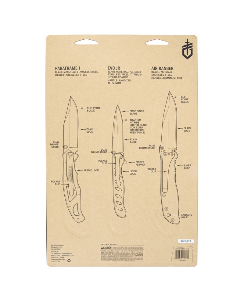 Introducing the Gerber Greatest Hits 3-Piece Knife set, the ultimate combination of Gerber's finest folding knives. This curated collection features three of Gerber's most iconic and trusted designs - the Paraframe I, Evo Jr., and Air Ranger. Each knife is meticulously crafted for performance, reliability, and convenience, making them indispensable tools for outdoor enthusiasts and everyday users alike. Paraframe I: Simplicity at its Best The Paraframe I is renowned for its minimalist frame lock design and lightweight build. Its sleek open frame is not only easy to clean and carry but also easy to open, making it a favorite among those who value simplicity and functionality. Evo Jr.: Compact and Robust The Evo Jr. may be compact, but it doesn't skimp on performance. Designed for those who need a reliable blade in a smaller package, its ergonomic handle ensures a secure grip, allowing for precision in every cut. Air Ranger: Elegance Meets Utility The Air Ranger combines elegance with tactical utility. It features a fine-edge blade and a rugged handle that's both stylish and durable. Quality and Craftsmanship All three knives in this set are equipped with 7Cr steel blades, recognized for their balance of hardness and corrosion resistance. The plain edge on each blade allows for clean precise cuts, making them perfect for tackling tough materials or performing detailed tasks. Each knife also includes a convenient pocket clip, ensuring they're always within reach when you need them. Whether you're looking to expand your knife collection or need a reliable set for various tasks, the Gerber Greatest Hits 3-Piece Knife Set offers unparalleled versatility and durability. It's a must-have for anyone who values quality and craftsmanship.