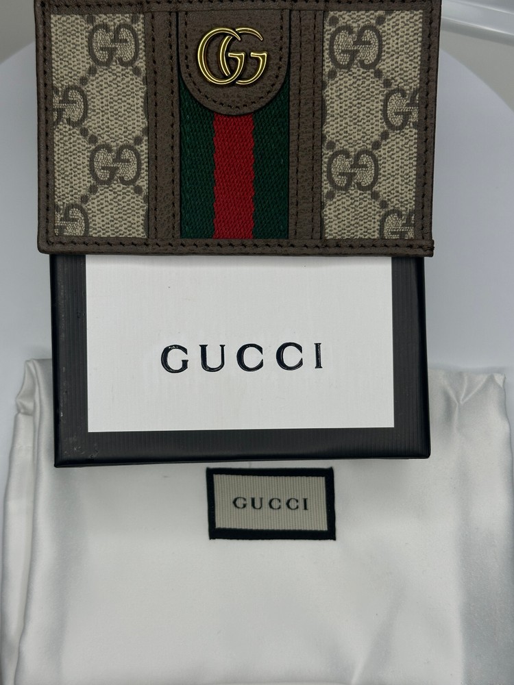 Gucci brown mono cardholder wallet. comes with box, dust bag, cards. Listing and template services provided by inkFrog