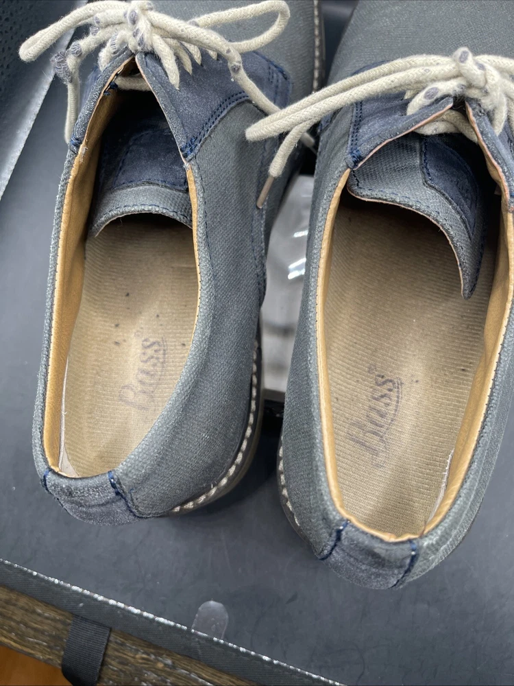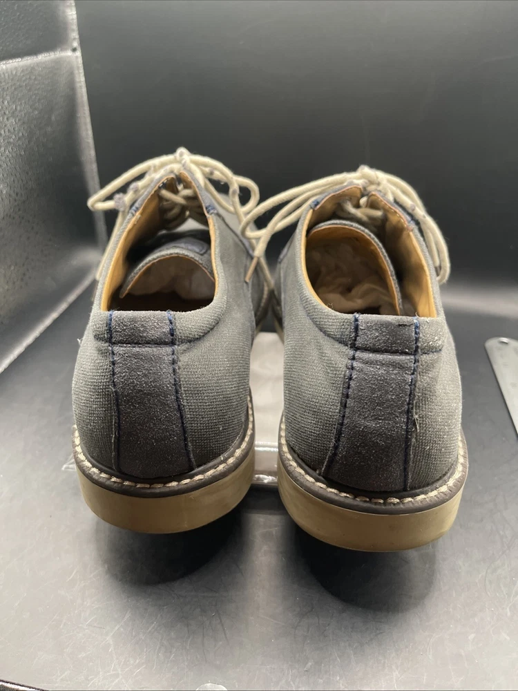 The shoes are medium shade grey with navy blue New shoe laces recommended The material feels like fabric They look dirty in the pictures from the lighting, I assure you they are not Nonsmoking home
