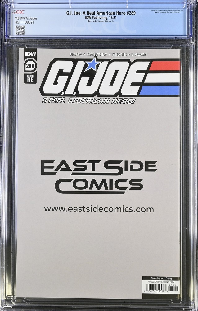 Welcome comic book community to the Destroyer of Worlds Comics store and our listing for G.I. Joe: A Real American Hero 289 CGC 9.8 East Side Comics Edition A We are a small shop and our focus is to bring the best buying experience to our customers. Destroyer of Worlds Comics is an authorized CGC Dealer which grants us access to the CGC database for all graded book details which are included in every listing along with the hi resolution scans taken by CGC. We know that buying comics online can be stressful so we proactively eliminate the most common sources of stress by packing our comics professionally using BCW Graded Comic Bags and then placing them into sturdy 200 lb test boxes to withstand any mishandling while in transit with the carrier. When we receive an order it becomes top priority and your order is immediately pulled from inventory and packaged properly to arrive in your hands as quickly as possible. Our goal is for you to not worry about your order arriving late or guessing when it will be shipped. When you buy from our store you will also receive hassle free 30 day returns and we will cover the shipping cost back to us if you decide to make a return. We hope our commitment to protecting comics and servicing our customers provides a trustworthy and pleasant experience and thank you for considering us. The images in the listing are the actual item you will receive after purchasing. If you have any questions prior to making a decision please reach out and we will answer promptly. We are located in southern Florida not far from CGC and add new listings regularly so please take a look at our other listings if you are looking for CGC graded books and favorite us as a seller if you enjoyed buying from us. CGC Certification Info Title: G.I. Joe: A Real American Hero Issue: 289 Grading Company: CGC Grade: 9.8 CGC Cert #: 4511108021 Page Quality: WHITE Issue Date: 12/21 Issue Year: 2021 Publisher: IDW Publishing Variant: East Side Comics Edition A Grade Date: 11/15/2024 Grade Category: Modern Key Comments: ""Virgin"" cover. Art Comments: Larry Hama story Casey Maloney art John Giang cover Total Graded By CGC: In 9.8: 17 Grader Notes: None CGC Census Report CGC Database Query Time: 2024-12-05T12:33:07.6722406-05:00 Mint 10.0: 0 Mint 9.9: 0 Near Mint/Mint 9.8: 17 Near Mint+ 9.6: 0 Near Mint 9.4: 1 Near Mint- 9.2: 0 Very Fine/Near Mint 9.0: 0 Very Fine+ 8.5: 0 Very Fine 8.0: 0 Very Fine- 7.5: 0 Fine/Very Fine 7.0: 0 Fine+ 6.5: 0 Fine 6.0: 0 Fine- 5.5: 0 Very Good/Fine 5.0: 0 Very Good+ 4.5: 0 Very Good 4.0: 0 Very Good- 3.5: 0 Good/Very Good 3.0: 0 Good+ 2.5: 0 Good 2.0: 0 Good- 1.8: 0 Fair/Good 1.5: 0 Fair 1.0: 0 Poor 0.5: 0 Case Condition We understand every collector has a unique set of standards when it comes to condition of the case and we often receive entire submissions with defects therefore we make every effort to note those conditions in the listing since they are often not visible in the scanned images. Nearly every case we receive from CGC has at least one of the following defects: grade on label not centered, label mounted crooked, newton rings, scuffing, scratches, case stress from the sealing process or inner well movement. To keep you informed before making a purchase decision we note major defects like cracks, newton rings, heavy scratches, and major scuffing in the listing but do not list the minor ones. If there are any flaws you dislike in particular please message us and we would be happy to review any of our listings and get back with you with every flaw we can find on the case. In the event the case arrives and is not to your satisfaction please reach out and we will offer to replace it if we have one available in better condition or a return can be opened at no cost within 30 days to receive a full refund. Pricing All fixed price listings are firm. We price our books at fair value according to recently sold listings but do realize prices fluctuate frequently when auctions are involved so we sometimes create auction listings for a chance at reduced prices for those who enjoy the thrill of the hunt. We also regularly run promotional coupon codes for volume discounts on orders of multiple fixed price listings so be sure to add listings to your watchlist and check back frequently. Shipping Policy Destroyer of Worlds Comics typically ships your items same day or next business day after payment is made. CGC graded comics are wrapped both vertically and horizontally in 5/16 inch bubble wrap and then placed into a 200 lb test corrugated box for protection. Ungraded comics are shipped in Gemini Comic Mailers. Combined shipping is offered for both domestic and international buyers. Please note for international orders any additional import fees duties taxes or customs charges are the sole responsibility of the buyer. These charges are determined by your country's customs office and we unfortunately have no influence over the amount charged or the duration of the assessment process due to the customs forms being automated. Please be aware that customs procedures and policies vary from country to country. If you have any concerns or questions regarding import fees duties or taxes we recommend contacting your local customs office before making a purchase. Return Policy Free returns available on all CGC graded books within 30 days of purchase.