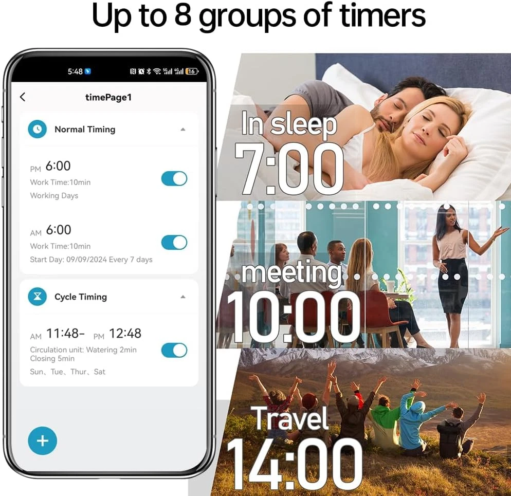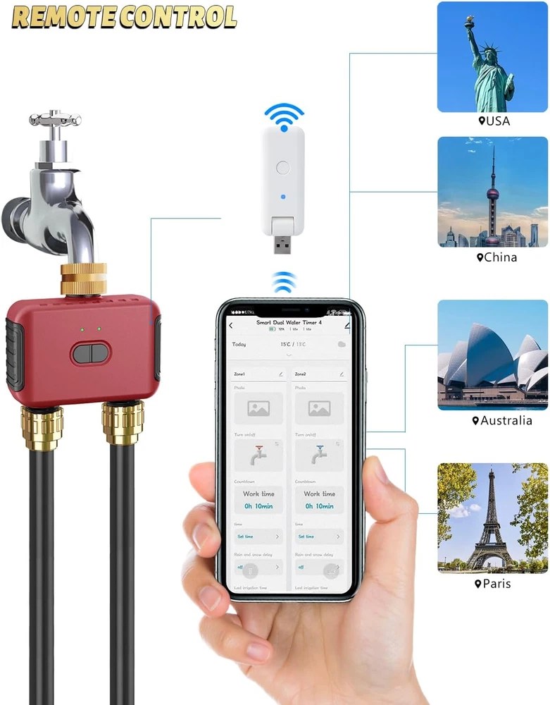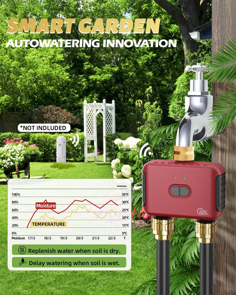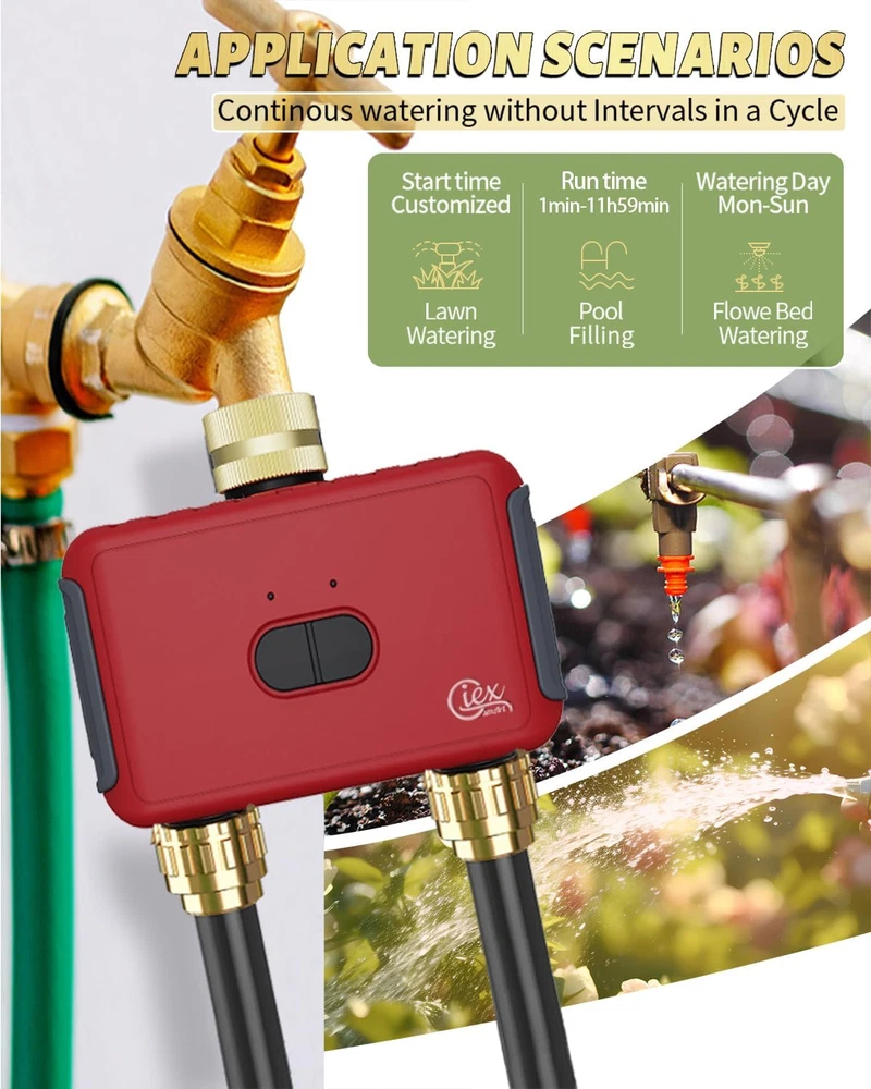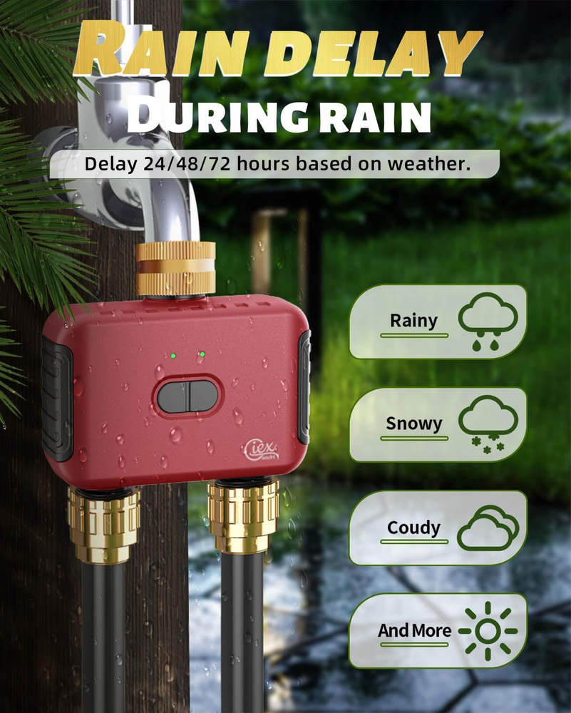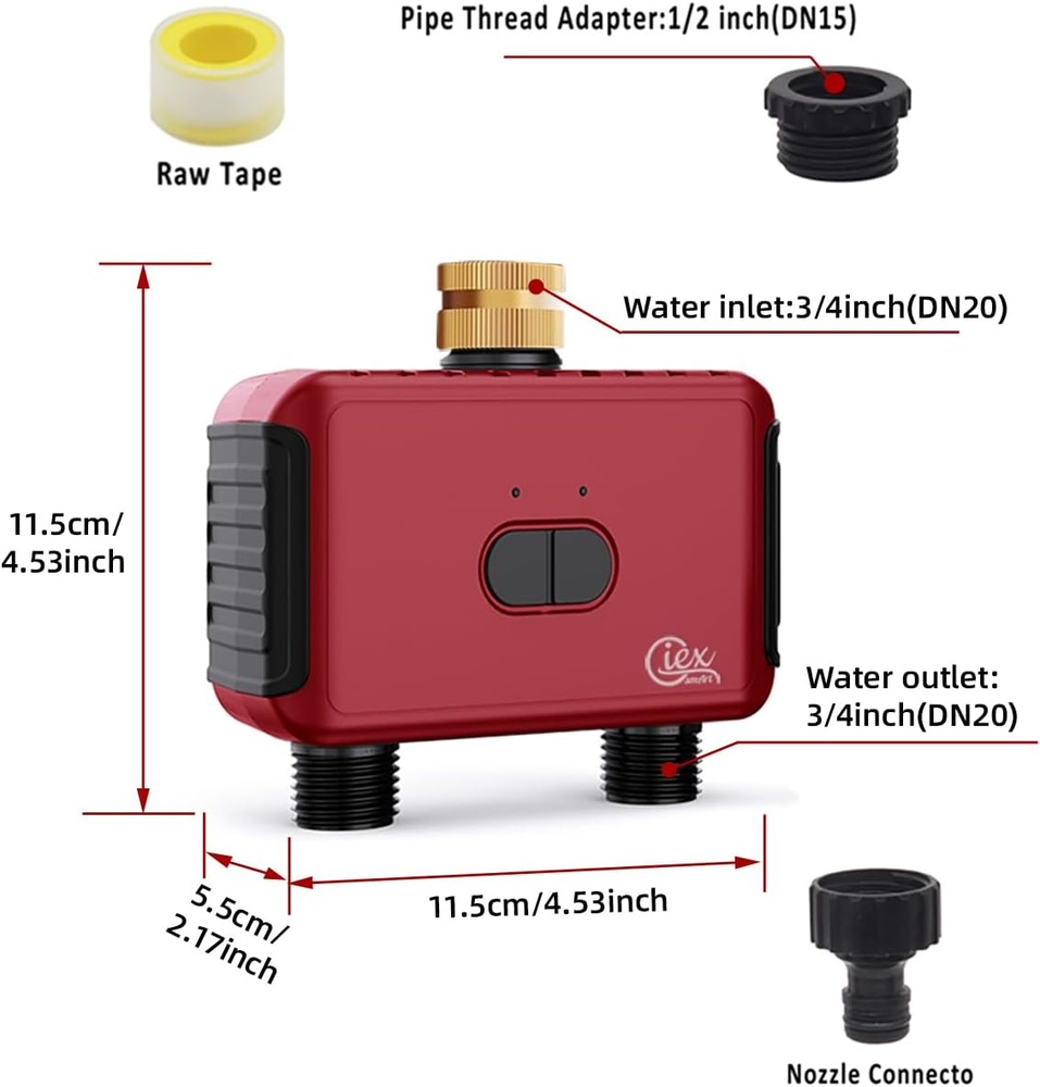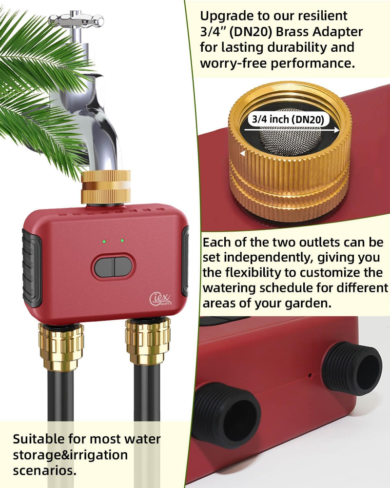 Durable Brass Inlet: Featuring a brass water inlet, this watering timer reduces wear on the timer and faucet threads. It can withstand higher water pressure, improving durability. The brass-in-plastic design allows for easy tightening without the need for tools. Wi-Fi Connected for Remote Scheduling: Connect the timer to your 2.4GHz Wi-Fi network via the Smart Life app. Easily set and adjust your watering schedules anytime, anywhere—even when you’re away from home—so your garden stays green without extra effort. Voice Control with Alexa & Google Assistant: Enjoy hands-free convenience with smart voice control. Compatible with Alexa and Google Assistant, you can activate or stop watering by simply saying, “Alexa, turn on the dual-zone water timer.” 2 Independent Zones with Custom Plans: Manage two separate watering areas with one device. Each zone can be set with up to 10 individual watering schedules, allowing for fully customized irrigation without overlap or interference. Flexible Watering Modes: Choose from four automatic watering options—specific weekdays, odd or even days, or custom intervals (e.g., every 3 days). Each mode supports precision scheduling for a full month to meet all garden needs. Cyclic Watering for Advanced Control: Set a repeating watering cycle by selecting a start and end time, duration (1 min–24 hrs), and interval (1 min–24 hrs). Ideal for drip irrigation or fine-tuned watering routines throughout the week. Rain Delay & Manual Watering: Save water with the built-in rain delay feature—pause irrigation for 1 to 7 days during rainy weather. Use the manual watering option directly on the device or via app for instant control when needed. Product Description Smart Garden Watering Timer Description: Upgrade your garden with our WIFI Smart Watering Timer - the ultimate solution for automatic. Multi-Device Automation: Create custom routines with sensors, lights, and weather apps for a truly connected garden. Save Time and Water: Optimize watering schedules based on soil moisture, weather forecasts, or smart home triggers. Exquisite design, compact body size, making the watering timer more delicate and refined. 3/4-inch NH threaded brass inlet for increased durability and sturdiness Water two zones simultaneously with independent control 2-ZONE Watering timer GX-03 Product Parameters Working Water Pressure:2.9-116 PSI Power Supply:2 AA batteries Watering Time:Min 10S Watering Capacity:Min 1L Metal Connector:Brass Phone app:TUYA & Smart Life Note Remote control requires pairing with the included gateway. Remote watering control via app Remote control via smartphone allows you to manage watering from anywhere. Monitor water flow to detect water shortages or stoppages, ensuring your plants are cared for even when you're away.