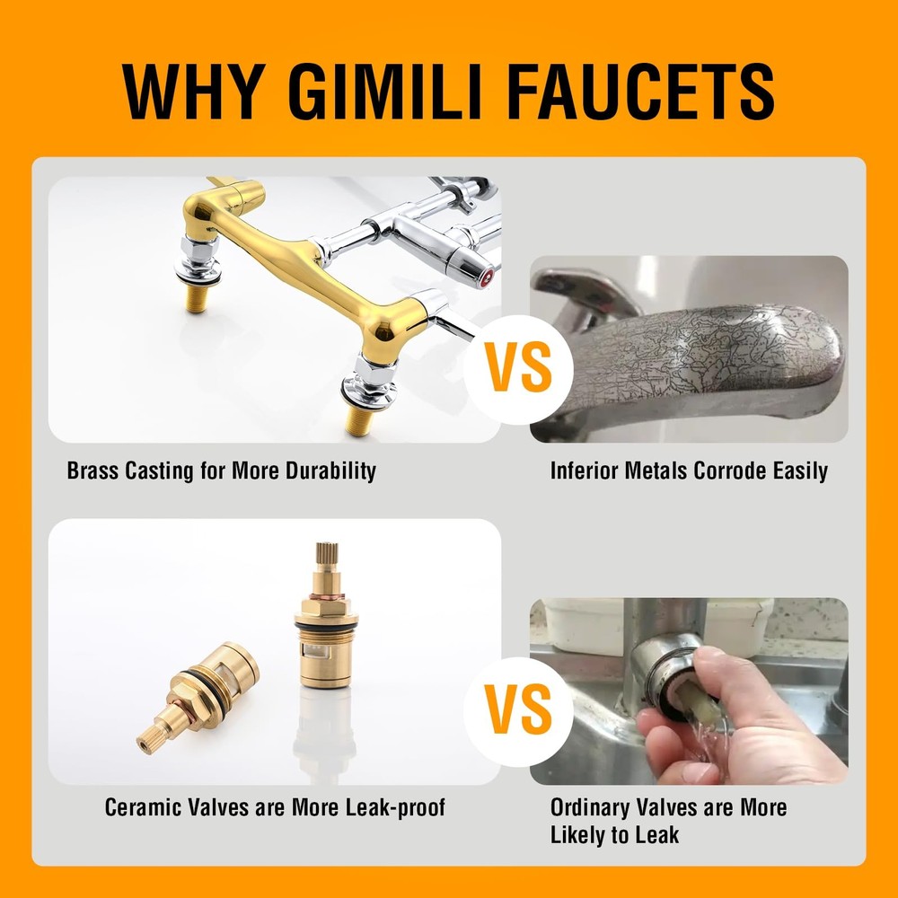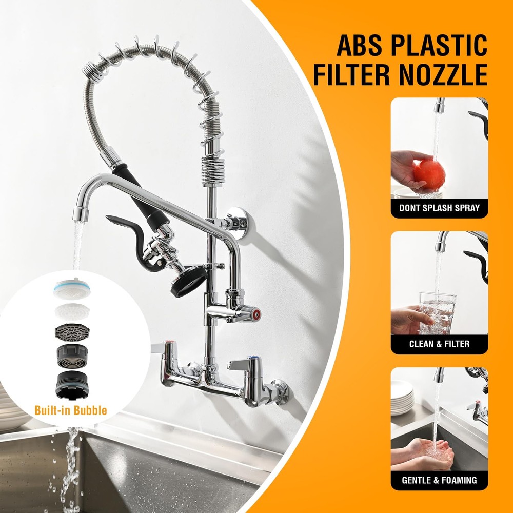 Commercial Kitchen Faucet Wall Mount with Pre-Rinse Sprayer 8 Inch Center Wall Mount Kitchen Sink Faucet Swing Spout 25" Height Faucet with Pull Down Spray Adjustable Wall Mount: 8" adjustable center distance. Available for hole distance:7.75"-8.25", Easy to match with your stainless steel/ceramic/acrylic/crystal stone or prepared utility sink 12” 360 Degree Swivel Spout: GIMILI wall mount faucet spout can be rotated 360 degrees, it allows the water reaches every corner of the sink as possible. Spout with a ABS bubbler, gentle water discharge without splashing Reliable Quality: The solid brass body keeps family members away from harm. Polished Chrome surface which is resist scratches and corrosion, not easy to oxidize, for creating a stylish kitchen decoration style More Applicable Scenes: GIMILI commercial sink faucets are suitable for many indoor or outdoor locations, such as restaurants, kitchens, gardens, farmhouses, backyards, laundry rooms, garages, etc Easy DIY Installation: GIMILI provides you with a detailed user manual and installation video, allowing you to install the faucet independently within 30 minutes.