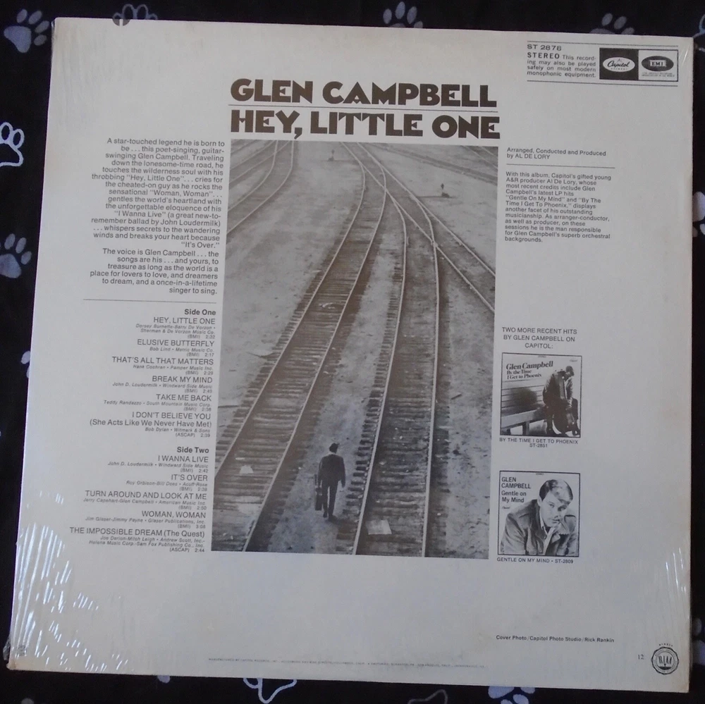 Glen Campbell – Hey, Little One Label: Capitol Records – ST 2878, Capitol Records – ST-2878 Format: Vinyl, LP, Album Country: US Released: Genre: Pop, Folk, World, & Country Style: Country, Vocal A1 Hey, Little One 2:32 A2 Elusive Butterfly 2:17 A3 That's All That Matters 2:29 A4 Break My Mind 2:49 A5 Take Me Back 2:38 A6 I Don't Believe You (She Acts Like We Never Have Met) 2:39 B1 I Wanna Live 2:42 B2 It's Over 2:38 B3 Turn Around And Look At Me 2:50 B4 Woman, Woman 3:08 B5 The Impossible Dream (The Quest) 2:44 USA NEW OLD STOCK VINYL LP. SLEEVE: SEALED. NO CORNER CUTS. NO EDGE CUTS. NO DRILL HOLES. STORAGE CORNER BUMPS. DISC: MINT UNPLAYED. SALE CONDITIONS FOR NEW OLD STOCK SEALED RECORDS WE CANNOT ACCEPT RETURNS OF SEALED RECORDS UNDER ANY CIRCUMSTANCES UNLESS THEY ARE STILL SEALED AS ORGINALLY SHIPPED. This sealed record is sold as a collectible and not a playing copy. Its premium price is based on the fact that it is still sealed after all these years. Please consider this carefully before you open up a new old stock sealed record. Although rare occurrences, we cannot be responsible for pressing defects, warps or any other factory errors as this title is no longer returnable to the distributor for a replacement or refund. We except no returns of opened product under any circumstances. The higher value of sealed old stock LPs is usually due to collectors wanting to keep, and not open, original issues. Opening the seal changes the intrinsic nature and value of the object, the same as would apply to still sealed blister-packed/boxed collectable toys. Open copies of the same LPs are not worth as much to serious collectors because they then become far more common, however good the condition of the disc or sleeve. Our sealed records are described TO THE BEST OF OUR KNOWLEDGE AND ABILITY, but are sold only as stated on an 'As Is' basis. If you are purchasing this title to open and play, it is not returnable under any circumstances. It is sold as a still-sealed collectors item under the assumption that the purchaser intends to keep it as sealed. This title is new old stock from the original period of the album's release. It is not a recent repress or reissue, but as it is sealed we cannot confirm which pressing plant or label design it has, and it is offered for sale on that basis. Please notify us with your payment if you want us to open this sealed record and check the merchandise before we ship it. This would prevent seam splits (the disc breaking through the spine of the cover in transit) that can occur as part of the shipping process. We always pack carefully, but the only sure way to prevent seam splits in transit is to remove the record from the cover before packing it, which we do with all non-sealed records. At the buyer’s request, we will open a sealed record and pack the vinyl in a protective sleeve separate from the cover. Unless the buyer requests that the sealed record be opened and packed in this manner, we are not liable for any seam splits that may occur in transit. 1. USA IS $6.99 FOR ANY AMOUNT OF LPs PURCHASED AND PAID FOR AT THE SAME TIME. 2. INTERNATIONAL BY EBAY.