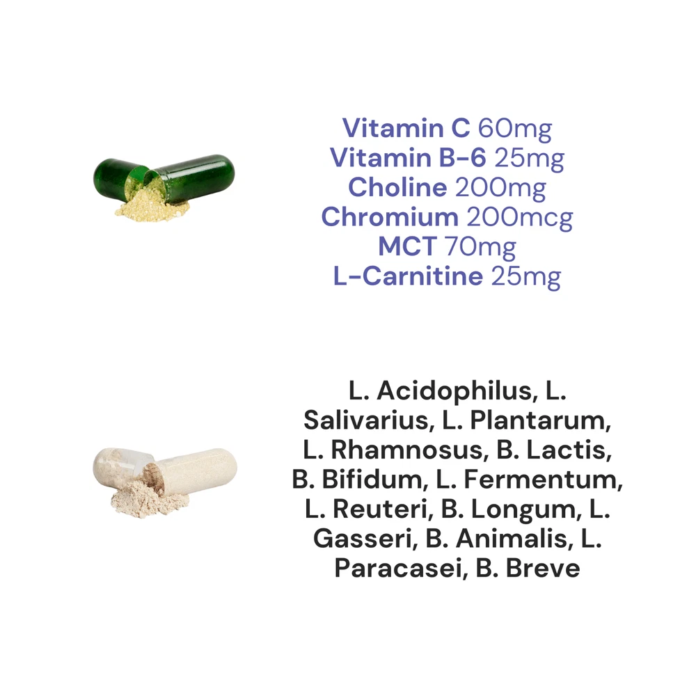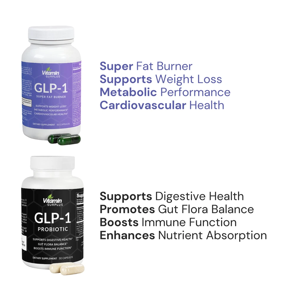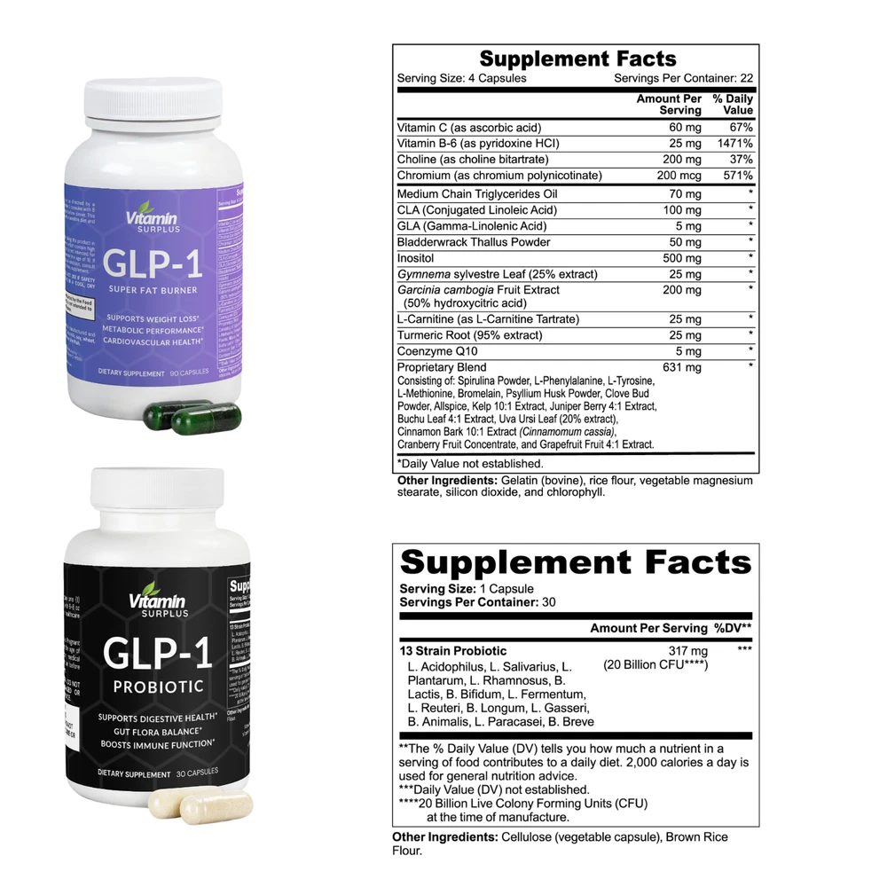 GLP-1 Weight Loss System - Super Fat Burner + Probiotic Support Supplement - Supports Weight Management, Appetite Control, Digestive Health, and Immune System - 120 Capsules Total - Gluten-Free, Non-GMO, Vegan Key Features: Comprehensive Weight Loss Support: Includes GLP-1 Super Fat Burner and Probiotic Support Supplement for a holistic approach to weight management. Supports fat burning, appetite control, and metabolic health. Advanced Fat Burner Formula: Features L-Carnitine, MCTs, and CLA to enhance metabolism and promote fat loss. Contains Garcinia Cambogia and Turmeric for appetite control and anti-inflammatory benefits. Probiotic Support for Digestive Health: Blend of 14 probiotic strains including L. Acidophilus, L. Rhamnosus, and B. Lactis. Promotes balanced gut flora and supports digestive comfort. Immune System Boost: Probiotics help maintain a healthy balance of gut bacteria, strengthening the immune system. Natural, non-GMO, gluten-free, and vegan ingredients. Quality and Convenience: Manufactured in the USA in a GMP-certified facility ensuring the highest quality standards. Easy-to-use supplements with clear instructions for daily use. Description: Achieve your health and weight management goals with the GLP-1 Weight Loss Bundle, a powerful combination of our GLP-1 Super Fat Burner and Probiotic Support Supplement. This bundle is designed to offer comprehensive support for weight loss, appetite control, digestive health, and immune system strength. GLP-1 Super Fat Burner: Our Super Fat Burner is formulated with a potent blend of vitamins, minerals, and extracts to enhance fat burning and metabolism. Key ingredients such as L-Carnitine and medium-chain triglycerides (MCTs) aid in weight loss, while Garcinia Cambogia and Turmeric help control appetite. The inclusion of chromium and Gymnema Sylvestre supports healthy blood sugar levels, making this supplement an essential part of your weight management regimen. Quantity: 90 capsules Suggested Use: Take 4 capsules daily with water, preferably with meals. GLP-1 Probiotic Support: Support your digestive and immune health with our advanced probiotic formula. Featuring 14 beneficial strains including L. Acidophilus, L. Rhamnosus, and B. Lactis, this supplement promotes a balanced gut flora and enhances overall wellness. Encapsulated in a vegetable cellulose capsule, our probiotics are 100% natural, non-GMO, gluten-free, and vegan, ensuring you receive only the best nature has to offer. Quantity: 30 capsules Suggested Use: Take 1 capsule daily with water for optimal results. Safety Information: Not suitable for children, pregnant or nursing mothers. Consult a healthcare professional before use if you have any medical conditions or are on medication. Avoid using in combination with other supplements high in chromium. Store in a cool, dry place. Keep out of reach of children. Enhance your health regimen with the GLP-1 Weight Loss System, crafted for those serious about managing their weight and improving metabolic and digestive health. These statements have not been evaluated by the Food and Drug Administration. This product is not intended to diagnose, treat, cure, or prevent any disease.