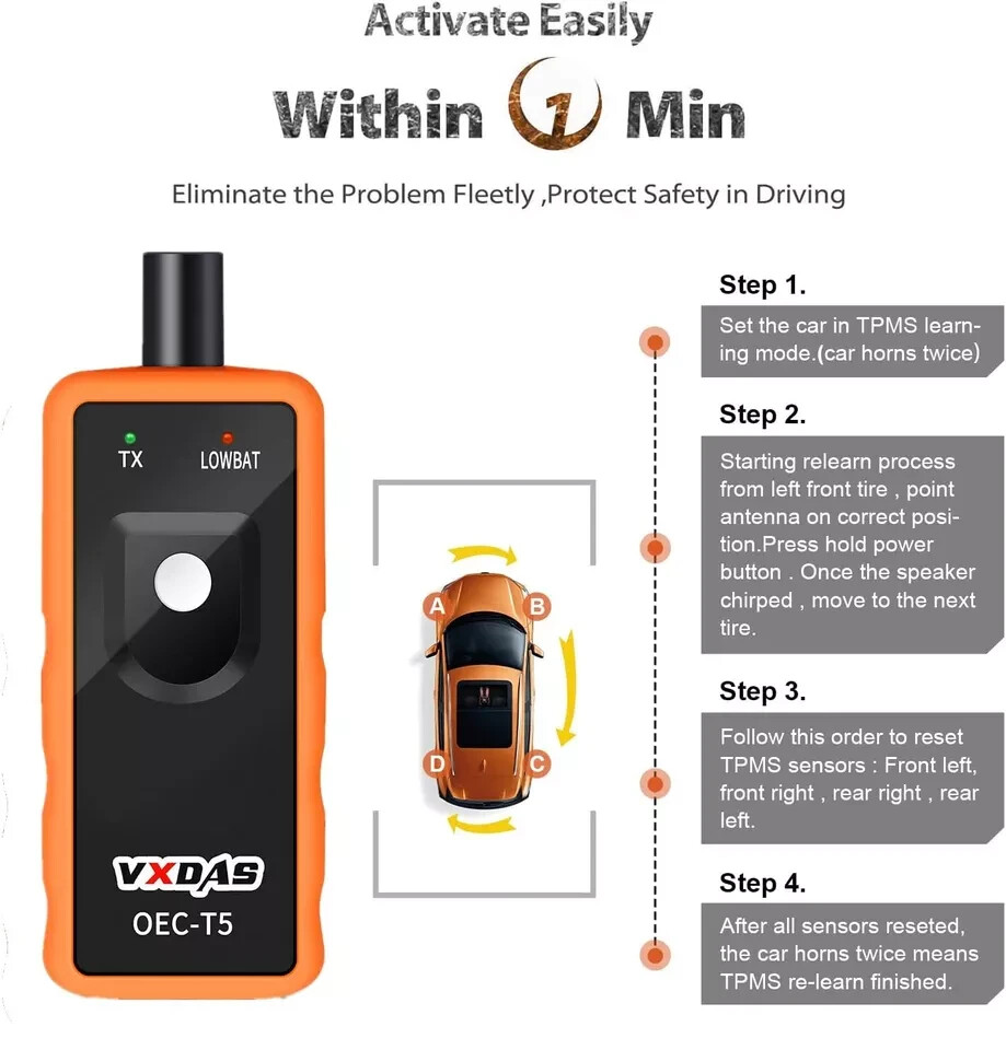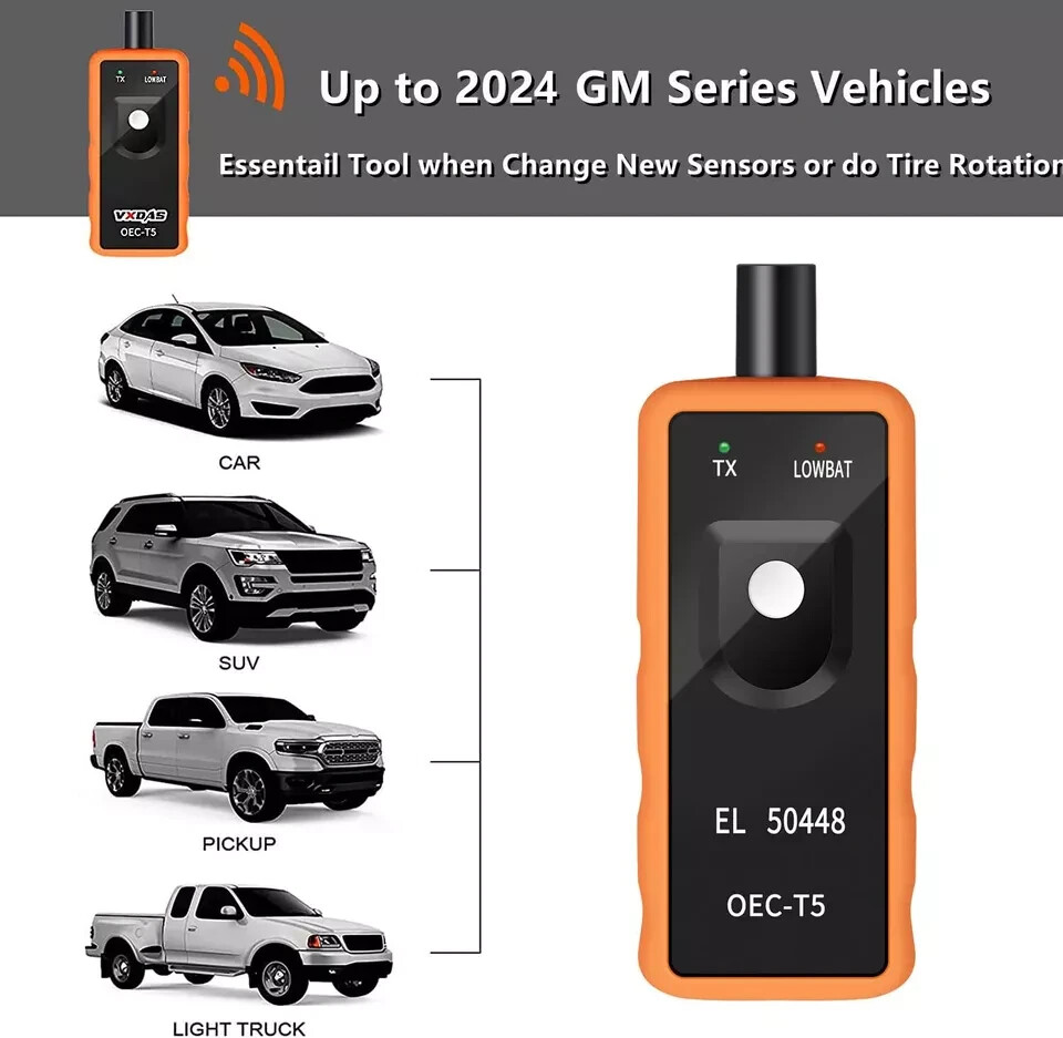 TPMS Relearn Tool for GM Tire Pressure Monitor System Sensor TPMS Reset Tool NEW Specification Style Silicone Cover Product Dimensions 1.57 x 6.38 x 2.68 inches; 2.08 ounces Size EL50448-GM Is Discontinued By Manufacturer No 6.38 inches x 1.57 inches x 2.68 inches. Weight: 0.13 lb Item Description 2024 UPDATED FOR WIDER COMPATIBILITY: Woks for most GM vehicles 2006-2024(Chevy / Buick / GMC / Opel /Cadillac and more) equipped with 315/433 MHz.(It is not suitable for heavy trucks with more than 4 tires or vehicles with an external TPMS system.) ESSENTIAL, EASY TO USE TOOL: This tire pressure reset tool is essential for replacing tire pressure sensors, removing tire pressure alarms or changing tires. Simply ensure your vehicle is in TPMS Learn Mode, hold the tool against the tire sidewall near the valve stem, and depress the Learn button! SUPERIOR QUALITY, SUPERIOR PERFORMANCE: Featuring a sensitive sensor chip for faster operation and an immersion gold process circuit board for stability. and Our GM TPMS relearn tool is made of silicone cover which is Detachable and resistant to falling SAVE TIME, SAVE MONEY: Tire pressure monitor sensor activation tool is quick, simple, and efficient. With a press of a button, activate your TPM sensors within 1-2 minutes, saving you trips to the dealer or a tire store Note:1. please make sure antenna in correct position. 2. Please make sure the 9v battery in good condition. 3.For Different vehicle EL50448 may need different times to reset all of your tire sensors after rotation.4.Sensors should be original OEM sensors which well programmed.5.for tire sensor reset, but sensor programming is not possible Product Description The video showcases the product in use. The video guides you through product setup. The video compares multiple products. The video shows the product being unpacked. Say goodbye to costly professional assistance and unnecessary trips to the auto shop! The VXDAS TPMS Relearn Reset Activation Tool is specifically designed for GM series vehicles (Chevy, Buick, GMC, Opel, Cadillac, etc.) from 2006-2024 equipped with a Tire Pressure Monitor System (TPMS) sensor. Exceptional build quality and durability for long-lasting use Friendly materials for a sustainable choice Vibrant orange color For easy visibility in the garage, ensuring it's instantly recognizable and dirt-resistant 1 Factory Tested Models 2 Customers Tested Models 3 Quality 4 Materials 5 Bright Why You Nedd VXDAS TPMS Do tire rotation, didn’t have a quick and easy way to let ECU relearn new tire information New TPMS sensors installed, letting air out or adding air in to the tire couldn’t make the system recognize new sensors Low tire pressure or leakage / replacement or installation of tire pressure monitoring equipment / tire replacement, sensor damage, etc. After those problems are solved, TPMS needs to be reset When the tire pressure indicator light is ON, after the maintenance is performed, the tire pressure needs to be reset to turn off the TPMS light Exchanging the winter tires or Summer tires Customer Experiences Placing a new 9V battery Set the car in TPMS learning mode. (car horns twice) Point antenna on correct position. Press & release power button. Follow this order to rest TPMS sensors: Front left, front right, rear right, rear left After all sensors reseted, the car horns twice means TPMS re-learn finished. Follow the Instructions to Relearn Your TPMS Sensors 1 Step1 2 Step2 3 Step3 4 Step4 5 Usage Tips Quality Carefully Please check the exact car model list to check whether your car compatible with vxdas tpms tool, more models will be updated in future after being tested! Tips before Using: Equipped with 315/433MHz tire sensor. And A 9V Battery is needed, but is not provided. Please make sure to use a Brand NEW 9V battery, the battery is not included in the package, and the magnitude of the battery voltage affects the signal strength of the product. Please make sure the antenna fits in the CORRECT position. The position of the tires is also important, Front tires have to be straight. Not for heavy trucks with more than 4 tires. The TPMS tool is unable to reprogram sensors, it's a tpms reset tool. Do the tire reset outside instead of in the garage. For different vehicles our tpms tool may need different times to reset all of your tire sensors after rotation. Sensors should be original OEM sensors which well programmed .and make sure your tire sensor is full charged or is under good conditions before use our TPMS tool VXDAS TPMaster VXDAS TPMS Relearn Tool for GM 60% MoreModel Applicable Models for GM Dual-Button Control 11.4 in³ Size 21.5 in³ for GM 60% MoreModel Applicable Models for GM Dual-Button Control 11.4 in³ Size 2.7 in³ for GM 60% MoreModel Applicable Models for GM Dual-Button Control 11.4 in³ Size 21.5 in³ for GM 60% MoreModel Applicable Models for GM Dual-Button Control 11.4 in³ Size 21.8 in³ VXDAS EL-50448 VXDAS TPNS19 VXDAS GL-50448 VXDAS TPA01