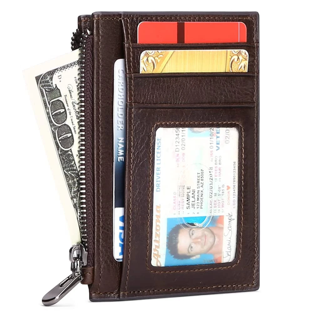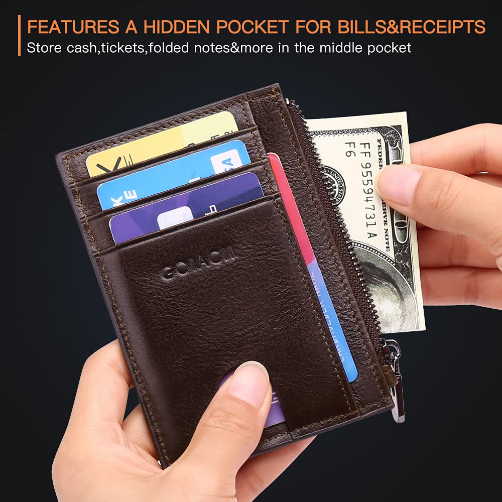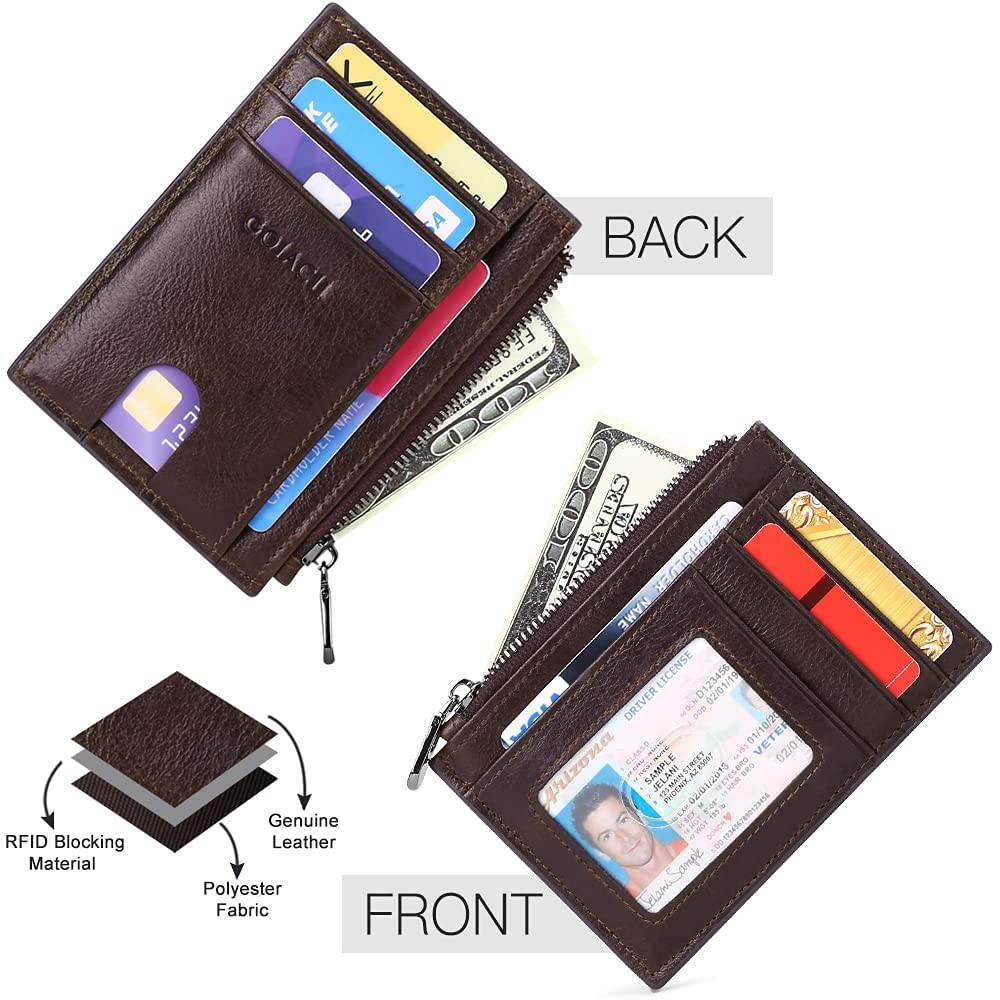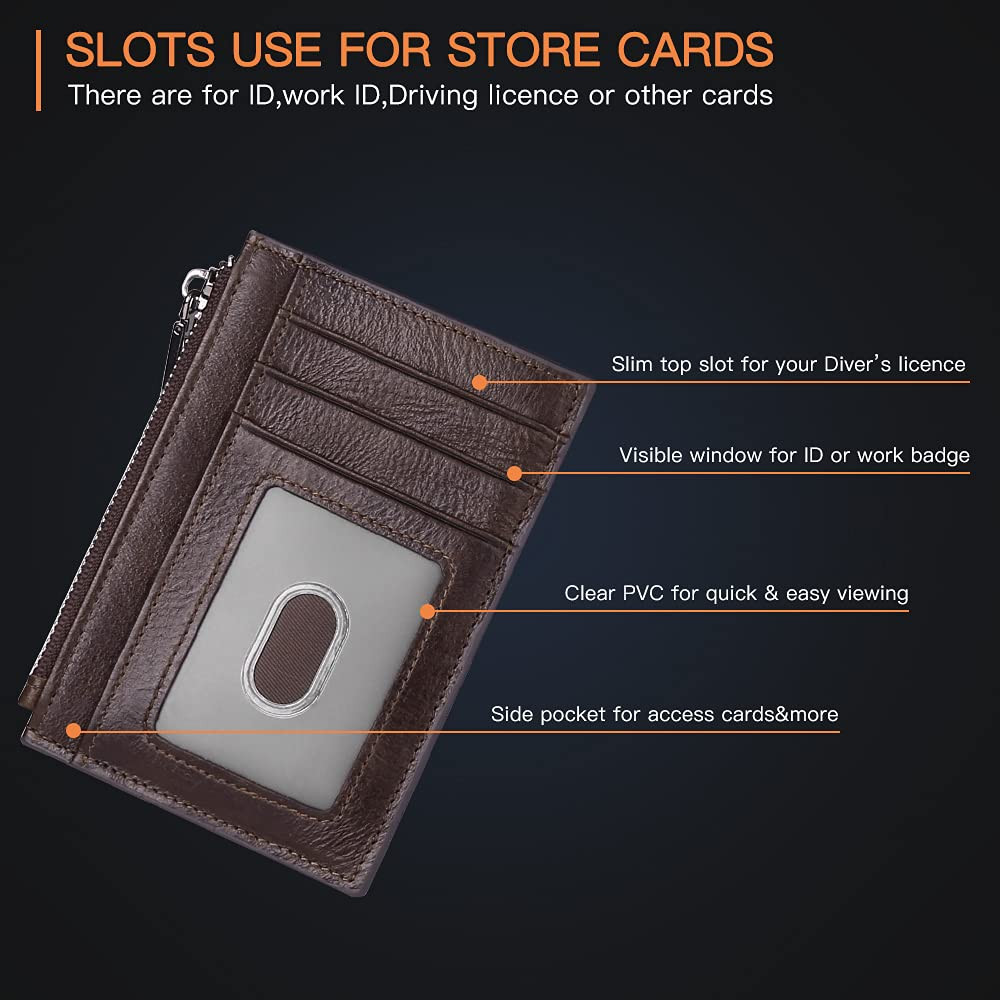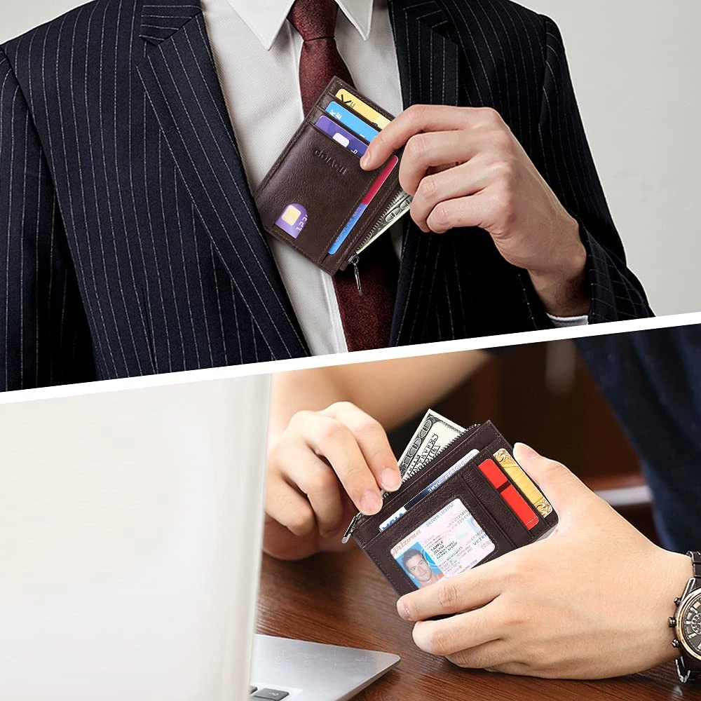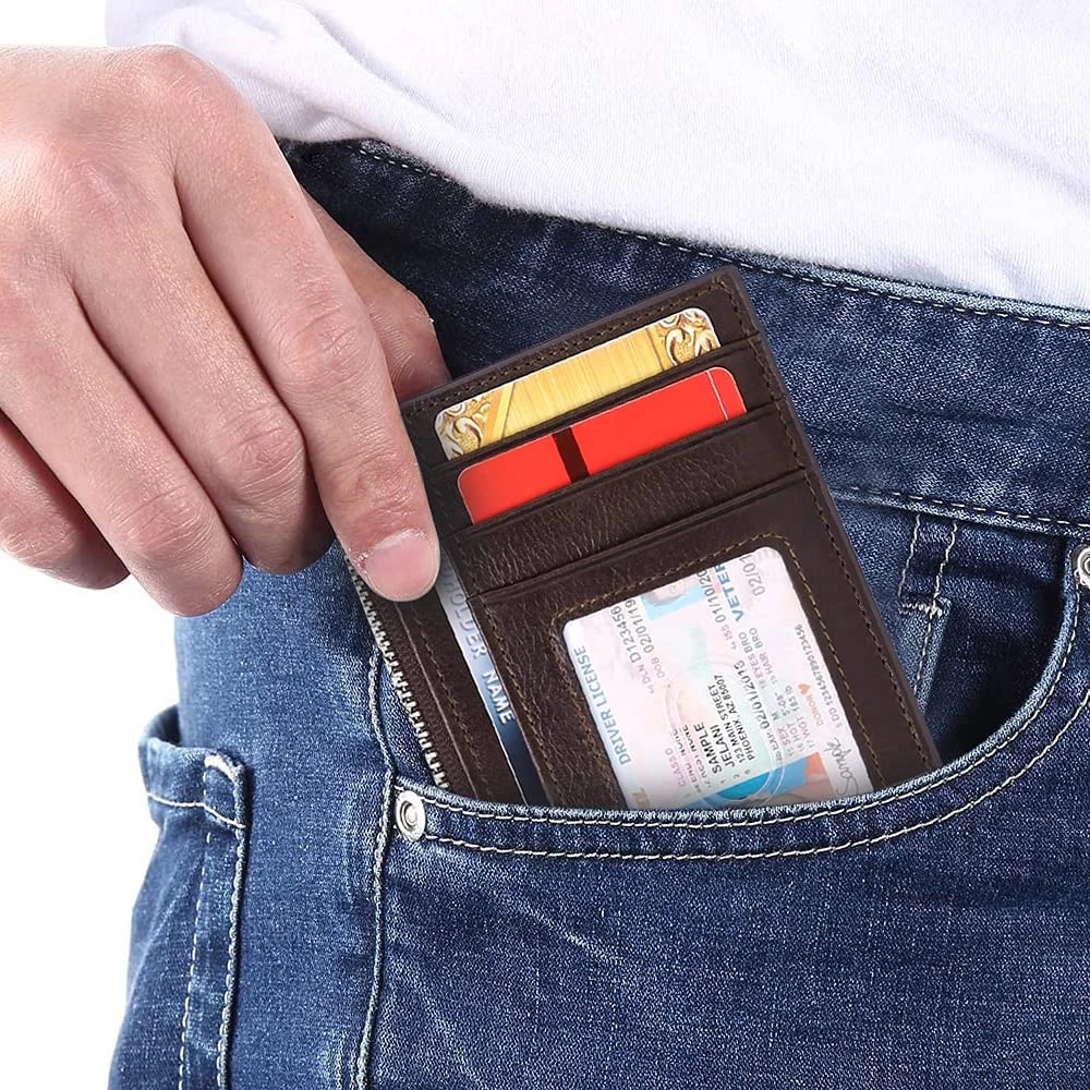 Description RFID-blocking wallets: The slim wallet can help to shield your cards from scammers. Convenient ID window: There is a finger hole for easily removing the front card. Lightweight & portable: It is a good choice for those who love the ultra-slim RFID-blocking wallet, especially minimalists and light travelers. Versatile enough for everyday use: The slim wallet features 7 slot compartments, which can hold all your needs. Great gift idea: Made of 100% genuine leather, well-crafted, comes in an exquisite gift box. Why do you need to use an RFID wallet? You need RFID protection to prevent thieves from using electronic devices to steal your personal information from driver's licenses, passports, and credit cards. What is RFID?RFID stands for Radio Frequency Identification. Chip-based technology is used in many roles by many industries and is commonly used in credit cards or passports for storing personal information. RFID Blocking interrupts and blocks the electromagnetic waves so that your data cannot be read by an unwanted RFID reader or scanner without your knowledge. 【Size, Ultra-thin, Lightweight and Portable】 🎄PLEASE MAKE SURE THE SIZE IS OK FOR YOU BEFOE YOU BUY. The thin wallet measures 4.7 x 3.3 x 0.2 inch. This front pocket wallet will perfectly fit in your front or back pocket. And it's easy to get credit cards and other cards in and out of slots. 【High-quality Genuine Leather Wallet with Zipper】 🎄The 💯 percent leather wallet is a thin-designed minimalist wallet with a zipper pocket to store bills and coins. In order to give you the best experience, we use high-quality pure leather that is softer, more breathable, and more durable. 【Secure RFID Wallets】 🎄Every card slot in our RFID BLOCKING wallet is equipped with advanced RFID blocking lining, which will protect the valuable information stored on RFID chips on the cards from unauthorized scans. 【Thin & Slim Wallet with Large Capacity】 🎄The slim wallet has spacious storage space to meet your daily needs: 1 front ID window, which can be used quickly when traveling, 6 card slots for storing credit or debit cards; and 1 slot for storing currency notes. 【Unisex, Ideal Gift】 🎄Our wallets are high on utility and durability, which make them perfect presents on Birthdays, Anniversaries, Graduation, Christmas, Wedding, Father's Day, Mother's Day or you name any occasion. 【Gift Box Included】🎄It comes with a presentable and beautiful gift box. It can be a perfect all-occasion gift for your near and dear ones. You will never be disappointed with your decision of buying and gifting it. Department name: mens Special features: Includes Card Holders
