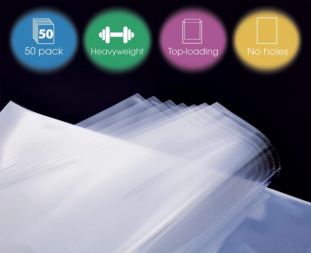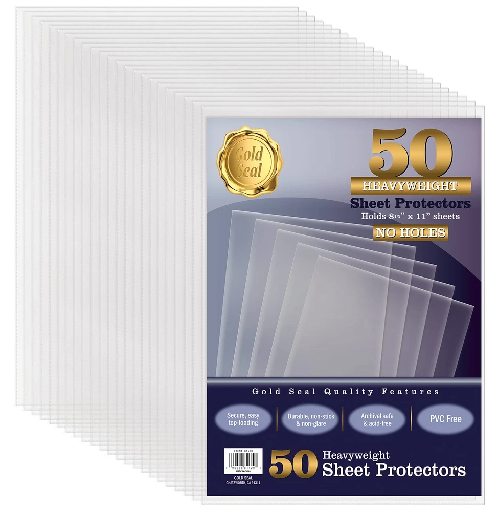 Bulk pack of heavyweight 0.08mm/3.2mil letter size sheet protectors with no side tab and no 3-ring binder holes; each frameless, streamlined sheet protector has a heat-welded side and bottom sea. Top-loading entry and clear view sheets to ensure your documents appear as intended, with no haze or yellowing. Archival safe, acid-free, non-stick and non-glare. Safe non-PVC polypropylene. BULK PACK - Heavyweight (0.08mm/3.2mil) letter size sheet protectors with no holes (no side margin to accommodate 3-ring binders); frameless, streamlined document protectors with heat-welded seams on one side and bottom CLEAR VIEW - Non-hazy, clear view sheets to present your documents in their true colors HEAVYWEIGHT - Thick 0.08mm/3.2mil polypropylene (PP) for utmost protection of your documents TOP-LOADING - Load documents from the top edge SUPERIOR QUALITY - Archival safe and acid-free, non-stick and non-glare