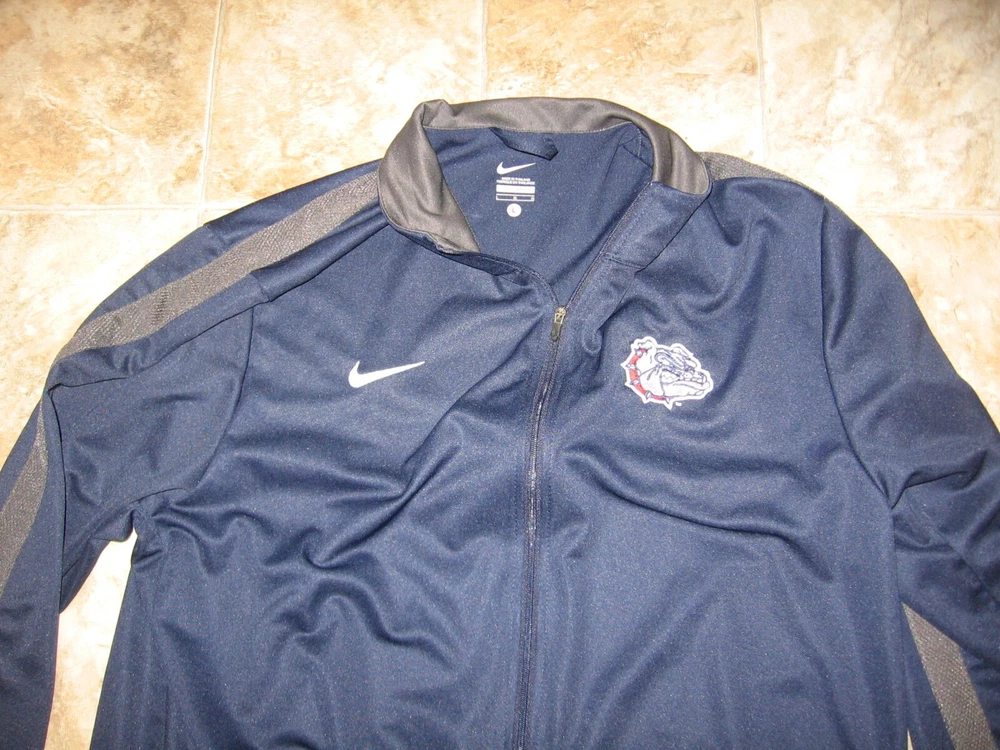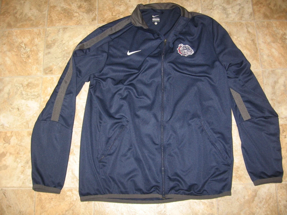 UP FOR AUCTION IS A GU ZIP UP JACKET BY NIKE, SIZE MEN'S LARGE, ARM PIT TO ARM PIT: 22", TOP TO BOTTOM: 29", 100% POLYESTER. THE LEFT CHEST HAS AN EMBROIDERED NIKE LOGO, THE RIGHT CHEST HAS A SEWN ON GU PATCH. THE FRONT OF THE JACKET HAS TWO ZIPPERED POCKETS.