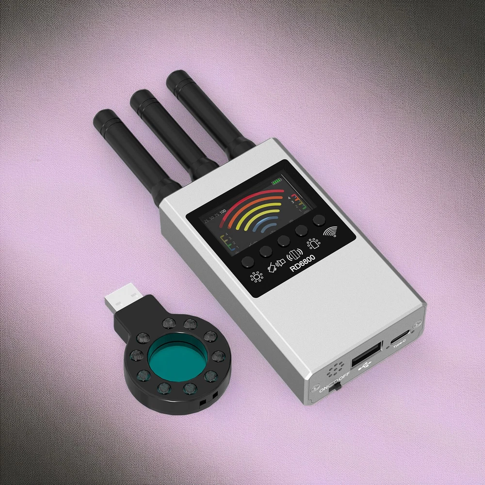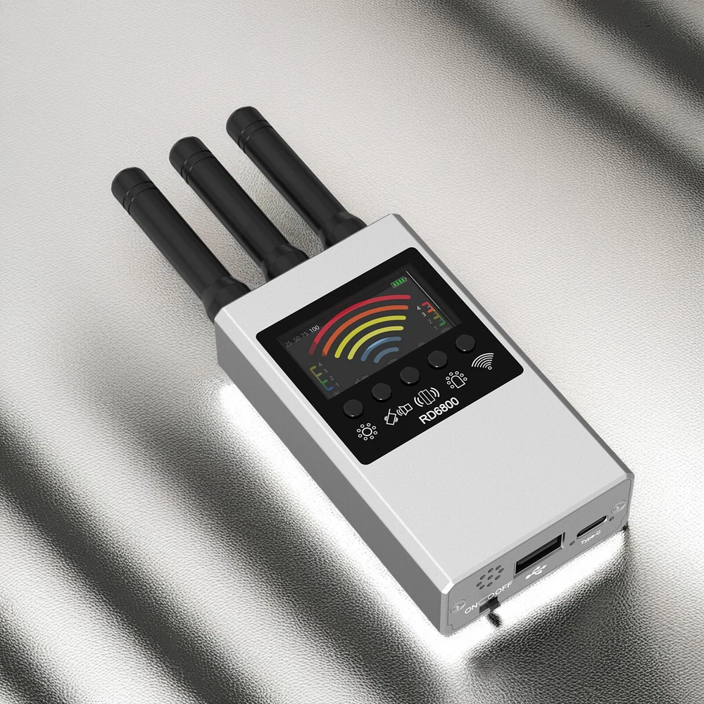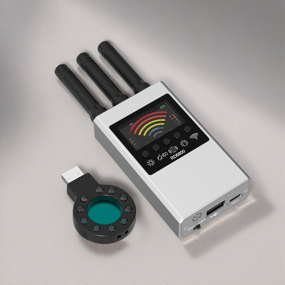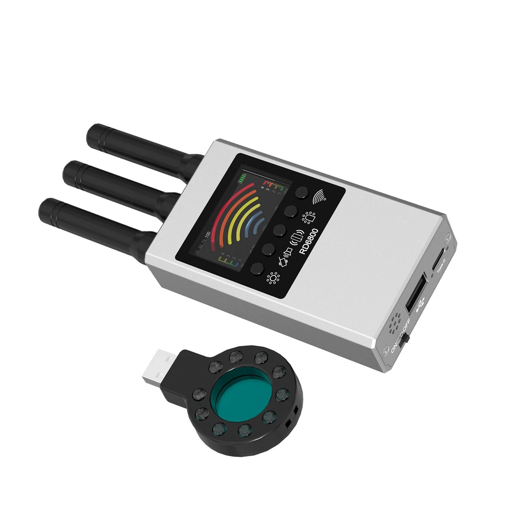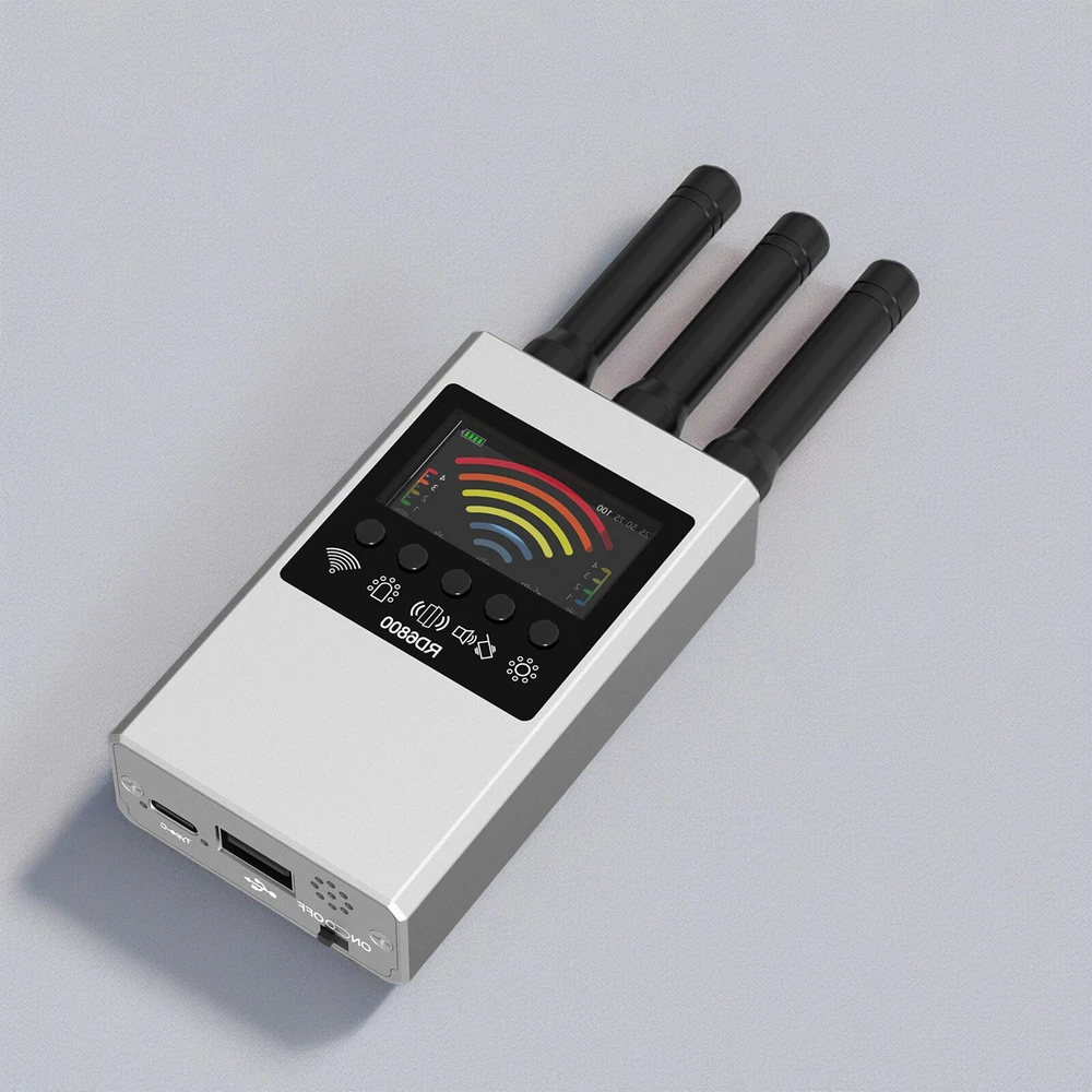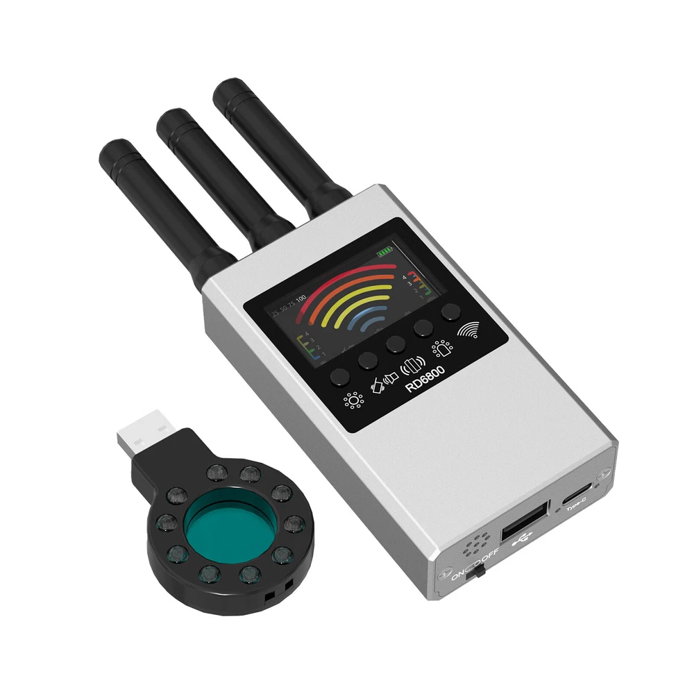 Product Description Features: 1. Digital control high sensitivity professional wireless detection device, used to detect 300-2700MHz. 2. Easy to use, with two alarm methods: sound vibration and LED indicator light, accurate and reliable. 3. This device can detect 2G, 3G, 4G and wireless devices, 1.2G/2.4G&5.8G wireless cameras, and accurately locate GPS. 4. It can detect whether private addresses such as rooms, bedrooms, meeting rooms, fitting rooms, hotels, cars, entertainment venues, etc. have been installed with listening devices or secretly filmed with mini cameras, and whether mobile phone cards are inserted for eavesdropping Micro camera with storage card, mobile undercover software, GPS car tracker. 5. Compact body, easy to carry. 6. In complex environments, it can effectively filter out clutter interference from signals and accurately capture stable signal sources for analysis. By adjusting sensitivity with buttons, the direction and distance of the signal source can be determined. 7. Simple design, full button operation, separate display of signal strength and sensitivity, allowing users to quickly get started. Product details: Frequency range: 300MHz-2700MHz Detecting dynamic range:> 73db Indication method: 10 level LED illuminated indication Variable tone indication Power supply: Built in 3.7V 1000mAh lithium battery Working current: 60mA Continuous work: 8-12 hours Detection sensitivity:< 0.03mw Detection range: 5.8G: 15 square meters (standard 10MW) 2.4G: 10 square meters (standard 10MW) 1.2G: 10 square meters (standard 10MW) Mobile signal 2G/3G/4G: 15 square meters Material: Metal This product supports USB interface camera lens scanning detector, 10 infrared lights super bright detection, covering a long distance, and the lens reflection point is clear and visible, making it easy to see the pinhole lens reflection point 5 meters away The camera lens detector can be plugged into any portable power bank, powered by a USB port on a power bank, plug and play, and quickly used The camera lens scanner supports connecting to our company's detector G338 G368 G638 G738 G768 RD6800 RD6800W RD6800M RD6800MW for plug and play and quick use