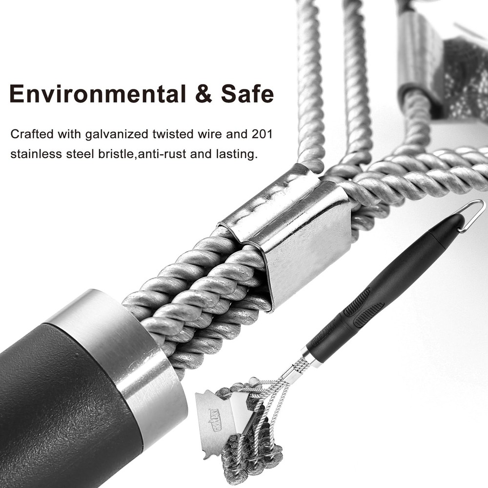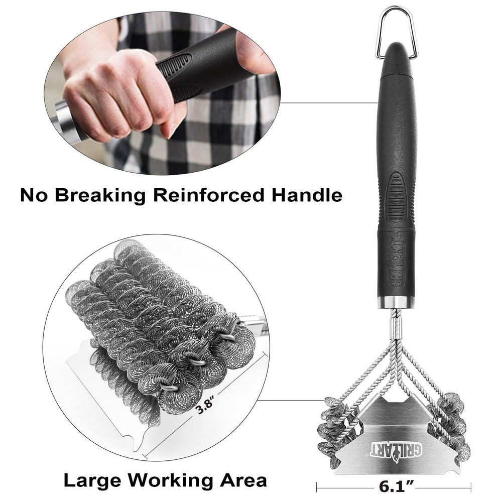 【The Safest Bristle Free Grill Cleaner】:No wire bristles at all, no melting like nylon grill brushes; With this safe grill brush and scraper, your food will stay 100% Bristle Free. No more worry about swallowing some metal pieces, Let's free to gobble up some favorite barbecue! Save your effort and time, let’s just have fun! (PATENTED design) 【The Cleaning Helper - with a Wide Scraper】: You'll be surprised by the efficiency of a grill scraper. You may Strong scrape and clean more areas in less time. This grill cleaning brush build in a Wider scraper. Want to save you tons of effort and valuable time? Take this grill grate cleaner home! To Be Honest, all bristle free grill brushes can’t promise you get your job done in seconds, but Will This Be The Exception? 【Upgraded for All Grill Types】: 125% more flexible upgraded helix can easily reach and clean the Hard-to-Clean sides of grates, not just the front. Whether you have a gas, charcoal, smoker, porcelain, infrared grill or other types like Weber grill or Foreman grill, your grates will be looking brand new in no time by using our grill grate cleaner 【Built to Last】: 120% more rigid triple helix than other safe grill brush bristle free, ensuring its feature of Long Lasting. Tough plastic handle with a better grip, protects your hands from burning and ensures it will not bend or snap PS, all bristle free type brushes may not have the same cleaning efficiency as wire brushes, but they completely win in safety; You may want to carefully consider which point can better satisfy your needs before purchase; In order to achieve the best cleaning results, please follow the cleaning tips correctly and replace the brush in a timely manner.