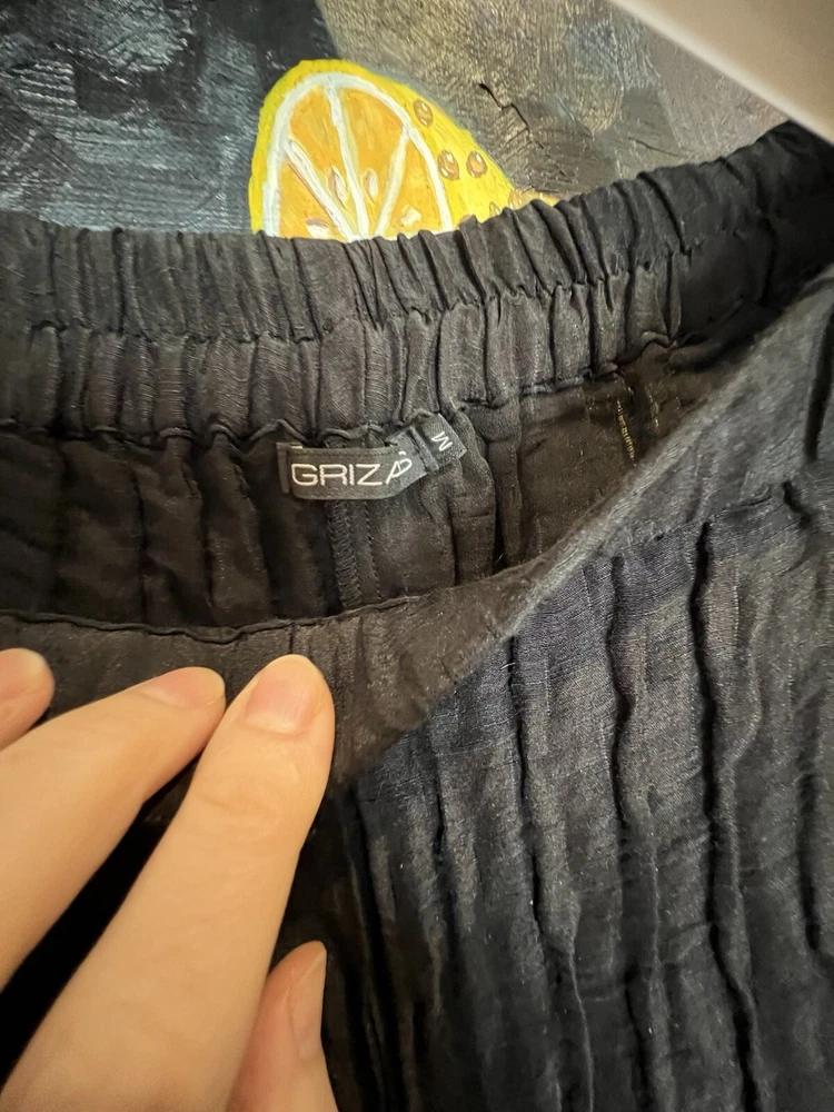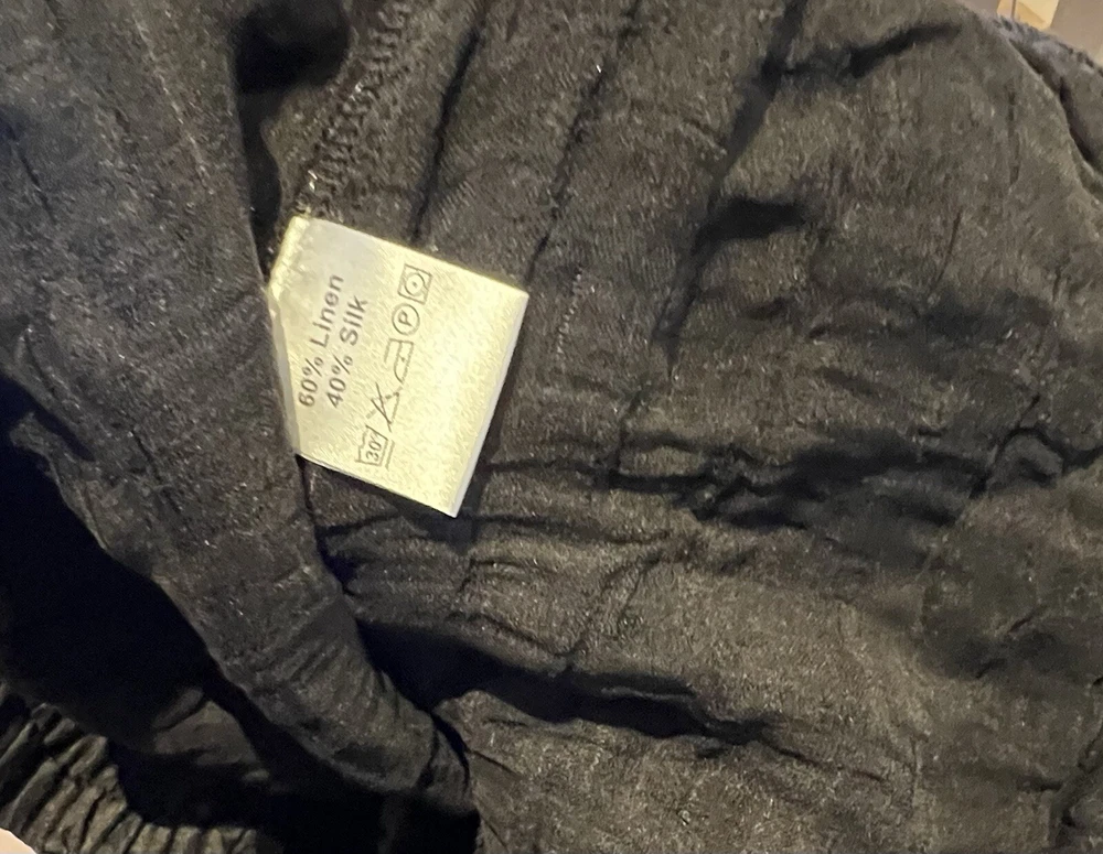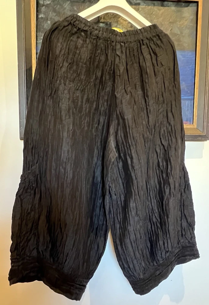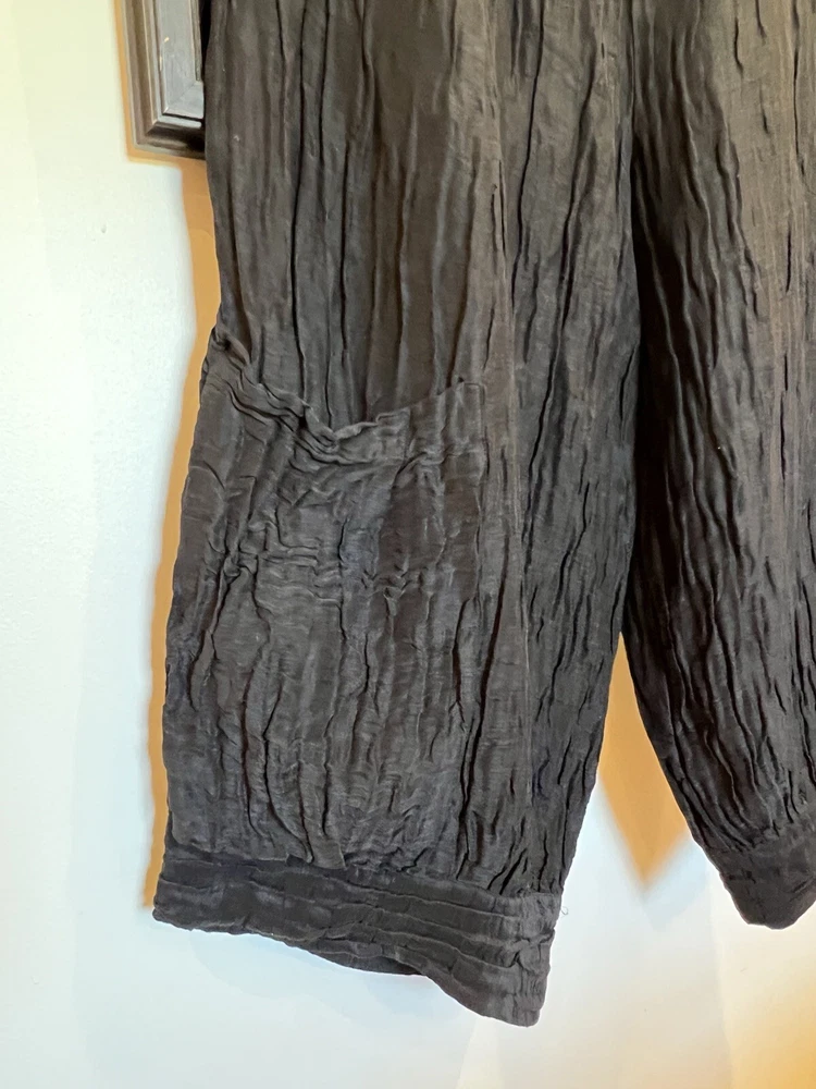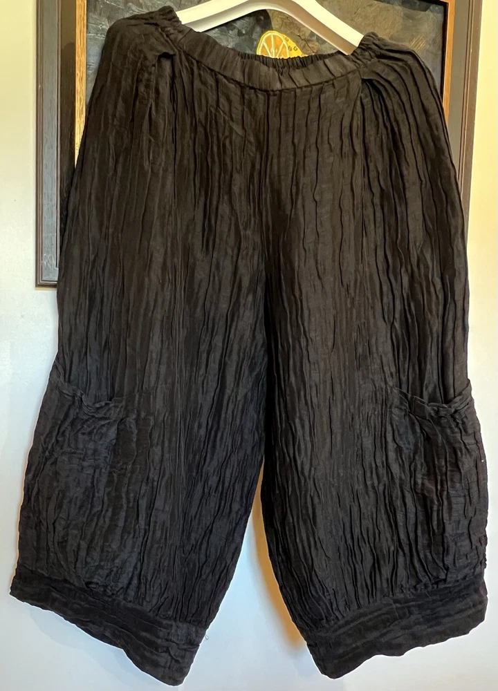 GRIZAS Women 60% Linen 40% Silk Pants are designed with a wide-leg, relaxed fit and a high-rise elastic waist, making them comfortable for casual wear or travel. The pants feature a solid black color in a chambray fabric with lage pockets for added style and convenience. Made of a linen and silk blend, these oversized pants are perfect for a relaxed and chic look in size Medium with a 30” to 40" (max stretch) waist size. Excellent condition. Please check my other listing for a matching blouse.