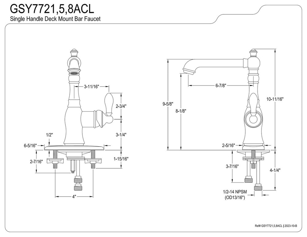 Solid brass construction for durability Deck mount installation Drip-free ceramic disc cartridge 1/2-14 NPSM connection 1.8 GPM/6.8 LPM spout flow rate at 60 PSI
