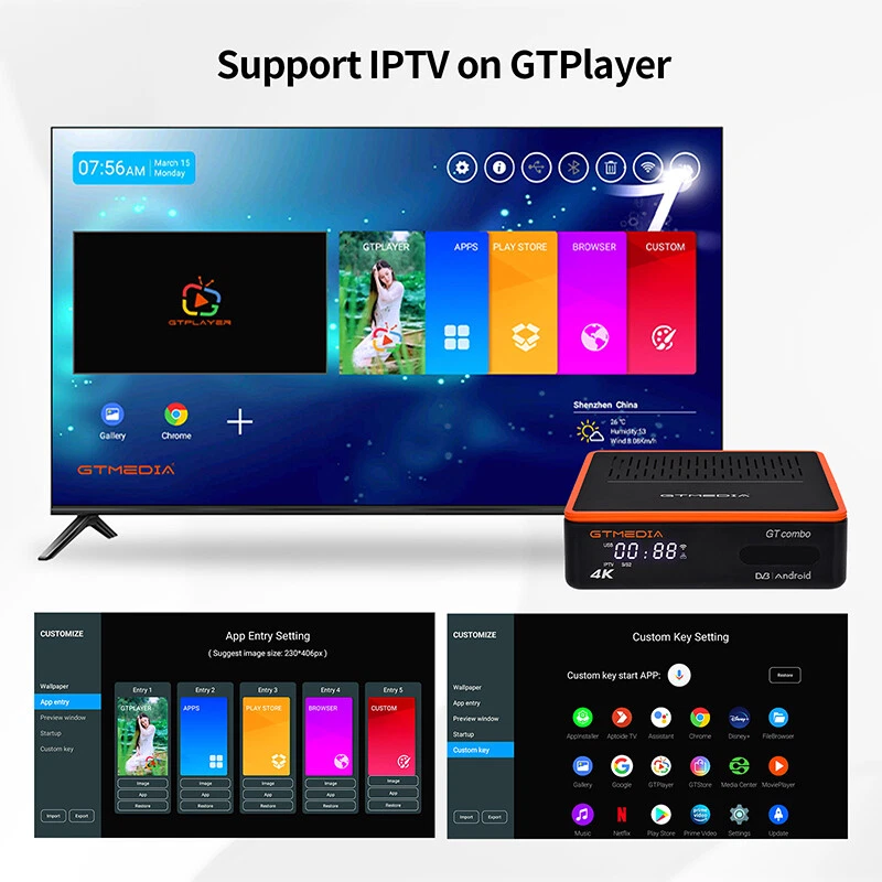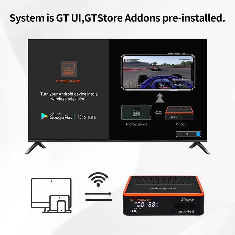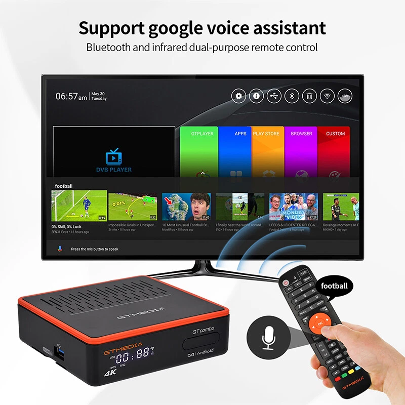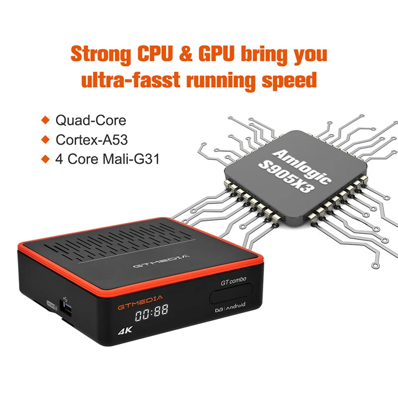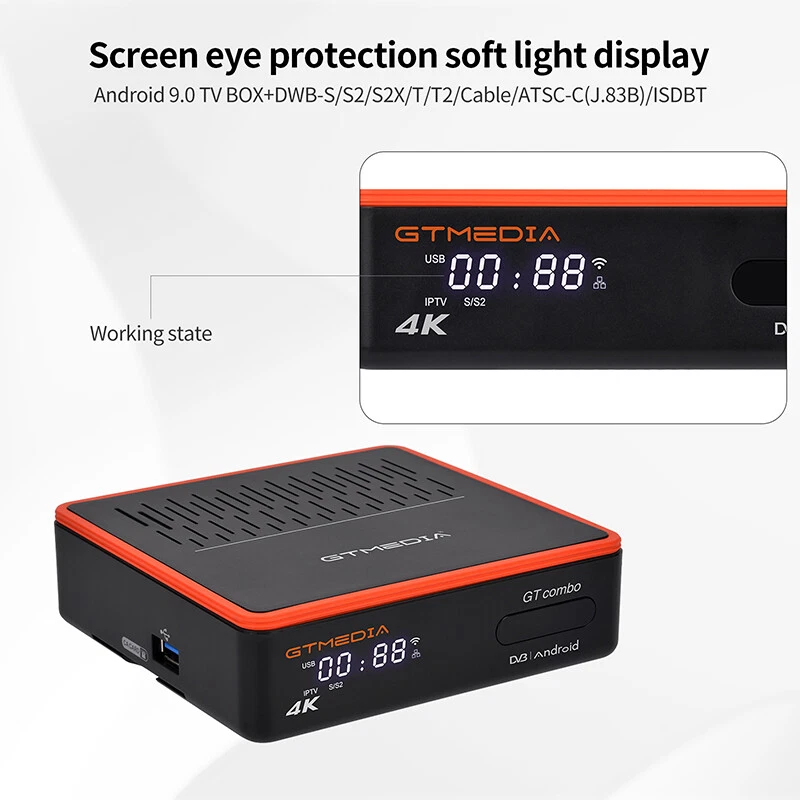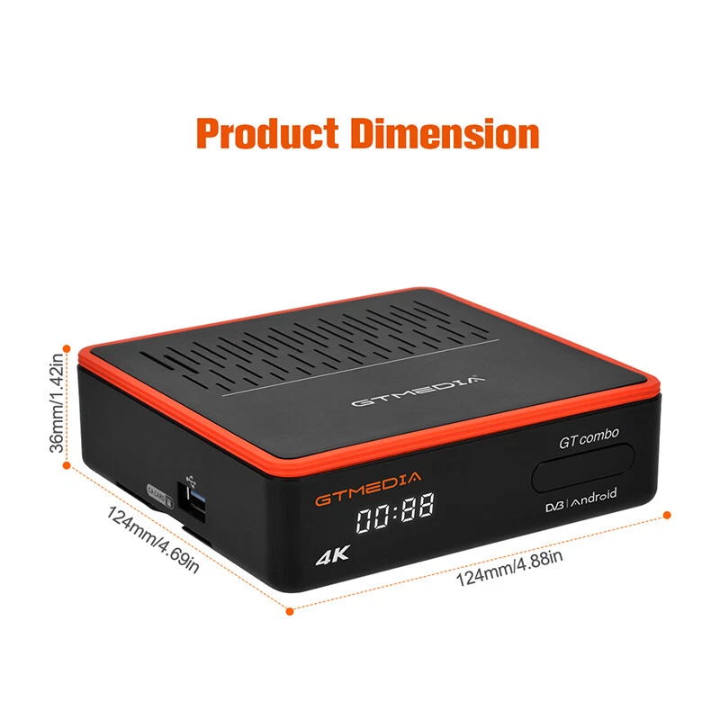 Android 9.0 TV BOX+DVB-S/S2/S2X,DVB+T/T2/Cable/ATSC-C(J.83B)/ISDBT 1.Android 9.0 TV BOX+DVB-S/S2/S2X,DVB+T/T2/Cable/ATSC-C(J.83B)/ISDBT, AVS+, HEVC main 10 profile(10bit), AUTO BISS, T2MI, YUV422; 2.Amlogic S905X3 2GBRAM +16GBROM; 3.Support 4K ultra-high definition display and decoder, Dual-core MIPS75Kf processors; 4.Support Unicable, DiSEqC1.0/1.1/1.2/USALS Motor fully support; 5.Support Full PowerVu, DRE &Biss key; AUTO BISS; 6.Built-in Wifi 2.4G/5G+BT4.1, 802.1.1b/g/n/ac; 7.System is GT UI, GTStore Addons pre-installed. Netflix, Youtube, Prime-Video, Disney Plus, Online movies, etc.; 8.Support IP-TV on GTPlayer, SAT2 IP, GTshare APP; 9.Support CC-CAM, NEW-CAM, MG-CAM, and CA card decoding; Note: We reserve the right to change the design and OEM/ODM supported. Specifications CPU: Amlogic S905X3, 64-bit quad core ARM Cortex A55 CPU up to 2.0GHz(DVFS) GPU: Daul-core Mali-G31 MP2, up to 850M (DVFS) RAM: 2G DDRIII ROM: 16G EMMC 3D Graphics: OpenGL ES 1.1/2.0 and Open VG 1.1 support Video Decode: 4KP75 10B, H.265,VP9 Profile 2 , AVS2 4Kp30 H.264, MPEG-4, DIVD/DIVX, Real8/9/10, RM,RMVB, PMP, FLV, MP4, M4V, VOB, WMV, 3GP, MKV 8KH265_Main10@L6.2@Main_7680x4320_24fps_30.9Mbps_10bit_AAC2ch]Sanaipei_Tande_Amina-NIo74zd6Nn4.mp4 8KVP9_7680x4320_23.976fps_22.2Mbps_8bit_opus2ch]World's_Best_Jump_Roper-Hawaii_Style_in_8K-nCBwEaB1eQU.webm Audio Decode: Stereo DACs, 2x I2S in, 8x I2S out, 8x DAIC, MPEG1 layer I, MPEG1 layer II, MPEG1 layer III, MPEG2 AAC, MPEG4 HE-AAC,Dolby+ Panel display: 4-digit white LED display,With multiple function indicators LED Indicator: Power ON - Green; Standby - Red Button: NOT Wifi: Built in 2.4G/5G WiFi Support IEEE 802.1.1b/g/n/ac Blutooth: BT4.1 IR: Bluetooth and infrared dual-purpose remote control Rear Panel: ANT IN ( EC-type IEC169-2 Female) LNB IN (Frequency Range950MHz to 2150MHz) HD OUT(HDMI2.1 , 8Kx4K@24 max resolution output ) 1*USB2.0+1*USB3.0 HOST 1*TF CARD 1*SPDIF 1*RJ45 1*CA Card Power (DC 12V/1.5A) 【DVB-S/S2 specifications】 System standard: ETS 302 307 Frequency Range: 950~2150MHz for DVB-S/S2/S2X baseband demodulator LNB Power and Polarization: DiSEqC1.0/1.1/1.2/USALS Motor fully support, Support Unicable, 13/18V DC @ 400mA MAX, 22KHz±0.4KHz(0.6V±0.2V)tone,Overload Protection Input Level Range: -80dBm ~ -20dBm (average power) Symbol Rates: DVB-S QPSK,DVB-S2 QPSK/8PSK/16APSK/32APSK, DVB-S2X QPSK/8PSK/16APSK/32APSK/64APSK Forward error correction rate: 1/4, 1/3, 2/5, 3/5, 2/3, 3/4, 4/5, 5/6, 8/9, 9/10 Carrier frequency acquisition range: ±5MHz for symbol rates above 3 Msps and ±3MHz for the remaining symbol rates Symbol range: QPSK/8PSK/16APSK 56M, 32APSK 49.6M, 64APSK 41.3M Roll-off factors: Roll-off factors for pulse shaping: 0.2, 0.25 and 0.35 Code Rates: 1/2, 2/3, 3/4, 5/6, 7/8 for DVB-S, 1/4, 1/3, 2/5, 1/2, 3/5, 2/3, 3/4, 5/6, 8/9, 9/10 for DVB-S2, DVB-S2X Normal Frame and Short Frame FEC code rates Features: Supporting CCM/VCM/ACM, PLHEADER Scrambling (AMC), Integrating LDPC and BCH decoders ANT. Connector: Connector:IEC TYPE F Input Impedance:75 Ω 【DVB-T/T2 specifications】 System standard: ETSIEN 302 755 Frequency Range: VHF: 174~230mhz, UHF: 470~862mhz for DVB-T/T2 Demodulation: COFDM,16QAM,64QAM,256QAM Bandwidth model: 6MHZ,7MHZ and 8MHZ Country: Italy, Poland, Russia, Spanish, Sweden, United Kingdom, Germany,Greek, Slovenia, Argentina, Australia, Denmark, Finland, France, England, Brazil, Chile, Peru, Colombia, India, Georgia, Indonesia. FEC Code Rate: 1/2, 3/5, 2/3, 3/4, 4/5, 5/6 FFT: 2K and 8K Guard interval: 1/4, 19/256, 1/8, 19/128, 1/16, 1/32, 1/128 Input Signal level: Min -80dbm max -20dbm (64QAM,8K 1/8,7/8) Antenna Power: 5V DC@150mA MAX ANT. Connector: IEC 169-2, female. Input Impedance:75 Ω 【ISDB-T specifications】 System standard: ISDB-T broadcast (1, 3, 13 segment),MPEG-2/MPEG-4 AVC/H.264 HD/SD Video , DiVX Frequency Range: VHF:177.143~213.143 MHz:UHF 473.143~803.143MHz Country: Brazil and Japan FFT: 2K/ 8K/32K Demodulation: QPSK / 16QAM / 64QAM/QPSK or DQPSK+ FEC Code Rate: 1/ 2, 2/3, 3/4, 5/6, 7/8 Automatic Guard interval: 1/4,1/8,1/16,1/32 【DVB-Cable specifications】 Frequency Range: 50--858MHz For DVB-Cable (J.83A/B/C) Demodulation: 16QAM,32QAM,64QAM,128QAM,256QAM FEC Code Rate: 1/2 , 2/3 , 3/4 , 5/6 , 6/7 or 7/8 Input Signal level: Min -80dbm max -20dbm Country (ATSC-C): U.S.ATSC Cable STD/U.S.ATSC Cable IRC/U.S.ATSC Cable HRC for ATSC-C Sortware Features Standard: Fully comply with DVB-S/S2/S2X (SCPC and MCPC receivable from C/Ku band satellite), DVB-T/T2/Cable(J83.A/B/C)/ISDBT, MPEG-2/4 H.265 Standard Channel Search: Supports Automatic network search for newly added transponders, and Supports NIT Search for DVB-T/Cable. Channels Number: 10000 channels TV and Radio programmable Channel: Recording one channel, can view another channel under the same TP,Various channel editing function(favorite,move,lock,skip,delete,rename,find,sort) Favorites: 8 different favorite groups selection OSD Multi-language for options: Arabic, Catalan, Czech, Dansk, Deutsch, Eapanol,English,Euskar,Farsi,French, Finnish,Galego,Greek,Hrvatska,Italian,Magyar,Nederlands, Polska,Spanish,Slovakian,Svenska,Portuguese,Russian, Ukrainian,Turkish,Thai and etc.) EPG: Fully support to 7 days Electronic Program Guide(EPG) OSD Color: 256 color/32-bits OSD with anti-flickering Parental Ctrl: Parental control for channels Easy Menu: Plug and Play installation, with an easy to use Menu System PAL/NTSC: Automatic PAL/NTSC conversion Subtitle: support DVB EN300743 and EBU Teletext: support DVB ETS300472 by VBI and OSD Time Set: Time set by GMT offset automatic and manual,Summer Time support Timer: 5 event timers,off/Once/Daily/Weekly Mode USB 3.0/2.0: Support FAT/FAT32/NTFS big capacity hard disk PVR Option: USB for PVR,TIMESHIFT,media files playback Media Codec: S/MPG/MKV/AVI/ASF/FLV/MP4/WMA/WMV/VOB/MOV/DAT/SRT/SUB/BMP/JPG/JPEG/GIF/PNG/M4A files Audio Codec: WMA,MP3,AAC (wma,mp3,m4a) Photo Codec: JPEG,BMP,PNG,GIF Supported SoftUpgrade: Software upgrades 