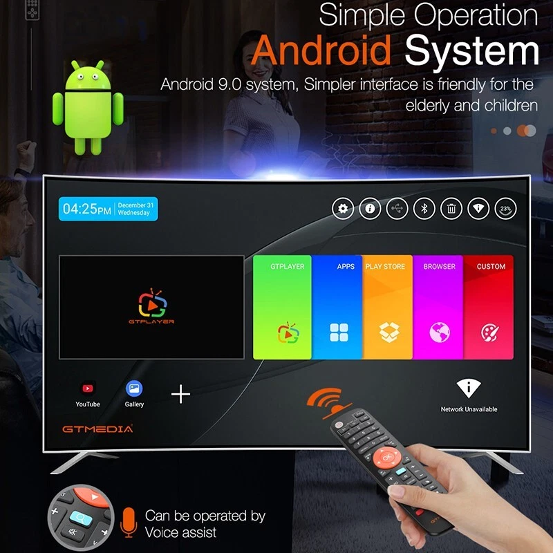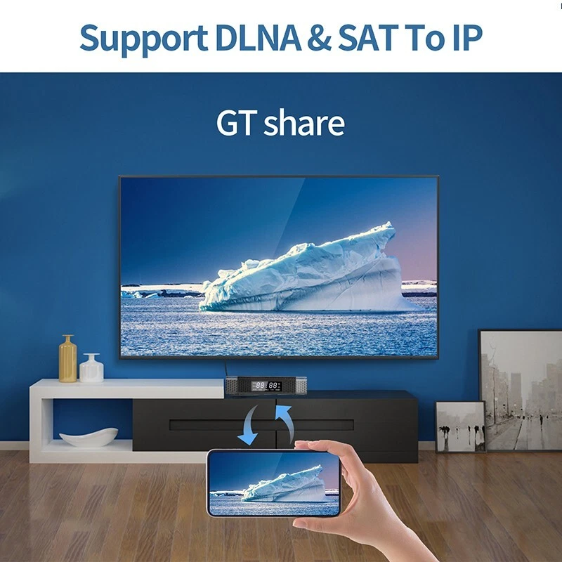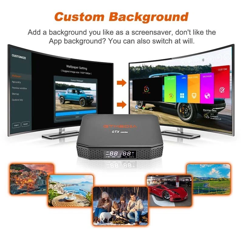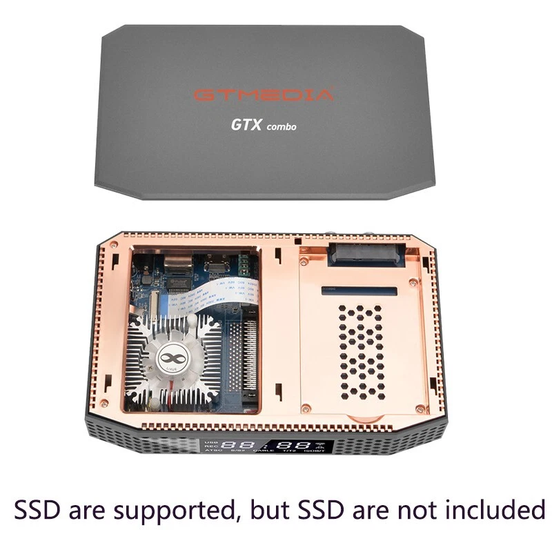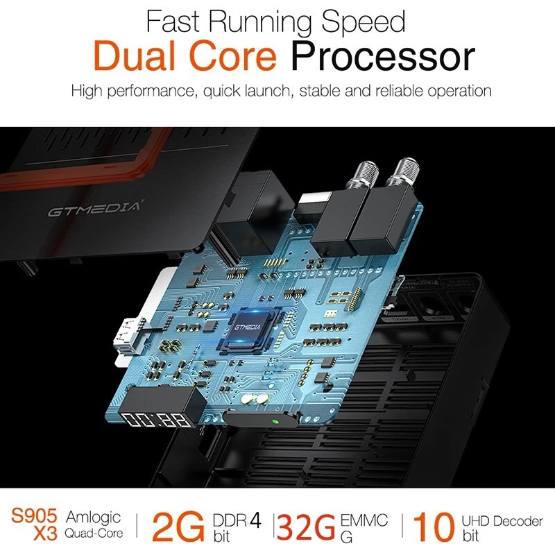 Experience high-quality satellite TV reception with the GTMEDIA GTXCOMBO 8K FTA Satellite Receiver. This HD digital TV box features a Dual Core processor and supports DiSEqC Levels 1.2, ensuring smooth and efficient performance. It has a maximum resolution of 4320p and can play MPEG-4 media formats, making it an excellent addition to your entertainment system. The GTMEDIA GTXCOMBO also comes with a range of features, including Google Assistant, Wi-Fi and Bluetooth connectivity, Ethernet Port, and USB Port. It has a storage capacity of 32 GB, and you can upgrade its firmware to keep it up-to-date. With Surround Sound Formats such as MPEG Audio, you'll enjoy an immersive viewing experience. Get your hands on this second-generation GTMEDIA TV Box and enjoy unlimited entertainment. Main Feature ▶️ [DVB + Android combo box] can receive Satellite DVB-S/S2/S2X , Terrestrial DVB-T/T2 and Cable DVB-C , ATSC-T,ISDBT and supports the use of Android 9.0 . 8K H265_Main10 decoder, 4K display. ▶️ [Bulit in app] TV Box can use/download app what you want. ▶️ [Bluetooth voice smart remote control] Bluetooth smart voice remote control, supports input of various languages; it will not be affected by obstacles during use, and it can be controlled without pointing the device; the use distance is more than 10 meters; ▶️ [2.4G/5G WiFi + ETHERNET] Built-in 2.4G/5G Wi-Fi or Ethernet (10M/100M/1000M), and also supports 3G/4G USB dongle. After connecting to the Internet, GTPALY is supported, and you can watch Youtube, movies, competitions, etc. ▶️ [SAT> IP and 4:2:2] Download the "GTshare" APP to your mobile phone, tablet or PC, and you can watch satellite TV programs on your mobile device. Support watching different programs at the same time, all devices are on the same network. Let you watch the game easily; ▶️ [SATA-HDD bracket ] With the built-in SATA-HDD bracket, you can open the upper cover of the receiver yourself (snap design, very easy to open), and then place your solid-state hard disk for recording programs. ▶️ [PVR] (Personal video recorder: record and play through its USB 2.0 port, support FAT32 / NTFS format large-capacity hard disk or U disk) and time shift function (real-time pause), parental control, EPG graphics function, multimedia, etc. ▶️ [Multi-room] GTMEDIA GTcombo's "multi-room" function can share the GTCOMBO decoded smart card channel with other receivers in the house, regardless of whether other receivers have a smart card inserted. ▶️ [GTPLAY] The device supports GTPLAY, which allows you to watch more easily; ▶️ 【Package】 1X GTX COMBO Receiving box 1X Voice Bluetooth Smart Remote Control 1X HDMI cable 1X Adapter(US Plug) 1X User Manual Hardware CPU: Amlogic S905X3, 64-bit quad core ARM® Cortex™ A55 CPU up to 2.0GHz(DVFS) GPU: Daul-core Mali-G31 MP2, up to 850M (DVFS) RAM: 2GB DDR4 ROM: 32GB EMMC 3D Graphics: OpenGL ES 1.1/2.0 and Open VG 1.1 support Video Decode: 8KH265_Main10 L6.2, 8KVP9, 4KP75 10B, H.265,VP9 Profile 2, AVS2 4Kp30 H.264, MPEG-4, DIVD/DIVX, Real8/9/10, RM,RMVB, PMP, FLV, MP4, M4V, VOB, WMV, 3GP, MKV Audio Decode: Stereo DACs, 2x I2S in, 8x I2S out, 8x DAIC, MPEG1 layer I, MPEG1 layer II, MPEG1 layer III, MPEG2 AAC, MPEG4 HE-AAC,Dolby+,DTS Panel display :4-digit white LED display,With multiple function indicators SATA HDD : 2.5 inches SATA HDD bracket(optional) LED Indicator : Power ON :Green; Standby :Red;Remoter:Green blinks Button : NOT Wifi : Built in 2.4G/5.0G WiFi Support IEEE 802.1.1b/g/n/ac Ethernet : 10M/100M/1000M Blutooth : BT4.1 IR : Infrared Bluetooth dual-purpose remote control Sortware Features Standard: Fully comply with DVB-S/S2/S2X (SCPC and MCPC receivable from C/Ku band satellite), DVB-T/T2/Cable(J83.A/B/C)/ISDBT, MPEG-2/4 H.265 Standard Channel Search: Supports Automatic network search for newly added transponders, and Supports NIT Search for DVB-T/Cable. Channels Number : 20000+ channels TV and Radio programmable Channel: Recording one channel, can view another channel under the same TP,Various channel editing function(favorite,move,lock,skip,delete,rename,find,sort) Favorites : 32 different favorite groups selection OSD Language : OSD Multi-language for options(Arabic, Catalan, Czech, Dansk, Deutsch, Eapanol,English,Euskar,Farsi,French, Finnish,Galego,Greek,Hrvatska,Italian,Magyar,Nederlands,Polska,Spanish,Slovakian,Svenska,Portuguese,Russian,Ukrainian,Turkish,Thai and etc.) EPG : Fully support to 7 days Electronic Program Guide(EPG) OSD Color : 256 color/32-bits OSD with anti-flickering Parental Ctrl : Parental control for channels Easy Menu : Plug and Play installation, with an easy to use Menu System PAL/NTSC : Automatic PAL/NTSC conversion Subtitle : support DVB EN300743 and EBU Teletext : support DVB ETS300472 by VBI and OSD Time Set : Time set by GMT offset automatic and manual,Summer Time support Timer : 5 event timers,off/Once/Daily/Weekly Mode USB 3.0/2.0 : Support FAT/FAT32/NTFS big capacity hard disk PVR Option : HDD for PVR,TIMESHIFT,media files playback Media Codec : TS/MPG/MKV/AVI/ASF/FLV/MP4/WMA/WMV/VOB/MOV/DAT/SRT/SUB/BMP/JPG/JPEG/GIF/PNG/M4A files Audio Codec : WMA,MP3,HE-AAC,Dolby Plus,DTS Photo Codec : JPEG,BMP,PNG,GIF Supported SoftUpgrade : Software upgrades through USB port, Support OTA and HTTP/FTP upgrade.