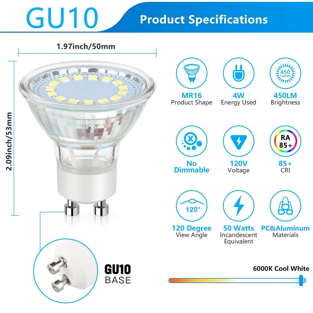 Technical Specifications: Lighting Technology : LED Color Temperature (K) : 6000K Cool White Bulb Type : Household Bulb Shape : MR16 Indoor Light Bulb Base Code : GU10 Wattage (watts) : 4 Light Output (lumens) : 450 High Lumens Watt Equivalence : 50w Color Rendering Index (RA) : 85+ Input Voltage:120VAC Average Life (hours) : 25,000 Dimmable : Non-dimmable Package contents: 5 x LED Light bulbs (6000K Cool White) NOTE: 1. These LED bulbs are not dimmable, please DO NOT use them with dimmer switch. But prevent eye fatigue and provide instant bright light without buzzing or flickering, effectively protect your families' eyesight and health. 2.These lightbulbs can be used in the GU10 base enclosed light fixtures. Ideal for house, hotel, offices, restaurants or any other places! 3.It is a standard MR16 shape which is 1.97*2.09 inches, good shape for commercial lights or any space that needs bright home lighting. Super Bright & High CRI: Build-in the latest LED technology, the MR16 GU10 LED bulb gives off a full 450 lumens of brightness and a stable 6000k daylight glow. Features with more than 85+ CRI and a wide beam angle of 120 degrees, the GU10 bulbs provide you with vivid and natural color performance, ideal for commercial lights or any space that needs bright home lighting. Energy Efficient & Money Saving: Designed with energy-efficient LED chips, 4W GU10 LED bulbs offers you the perfect replacement for traditional 50W halogen bulbs. Based on 3 hours of use per day, the GU10 led bulbs daylight will reduce heat output and save up to 90% on the electric bills of lighting. Note: These LED lights are not dimmable. Flicker-Free & Eye Protection: Meet strict test criteria including flicker, strobe, glare and color rendition, NO UV or IR radiation, non-dimmable GU10 light bulb prevents eye fatigue and provides instant bright light without buzzing or flickering, effectively protects your families’ eyesight and health. Long Lifetime: The 50w GU10 bulb LED has an outstanding long-lasting life which is rated at over 25,000+ hours, last 25 times longer than traditional halogen, incandescent and fluorescent bulbs, largely reducing the frequency of bulb changes while providing the same lighting quality. Easy Installation & Wide Application: Standard MR16 shape with universal GU10/Bi-pin lock base, the track lighting bulbs can be easily screwed into all standard GU10 cans fixtures, no wire needed, Great spotlight bulb for recessed track lighting, range hood, stovetop, living room, laundry room, kitchen, bedroom, bathroom, hallway, entryway, dining room, garden, garage, porch, patio, front porch lighting, office, hotel.