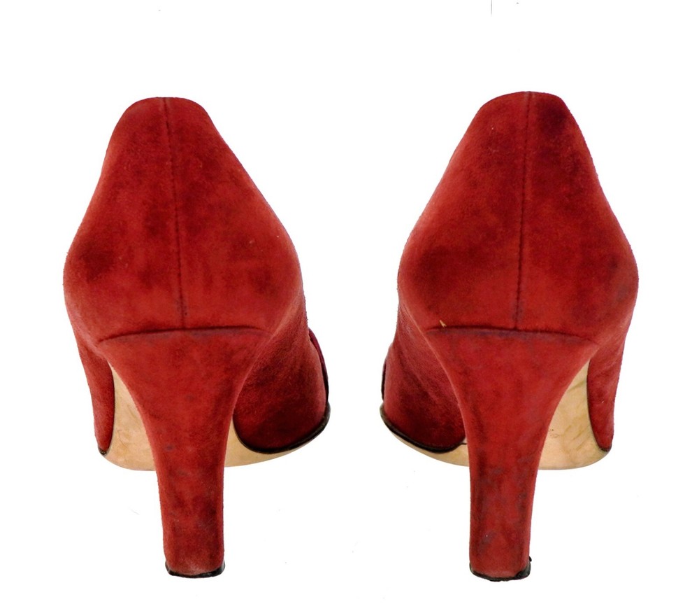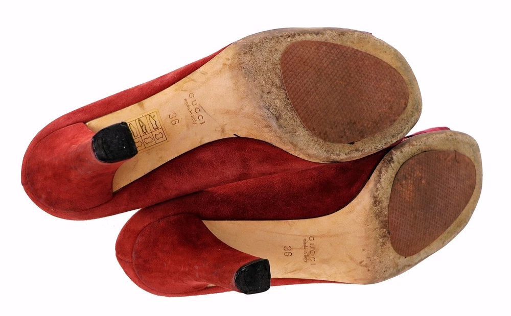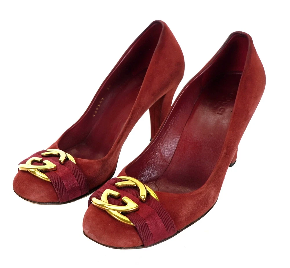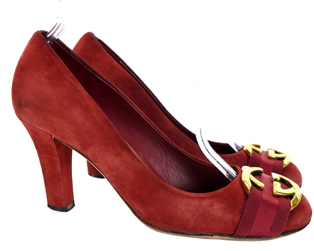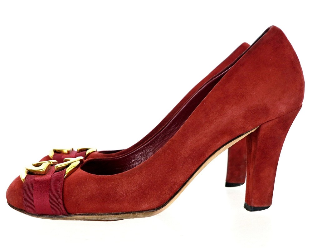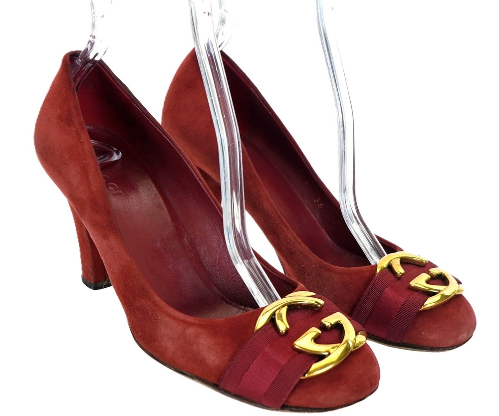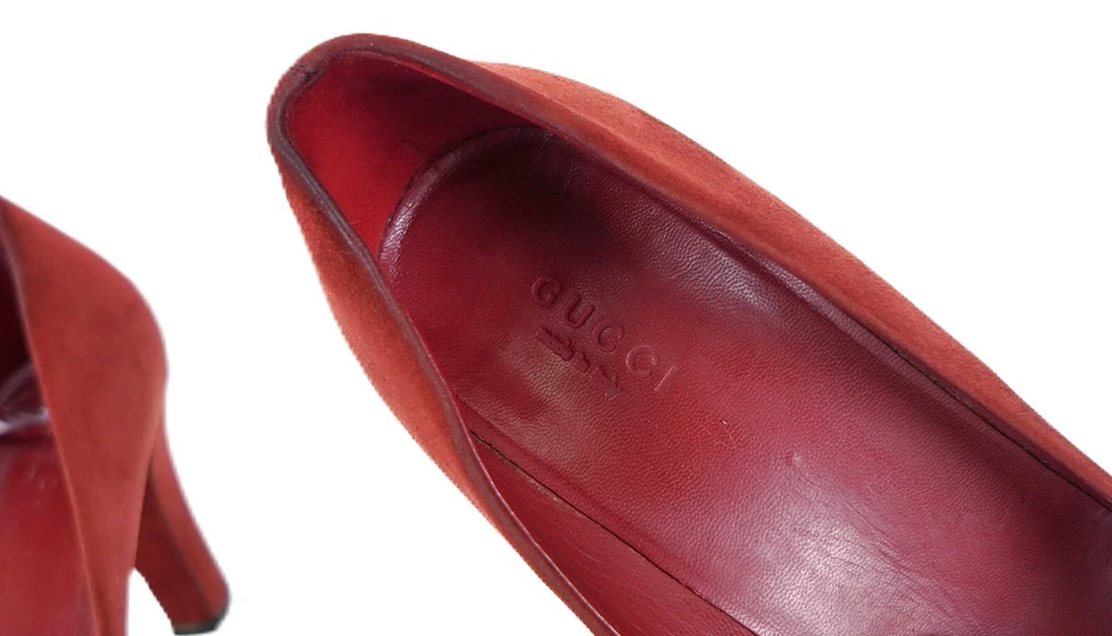 GUCCI Model 225345 Size EU 36 USA 6 - Outsole: 10" Insole: 9.5" Color: Red, Gold Material: Suede Leather Made in Italy Excellent stock#14.11.00
