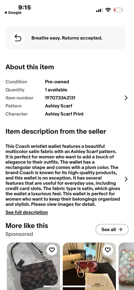 I am absolutely delighted with this purchase and seller. Everything about this transaction was outstanding from our first correspondence to receiving my purchase. The description and pictures were clear and concise. I was concerned about the handbag getting crushed. The packaging was absolutely amazing, extremely creative, and arrived quickly. The handbag was in perfect condition just as described. I was even amazed at how reasonable the shipping cost was. Thank you!