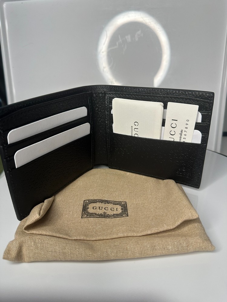 The wallet includes credit 8 card slots and a classic bifold design. comes with box, cards, and dust bag.