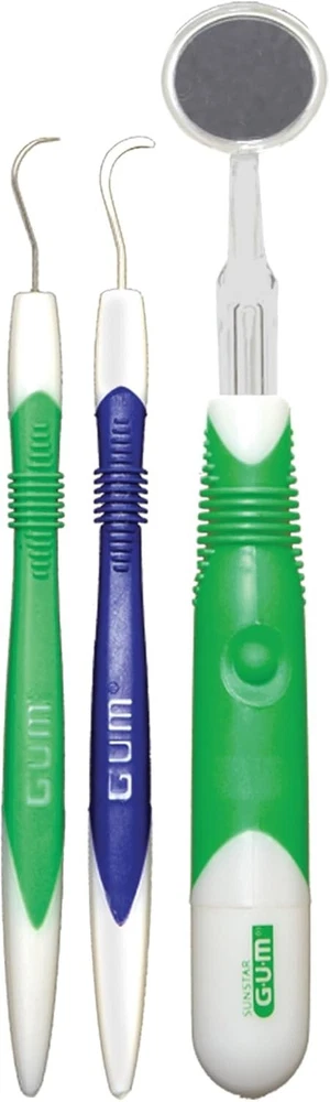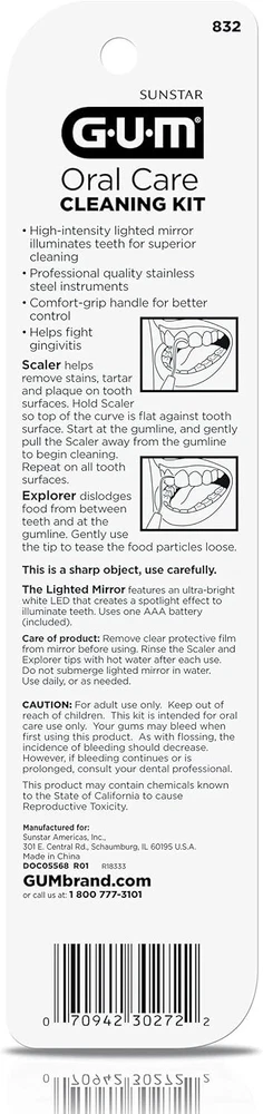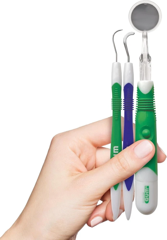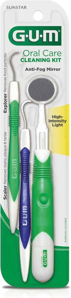 Listing Details: GUM Oral Care Cleaning Kit: 1 - Explorer removes food particles 1 - Scaler remove stains, plaque and tartar 1 - Anti- Frog Mirror with High-Intensity Light professional quality stainless steel instruments helps fight gingivits comfort-grip handle for better control New in original seal and never open
