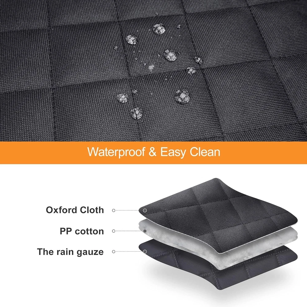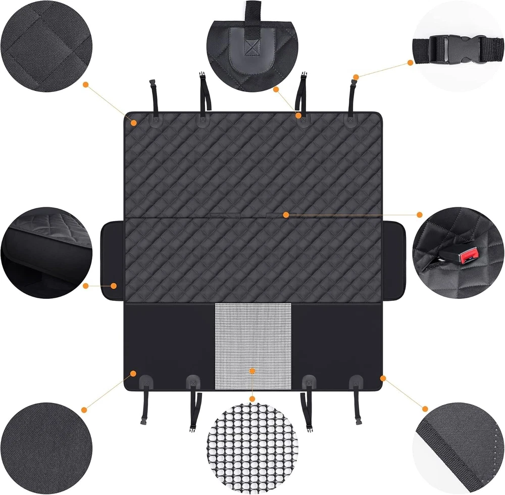[ PREMIUM MESH VISUAL WINDOW ] Exclusive dog car seat cover with car net bring extra view space and safe driving. View mesh divider as a vent helps your pets to get air circulation, and you can see them easily, reducing their anxiety. [ UNIVERSAL SIZE ] -The universal fit (53Wx57L inches) dog seat covers fit most standard cars, SUVs and small trucks. and with a 60-second super EASY and fast installation, you’ll be ready to go with the backseat dog cover for cars in no time! [ Waterproof-Scratchproof & Durable Materials ] Our car seat covers for dogs are crafted with the top layer of heavy-duty 600D oxford and the mid-layer of sturdy 210D oxford canvas padded with soft stuffing to protect your backseat from scratches, fur, and hair to achieve long-lasting use. And the waterproof coating on each layer creates an impenetrable waterproof barrier between your seats and mud. [ Easy To Install & Clean ] - dog car backseat cover is easy to set up or remove for quick in-and-out trips. And it’s easy to clean with a damp cloth, vacuum, . If you have any problems with our pet car seat covers, our professionals are always standing by to help you. Car Seat Cover that let you have a Pleasant Trip with your Dog Dog hair, mud and other things-your dog knows how to destroy a perfect car seat! This car seat cover is the answer to your messy questions. Unique design, suitable for cars, trucks, off-road vehicles and other vehicles. Your pet deserves the best! High-quality dog seat covers make your dog feel as comfortable as sleeping in his kennel cushion. As a driver, you will be less distracted, and your dog will remain comfortable and safe during your trip. Visible Grid Window Dog seat covers with mesh breathing Windows are ideal for allowing air to flow into the back seat to keep your puppy cool. When you travel with your pet, seeing their owner through it will help reduce the puppy's anxiety and make you feel safe. Velcro Opening The seat belt through the Velcro opening to keep your pets safe when your dog is on the cover. Snap Buckles Adjustable headrest straps go around your rear headrests and snap into place with secure buckles. Once headrest straps are installed, gently pull and adjust the straps for a snug fit. Non-Slip Backing Non-slip backing ensure that the seat cover will not slide around and provides comfortable rides.