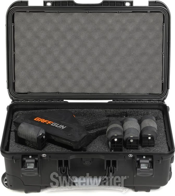 The Ultimate GaffGun Bundle Sweetwater’s A/V and lighting technicians agree: GaffTech’s GaffGun Platinum Bundle is simply a must-have for anyone regularly laying down gaffer’s tape for cable management. Whether you’re working on tour or in-house, or setting up in a professional entertainment venue or an education setting, taping down cables is key to keeping equipment (and everyone around it) safe and secure. Let the GaffGun do the work for you in less than half the time. Simply install a cable guide, slide on a roll of gaffer’s tape, line up the stripes, push, and cut. Moreover, the comprehensive GaffGun Platinum Bundle boasts everything you need to get going right out of the box besides the gaffer’s tape itself, including a GaffGun, a convenient extension handle, four guides for your tape, and a robust hardshell carrying case.Easily adapts to fit your taping needs The GaffGun uses a series of interchangeable cable Sweetwater is an Authorized GaffTech Dealer Genuine New Item Sweetwater's 2-year warranty GaffTech GaffGun Platinum Bundle Floor Tape Dispenser with 4 Cable Guides, 2 Universal Cores, and Extension Handle The Ultimate GaffGun Bundle Sweetwater’s A/V and lighting technicians agree: GaffTech’s GaffGun Platinum Bundle is simply a must-have for anyone regularly laying down gaffer’s tape for cable management. Whether you’re working on tour or in-house, or setting up in a professional entertainment venue or an education setting , taping down cables is key to keeping equipment (and everyone around it) safe and secure. Let the GaffGun do the work for you in less than half the time. Simply install a cable guide, slide on a roll of gaffer’s tape, line up the stripes, push, and cut. Moreover, the comprehensive GaffGun Platinum Bundle boasts everything you need to get going right out of the box besides the gaffer’s tape itself, including a GaffGun, a convenient extension handle, four guides for your tape, and a robust hardshell carrying case. Easily adapts to fit your taping needs The GaffGun uses a series of interchangeable cable guides that gather your cables as you tape them down, eliminating the need for tape anchors and a second pair of hands to straighten them out. The small guide is ideal for working with up to two standard mic or other similarly sized cables. If you're taping down three or four mic cables or a mix of cables with different gauges, the medium-size cable guide is your choice. And the large guide handles up to six mic cables, larger-sized power cables, VGA cables, or a combination of cable types and sizes. When you need to tape off sections of a room or apply double-sided tape to event carpeting, the convenient floor guide helps you create clean, straight tape lines to keep the space organized and safe. Easy-to-install, convenient extension handle The GaffGun has a short handle integrated into its base and comes with a long extension handle to make using it that much easier. Simply screw the handle into place and adjust it to a level that's comfortable for you. When you're done, the extension handle removes for easy transporting and storage. Heavy-duty hardshell carrying case Need a place to store your GaffGun accessories? The GaffGun Platinum Bundle comes complete with a durable hardshell case with plenty of room for all four attachments, the extension rod, and the GaffGun itself. This case is all but essential for the professional who uses the GaffGun on a regular basis, as it not only keeps your GaffGun safe during transport, but also greatly reduces the chances of losing or misplacing an attachment while working on location. GaffTech GaffGun Platinum Bundle Features: Floor tape dispenser that dramatically simplifies the job of laying down gaffer’s tape and securing cables Requires no downward pressure and lays cables down over extension cords, hoses, rope, and flat surfaces Bundle includes a GaffGunn, an extension handle, four GaffGunn guides (Small, Medium, Large, and the FloorGuide for flat surfaces), and a robust carrying case Bundle does not include gaffer’s tape Specification Detail Type GaffGun, Platinum Bundle RETURN INFORMATION We want you to be completely happy with your purchase from Sweetwater. If you are not satisfied with your product, you may return it for a refund of the purchase price within 30 days. If your purchase was eligible for Free Shipping, the shipping cost will be deducted from your credit or refund. Returns must be in the complete and original packaging with all accessories and complete documentation (Owner's Manual, warranty card, quick start guides, etc.), show no signs of wear or use, and include a Return Authorization number or be subject to a restocking fee.