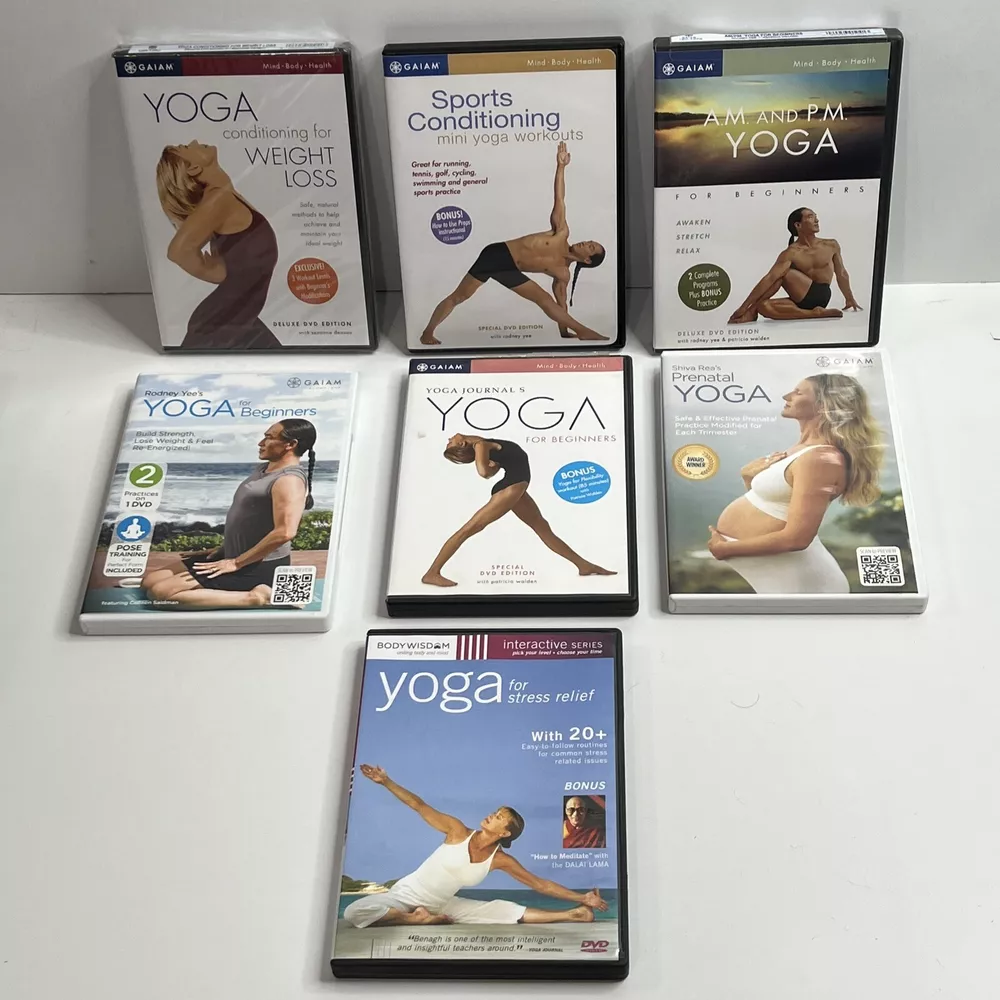 Gaiam Yoga Workout DVDs Body Wisdom Rodney Yee Mind Body Health Lot of 7. Light case wear with all discs in very good condition and 1 brand new sealed. Shipped USPS media mail.