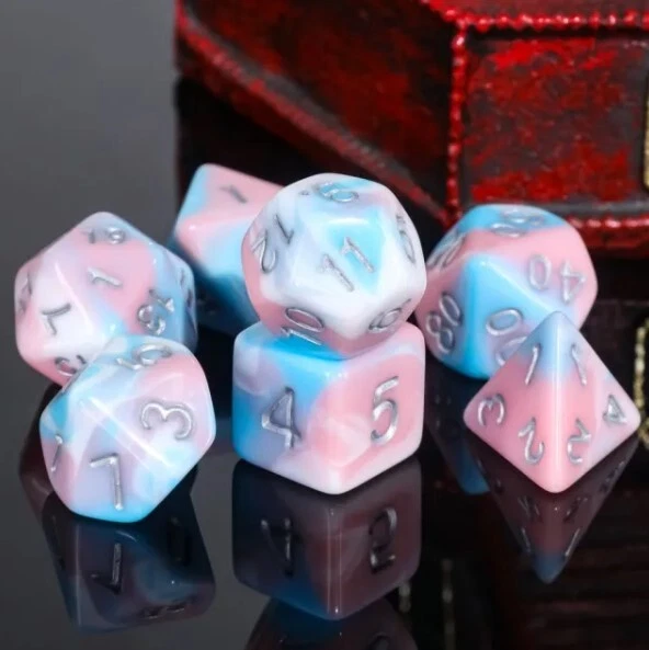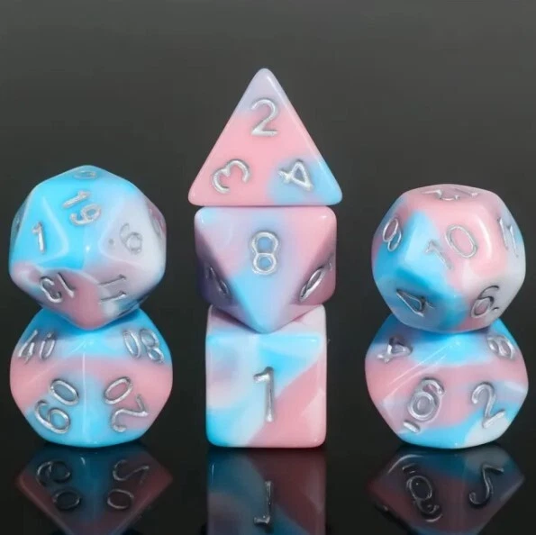 Galactic Toys Our eBay Store Follow my store! Galactic Dice Premium Dice Sets - Cotton Candy (Pink, Blue & Silver) Acrylic Set of 7 Dice The perfect companion for your gaming needs! These HD acrylic dice are exactly what you've been searching for that upcoming game night with the group. This set includes one of each: d20, d12, d10, d10 (percentile), d8, d6, and a d4 (7 dice in total) in a Product Details Width 0.500 Height 3.500 Length 2.500 Manufacturer # HDB-103 UPC 656089809326 Shipping & Order Information All items ship within 1 business day and ship using DHL Global Mail, USPS, or UPS Ground. The DHL service uses the United States Postal Service (USPS) to deliver packages. All items will be packaged with care and use proper padding and packing. International Shipping We ship international orders with tracking using DHL global mail. On orders above 40 USD we will upgrade to a faster DHL delivery service. Customers are responsible for duties and taxes in their country. We can't modify shipment values for custom purposes. Return Guidelines Please always contact us before making a return. Returns must be sent back to us using the same shipping format, protective packaging, original condition you received your item and include a tracking number. On orders that are unwanted, a 20% restock fee will apply. If you had FREE Shipping the original shipping cost will be deducted from your refund. Allow up to 3 Business Days for processing once we receive your return before being issued a refund. If a Return is being made from a mistake on our end contact us for individual instructions**