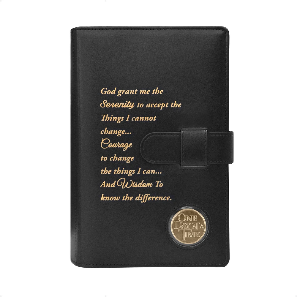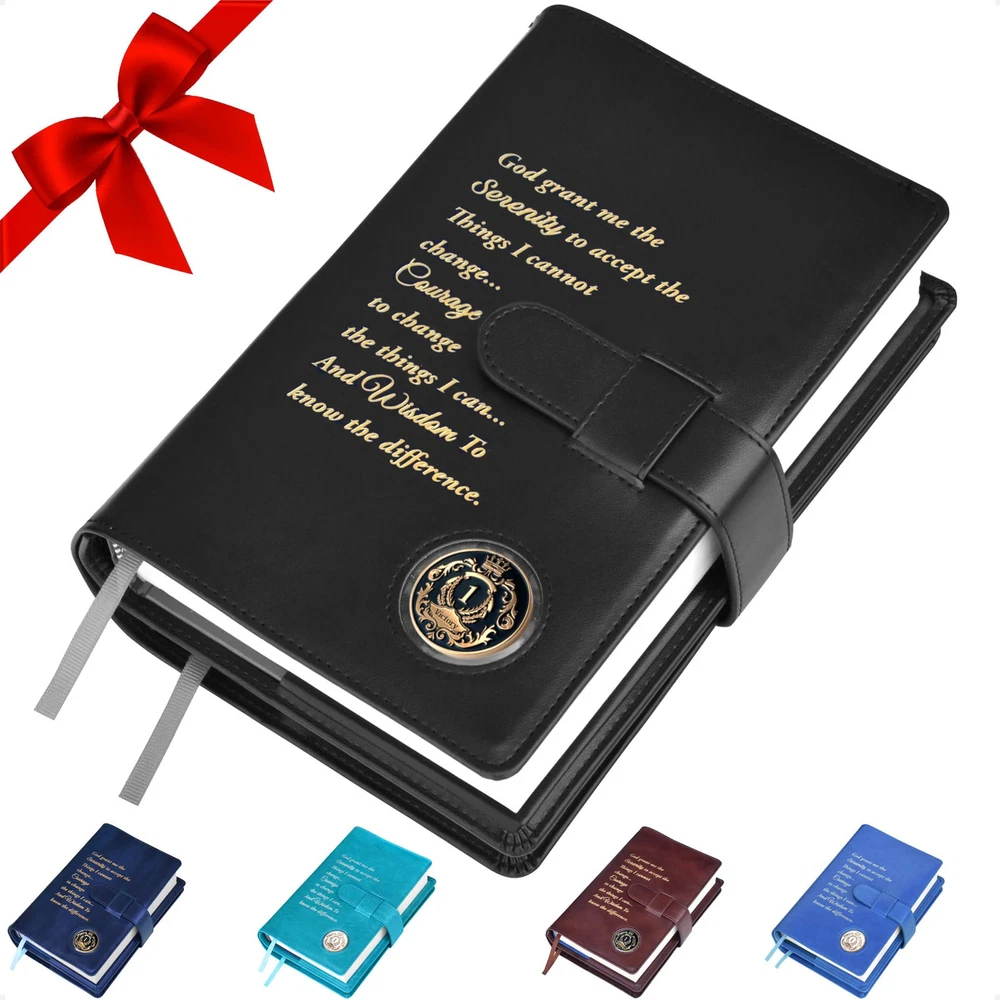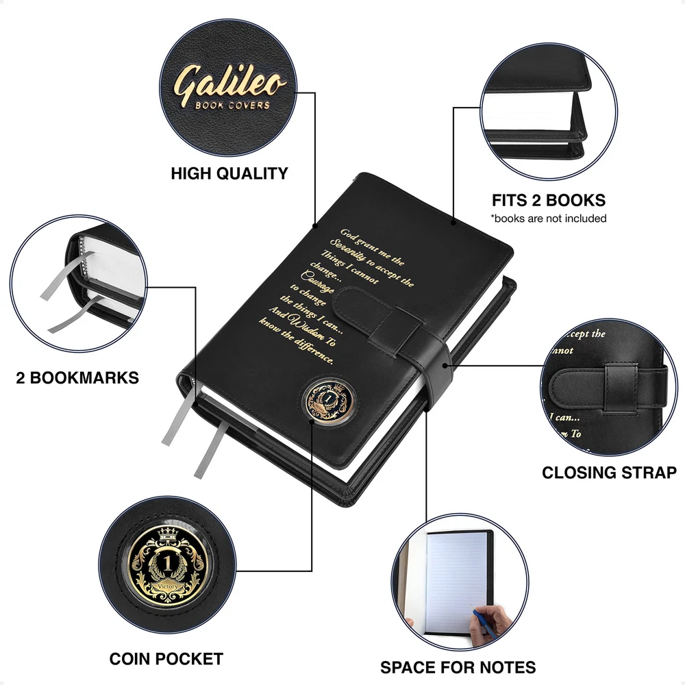 ✅ FITS 2 HARDCOVER BOOKS – AA Big Book (5.5”x8.5”x1.5”) and 12 Steps & 12 Traditions (5.5”8.5”x0.75”) | Keeps both books together which makes it easier to use them on daily basis | BOOKS ARE NOT INCLUDED, shown on photos only for display purposes ✅ HIGH QUALITY COVER - Made from 2-layer thick, durable PU leather with exceptional craftsmanship (not genuine leather) | Beautifully embossed gold Serenity Prayer, unique and durable | Includes 2 bookmarks | Simple and elegant design – Refined feeling ✅ GIVES PRIVACY - Has a strap to keep the cover closed | Keeps your books confidential and protect your anonymity so that you can read them in public ✅ PERFECT GIFT - for a sponsor, sponsee, family member or friend ✅ MEDALLION HOLDER – Allows to display your medallion to make you proud and to keep track of your accomplishments | Product is Patent Pending | Satisfaction Guaranteed