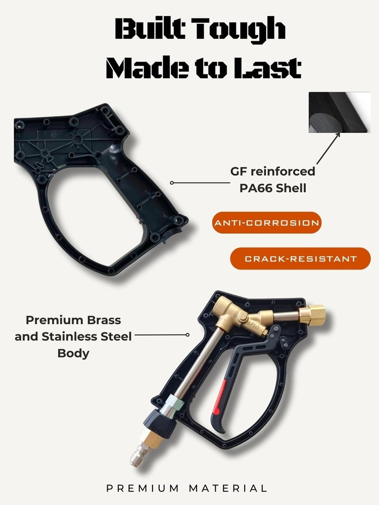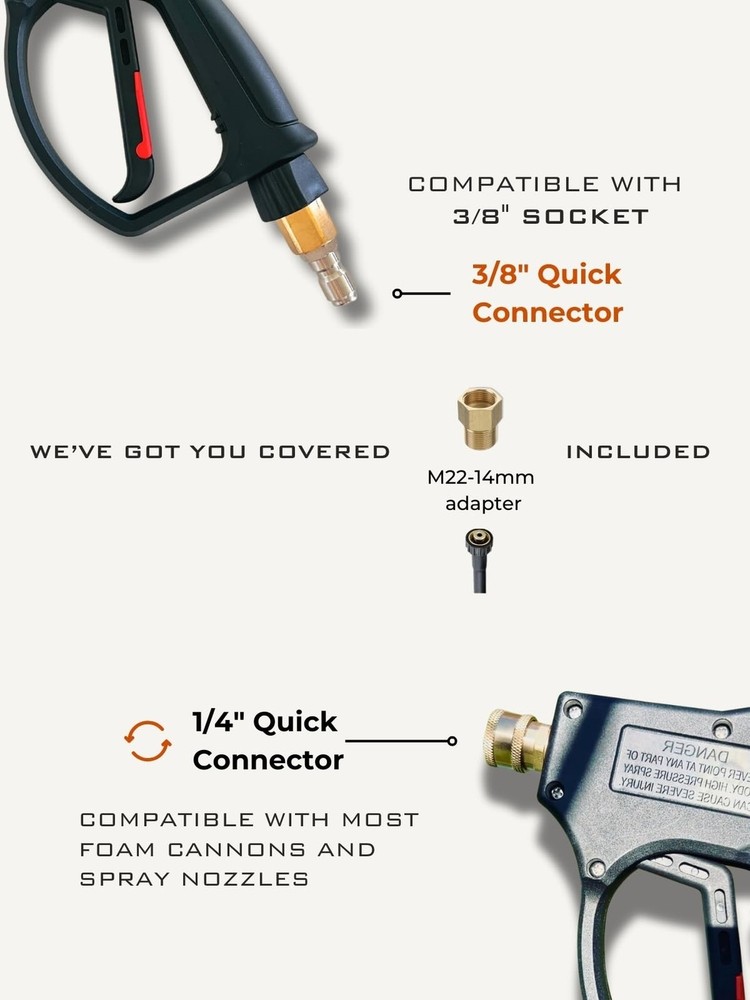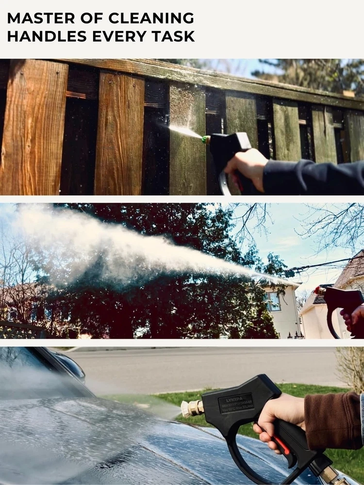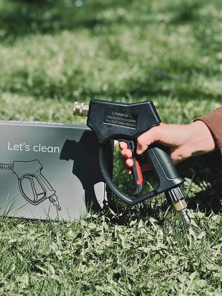 Gallant Pa Short Swivel Pressure Washer Gun, 5000 PSI, 8 GPM, 1/4" Quick Connector Outlet, 3/8" Quick Connector and M22-14mm Inlet, for Gas & Electric Pressure Washers, Foam Cannon Car Wash Product Details Material: Stainless Steel, Brass Brand: LYNXPA Item dimensions L x W x H: 11 x 6.5 x 1.9 inches Exterior Finish: Stainless Steel or Brass Inlet Connection Type: National Pipe Tapered Outlet Connection Type: Quick Connector Maximum Operating Pressure: 5E+3 Pound per Square Inch Number of Ports: 1 Outlet Connection Size: 0.38 Inches Manufacturer: LYNXPA Material: Stainless Steel, Brass Brand: LYNXPA Item dimensions L x W x H: 11 x 6.5 x 1.9 inches Exterior Finish: Stainless Steel or Brass Inlet Connection Type: National Pipe Tapered Outlet Connection Type: Quick Connector Maximum Operating Pressure: 5E+3 Pound per Square Inch Number of Ports: 1 Outlet Connection Size: 0.38 Inches Manufacturer: LYNXPA UPC: 749565650502 Part Number: LYN-5000-Swivel-PWG-S Item Weight: 2.05 pounds Product Dimensions: 11 x 6.5 x 1.9 inches Country of Origin: China Item model number: LYN-5000-Swivel-PWG-S Color: Black Power Source: Electric & Gas Flow Rate: 8 Gallons Per Minute Batteries Included?: No Batteries Required?: No Date First Available: February 28, 2024 Superior Performance: With a maximum working pressure of 5000 PSI at 8 GPM, Gallant Pa delivers exceptional cleaning results for professionals and homeowners. Built to Last: Crafted from premium stainless steel and brass, Gallant Pa ensures durability and crack resistance. Its shockproof reinforced plastic ribbing provides robust protection. A quality-made tool can change the game. 360 Swivel, Effortless Maneuverability: Effortlessly maneuver with a 360-degree swivel design and a 3/8" brass connector inlet, preventing hose kinks and offering precise reach for thorough cleaning. Quick Setup, Ultimate Compatibility: Effortlessly attach Gallant Pa to foam cannons, nozzle tips, etc. with a 1/4" quick connector outlet. Compatible with both gas and electric pressure washers, Gallant PA is your go-to solution for all cleaning tasks. We've got you covered with an adapter to M22-14mm fitting. What's Included: One 5000 PSI pressure washer gun, one M22-14mm adapter. Upgrade your cleaning routine today with Gallant Pa!
