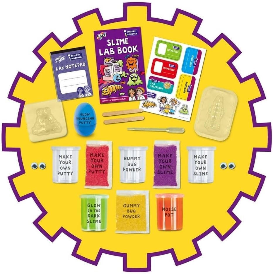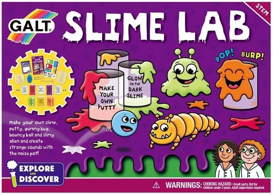Galt Toys, Slime Lab, Science Kits for Kids, Ages 5+, Multicolor Product Details Product Dimensions: 12.2 x 2.76 x 8.66 inches Item Weight: 13 ounces Country of Origin: Taiwan Item model number: 1004870 Manufacturer recommended age: 5 - 10 years Is Discontinued By Manufacturer: No Release date: November 9, 2018 Manufacturer: GALT The explore and discover slime lab encourages early STEM learning and scientific thinking in kids while having fun Experiment with creating your own glow-in-the-dark slimy Alien, bouncy putty ball and gummy bug Slime lab includes a 16-page full color Lab book with 7 fun experiments Contains glow slime, noise pot, glow bouncing putty, make your own slime and putty powder, make your own gummy bug powder, Alien and bug mold, wiggly eyes, stickers, notepad and more Kit is for ages 5 and up, Adult supervision is required Create your own glow-in-the-dark slimy alien, bouncy putty ball and gummy bug! Test the different slimes, make your own tubs of goo and try out the funny noise pot! The Ultimate's making kit! includes 7 fun experiments.