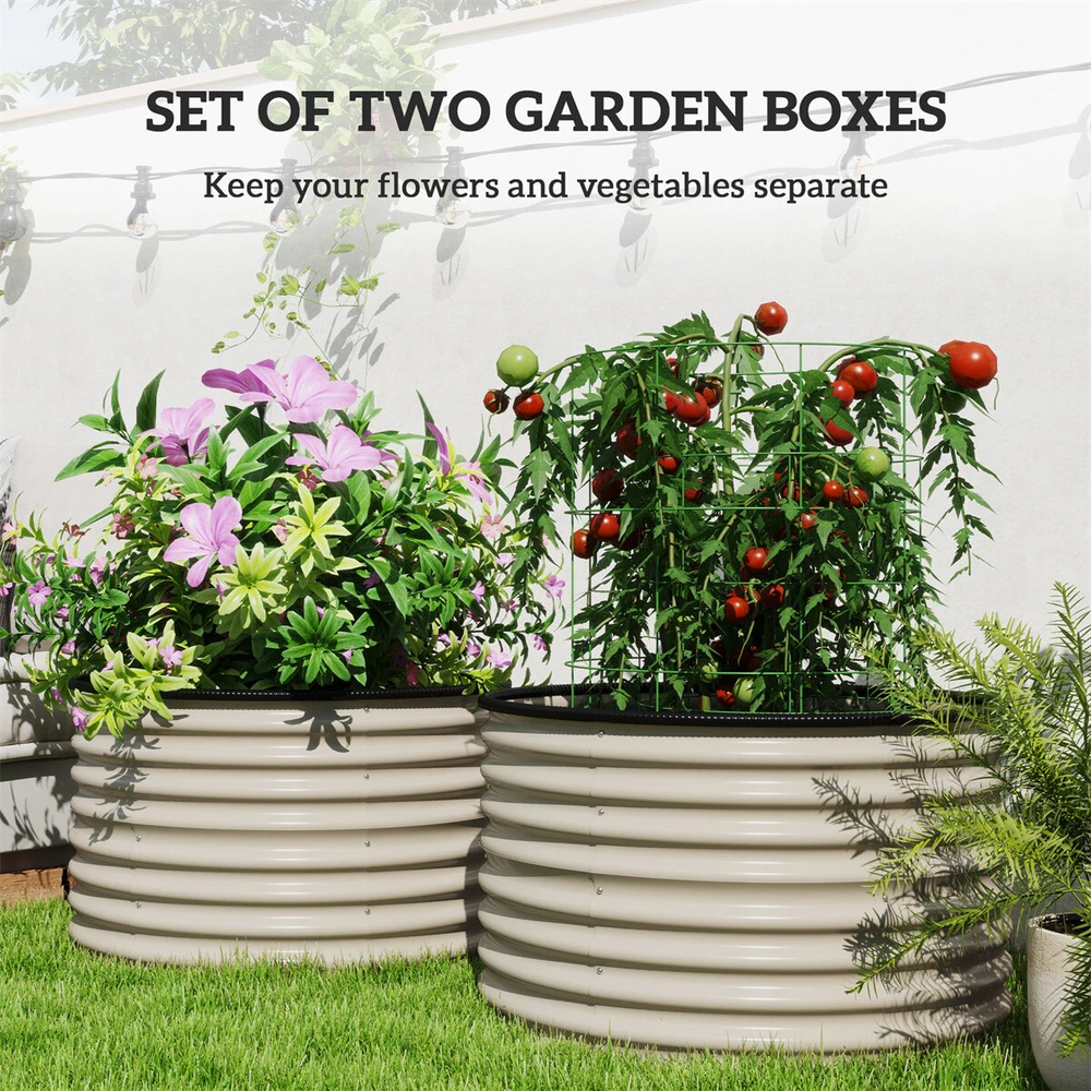 Features: - Set of two raised garden beds - Open bottoms allow drainage while accommodating roots - Made of thick galvanized steel to outlast outdoor conditions without issue - The improved rubber-sealed tops make them safe to all around - An easy-to-assemble design gets your garden up and going fast Specification: - Color: Cream White - Material: Galvanized Steel - Overall Dimensions: 35.4" Dia. x 22" H - Interior Dimensions: 35" Dia. x 22" H - Single Curved Panels: 20.5" W x 11.75" H Package Includes: - 2 x Galvanized Planter - 16 x Screw - 1 x Manual