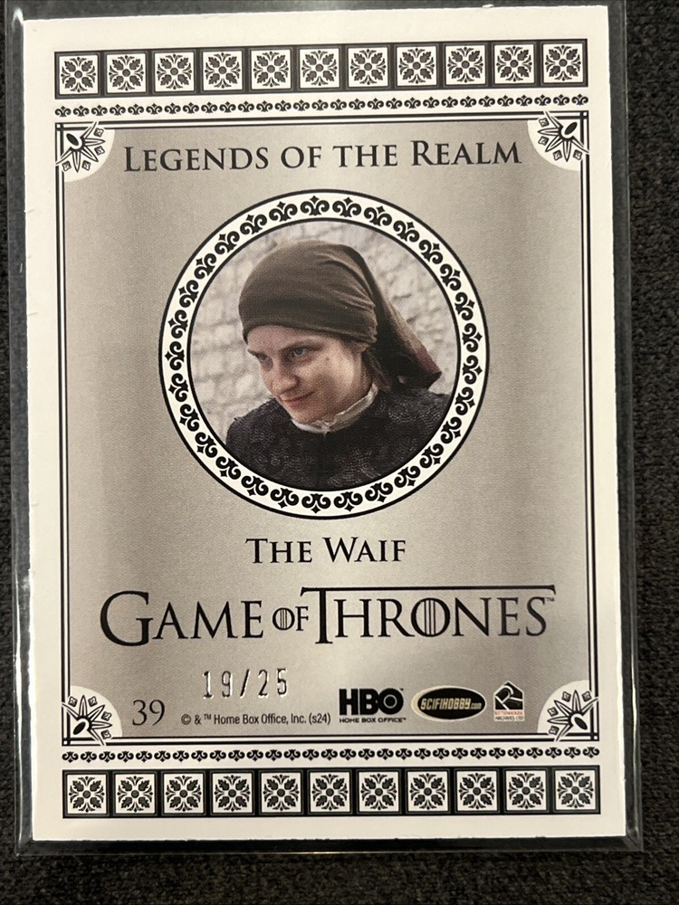 Explore the realm of Westeros with the Game of Thrones: Legends of the Realm Opal Parallel #39 card, featuring the enigmatic character The Waif. This limited edition collectible, serial numbered 19/25, is a must-have for fans of the epic TV show. Rittenhouse has once again delivered a stunning piece of memorabilia that captures the essence of the beloved series. Crafted from high-quality card stock, this non-sport trading card is part of a set that showcases the intricate universe of Game of Thrones. The card is presented in English and originates from the United States, ensuring its authenticity. Faye Marsay, the talented actress who brought The Waif to life, is further immortalized in this exquisite collector's item, making it a standout addition to any Game of Thrones collection.