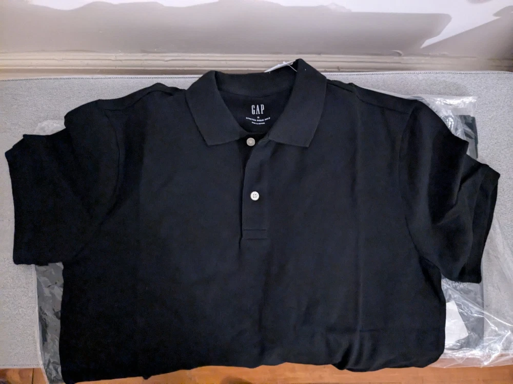 New with tags. Elevate your wardrobe with this stylish Gap polo shirt in true black. The button neck collar and stretch feature add a touch of sophistication to this versatile piece, perfect for travel, casual outings, or business meetings. Made with moisture-wicking technology, this polo shirt keeps you comfortable and dry throughout the day. The size M fits regular men's sizes and is suitable for any occasion. The brand Gap is known for its quality and style, making this polo shirt a great addition to your collection.