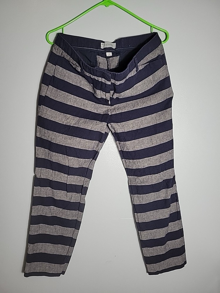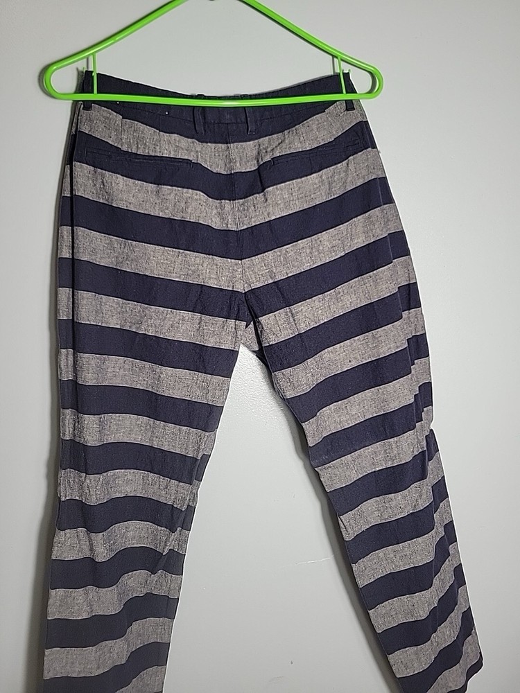 Elevate your casual wardrobe with these stylish Gap women's pants. The blue and gray striped pattern adds a touch of sophistication, while the zip closure and flat front provide a modern look. These pants are made of a comfortable linen/cotton mix fabric and have a mid-rise fit with a tapered leg style. The slimming feature and cropped style make them perfect for a casual occasion, and the waist size of 26 inches and inseam of 27 inches ensure a great fit for size 8 women. Don't miss out on the chance to add these versatile pants to your wardrobe.