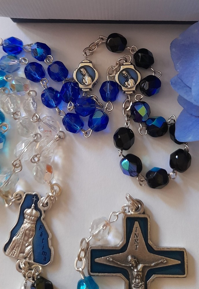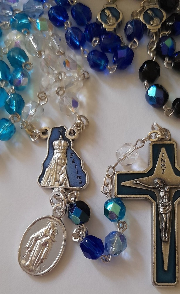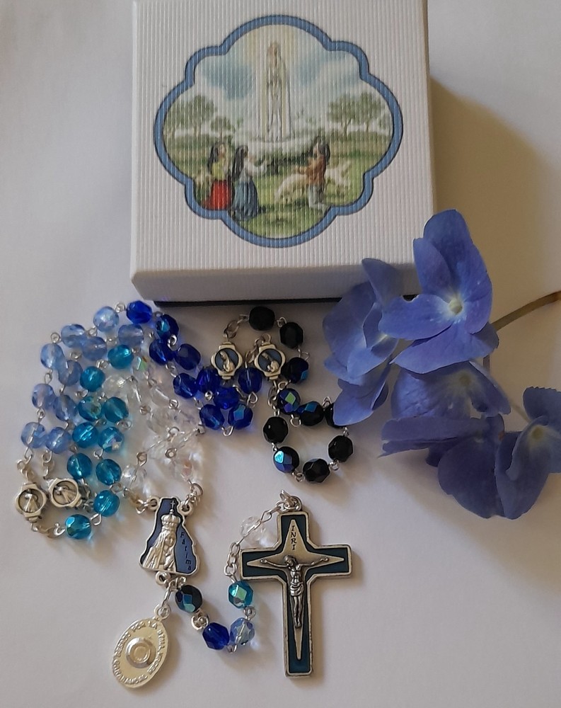 This stunning rosary is a true treasure! The craftsmanship is exquisite, with its silver crucifix, vibrant blue enamel, and multicolored crystal beads. The two-sided centerpiece adds a unique touch, and the included reliquary medal makes it even more special. The commemorative box honoring Our Lady of Fatima’s 100-year anniversary is a beautiful bonus. Perfect for prayer and devotion, it feels sacred and well-made. Highly recommend for anyone seeking a meaningful, high-quality rosary!