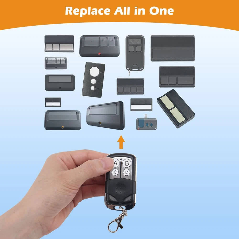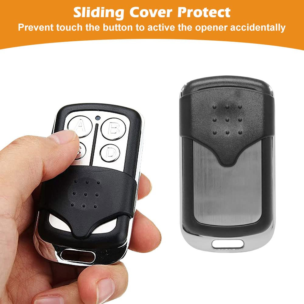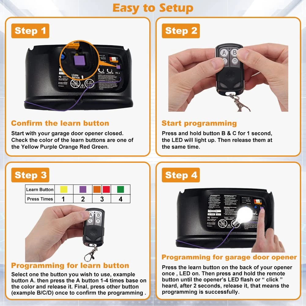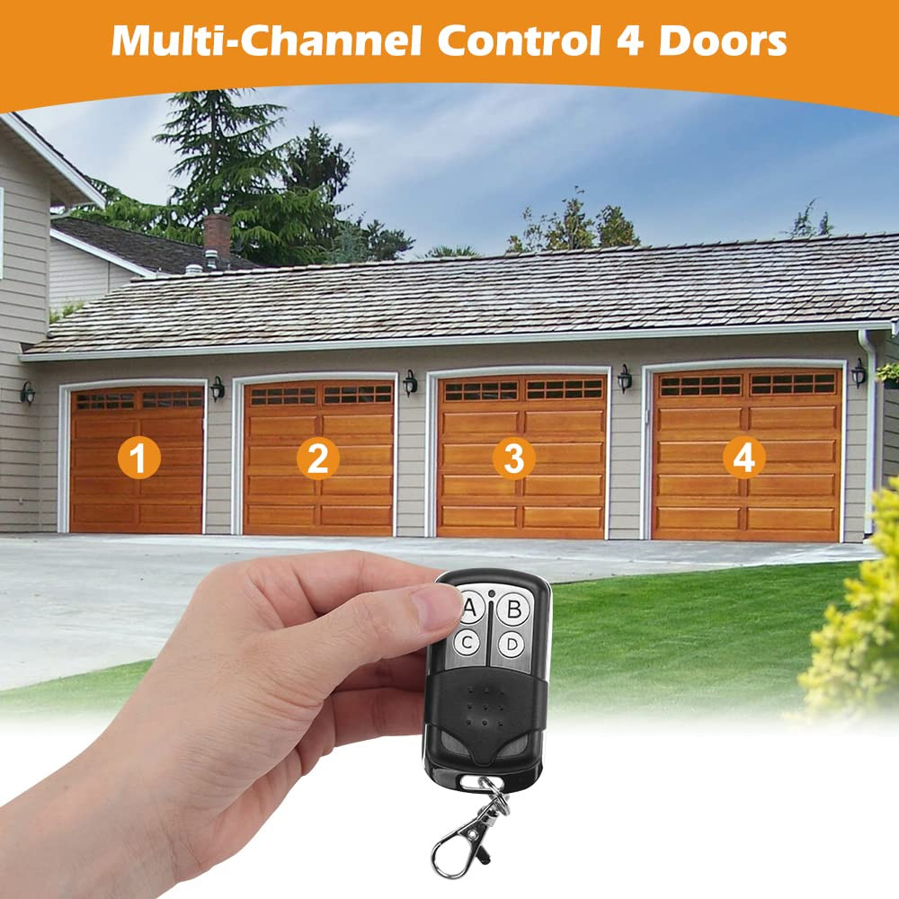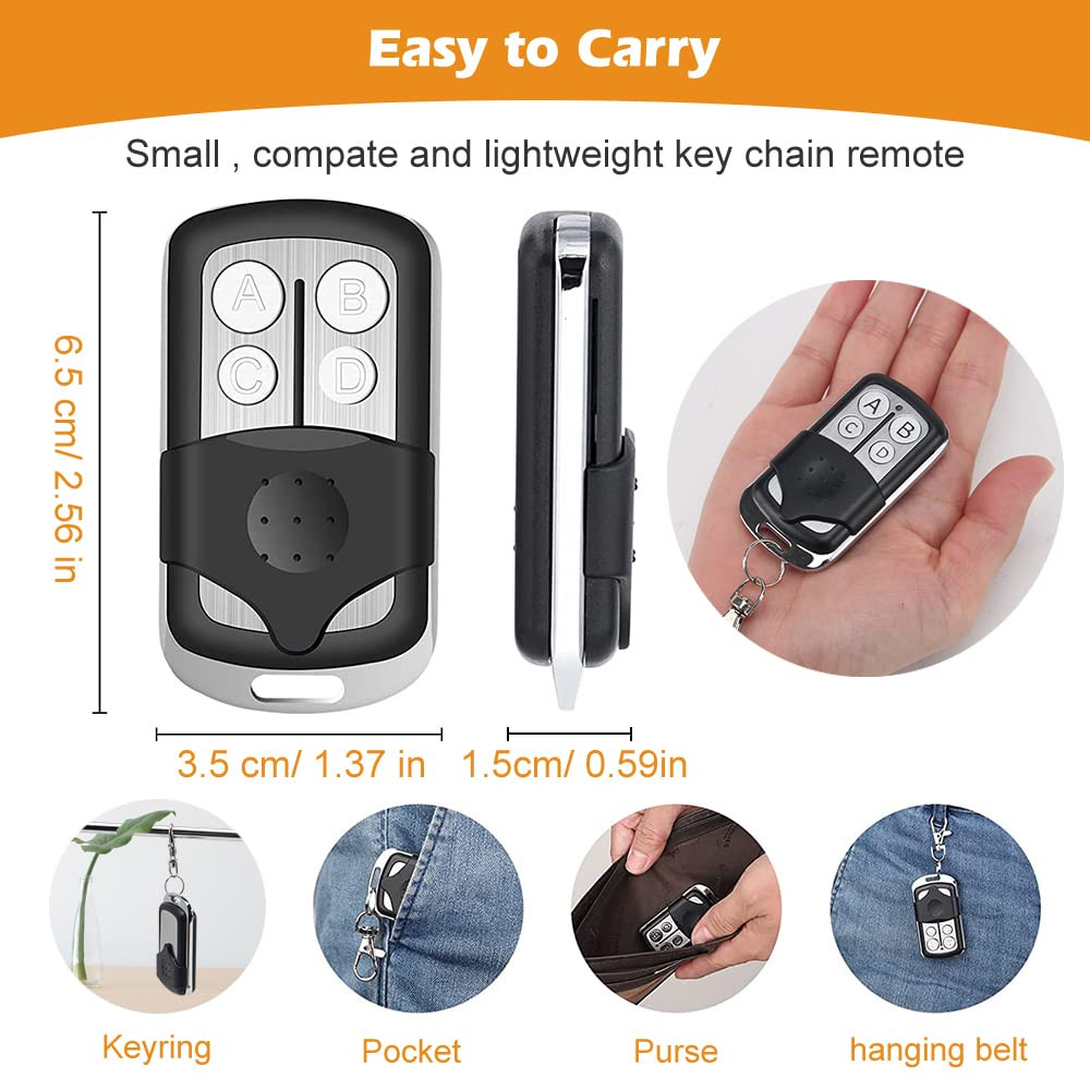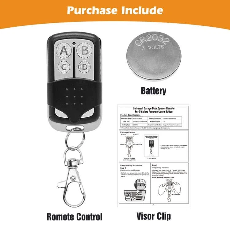【Universal Compatibility】The universal garage door opener remote is compatible with LiftMaster Chamberlain Craftsman. True Value opener has Yellow/Purple/Orange/Red/Green. CAN’T work with dip switch. 【Safe & Reliable】The garage door opener remote replacement adopt the high level of encryption security+ 2.0 rolling code technology, works with frequency 310/315/390MHz, prevents others from invading your home. 【Multi-Channel Control 4 Doors】The keychain garage door remote has 4 buttons allow to control 4 garage door openers respectively, save your trouble of carrying multiple remotes. 【Easy to Program】The user instruction steps are simple and clearly. Program the universal garage door opener remote through the learn button of your door opener in a few minutes. 【1 To 1 Service】24h online service, any questions just feel free to contact with us by email first(). 1 year free-worry warranty.