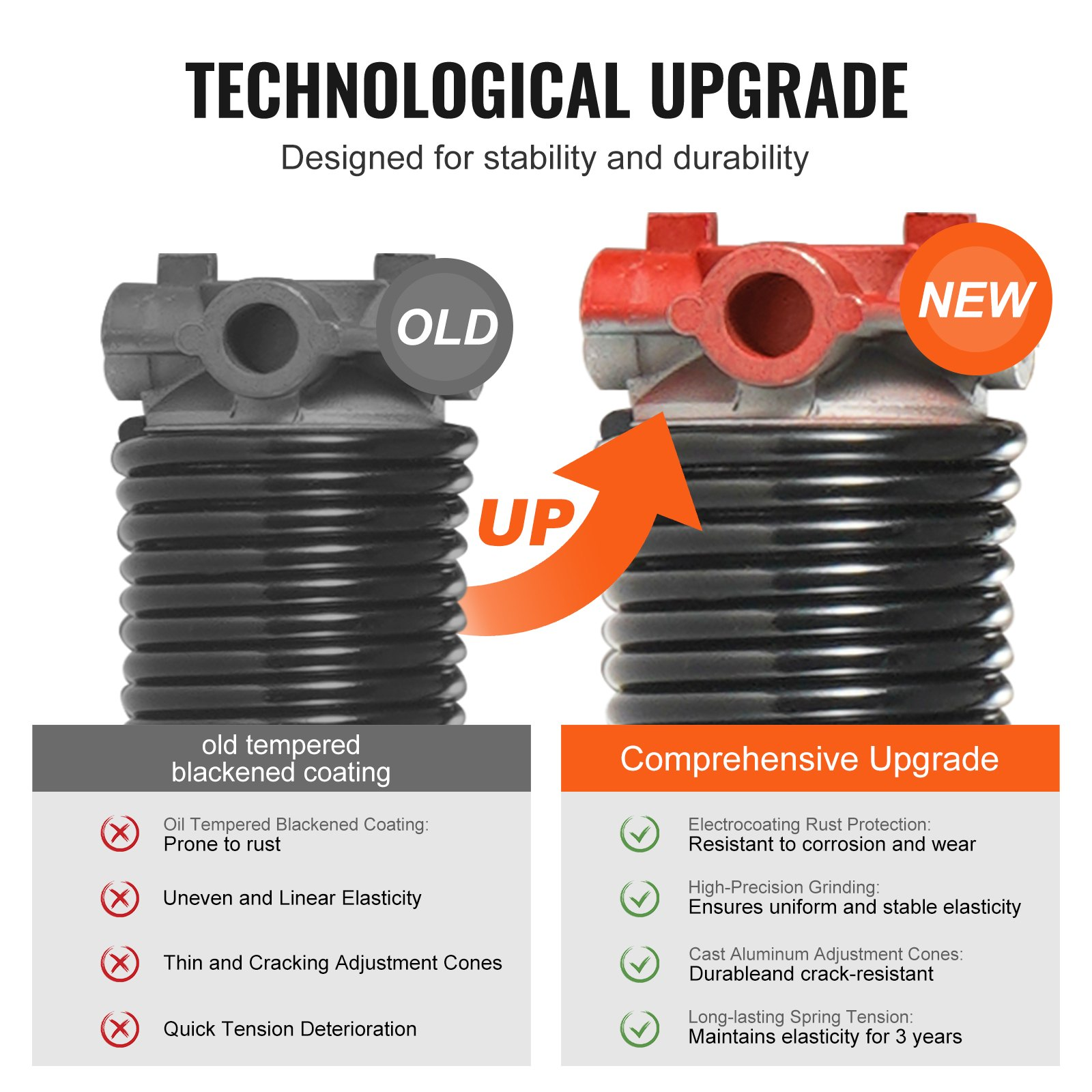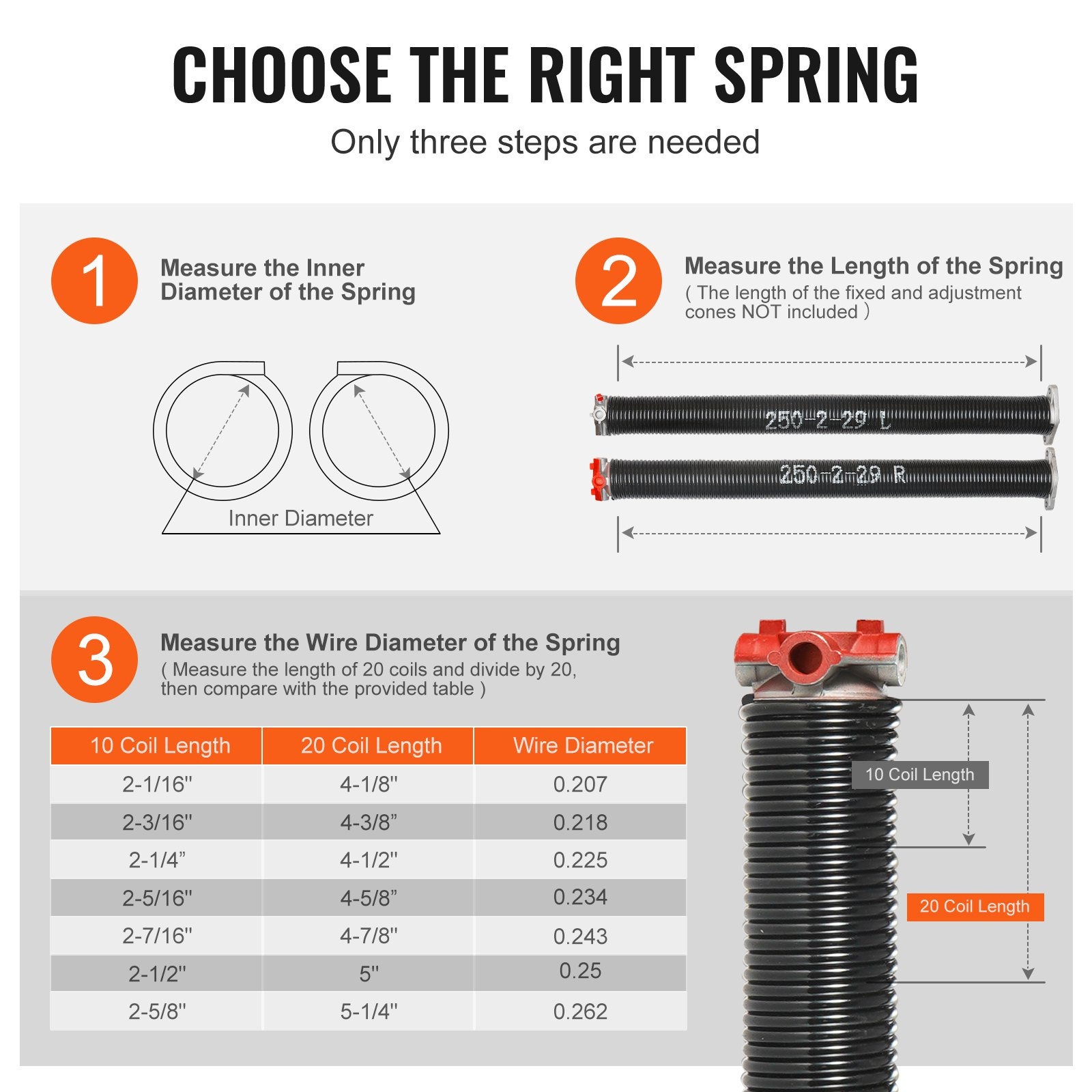 Garage Door Torsion Springs - Pair of 0.25 x 2 x 29 inch, Non-Slip Winding Bars, 16000 Cycles, Includes Gloves & Mounting Wrench, Electrophoresis Coated for Long-lasting Performance VEVOR Garage Door Torsion Springs - Your Ultimate Solution for Durable and Efficient Garage Door Functionality. This pair of high-performance torsion springs is the perfect replacement for your garage door, ensuring smooth and reliable operation. Precision Engineering for Performance: Expertly crafted from high carbon steel 82B and cast aluminum ADC12 for superior strength and durability. Upgraded and Improved Technology: Electrophoresis coating enhances resistance to corrosion and wear, extending the life of the springs. Durable Beyond Compare: Designed to withstand approximately 16,000 cycles (opening + closing), ensuring long-lasting performance. Quick & Hassle-Free: Includes non-slip winding bars, gloves, and a mounting wrench for easy and safe installation. Safety First: Carefully designed with safety in mind; the electrophoretic coating adds an extra layer of protection and longevity. Product Specifications: Spring Size (Wire Dia. x Inner Dia. x Length): 0.25 x 2 x 29 inch / Φ6.35 x Φ50.8 x 736.6 mm Service Life: Approximately 16,000 Cycles (opening + closing) Net Weight (Including Accessories): 25.79 lbs / 11.7 kg Rotation: 1 x Dextrorotary + 1 x Levorotary Upgrade your garage door system today with VEVOR's premium torsion springs, offering unmatched durability and seamless performance. Perfect for residential and commercial garage doors, these springs handle heavy-duty use with ease. Order now and experience a smoother, safer garage door operation!